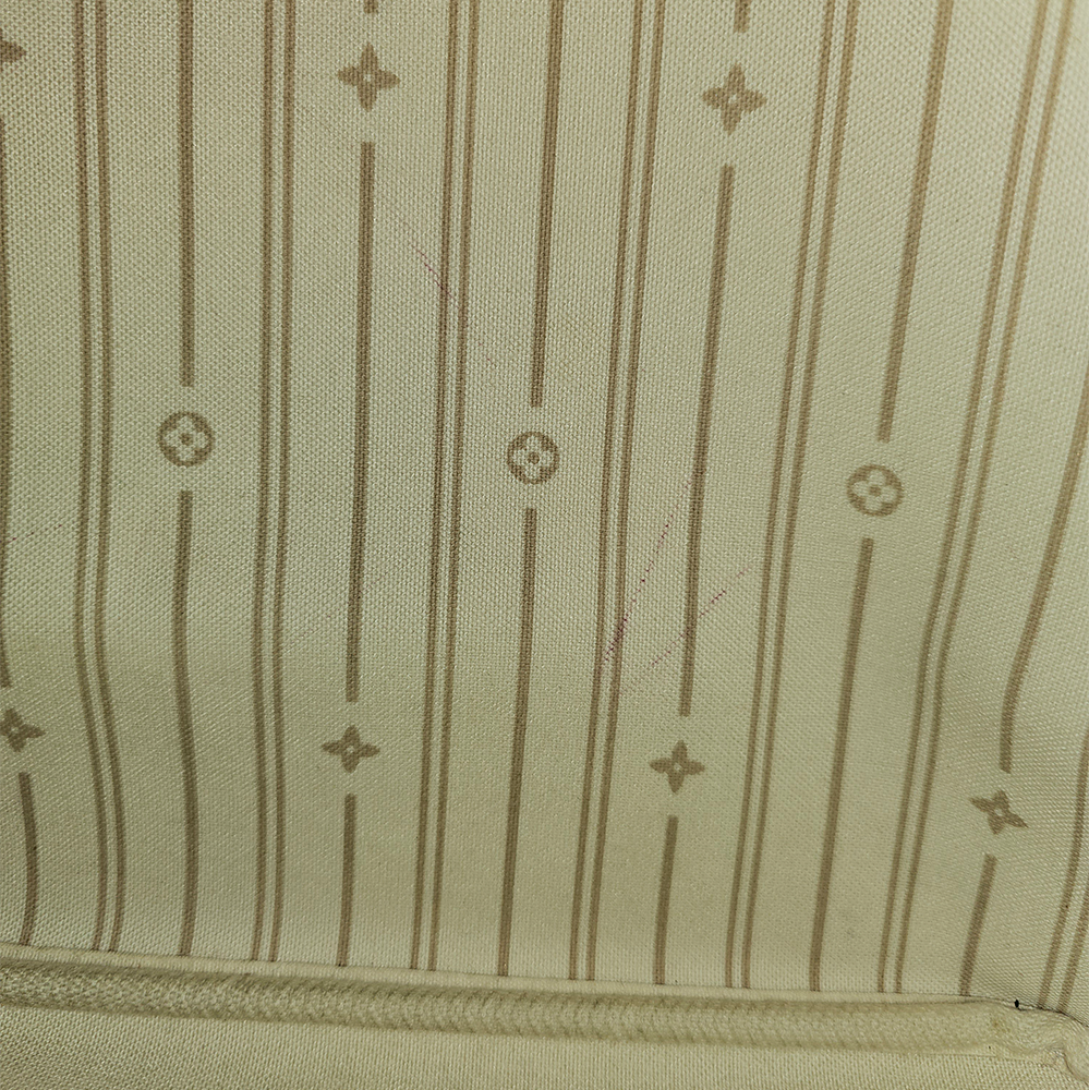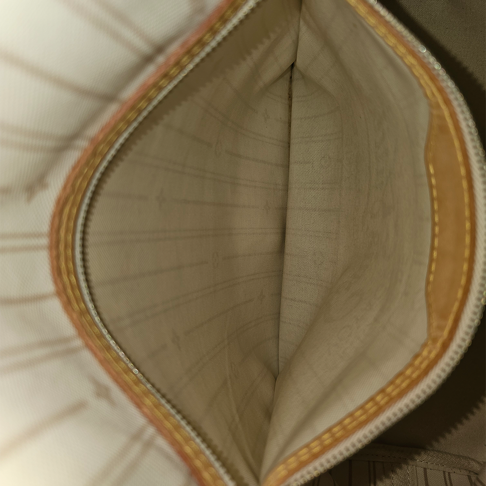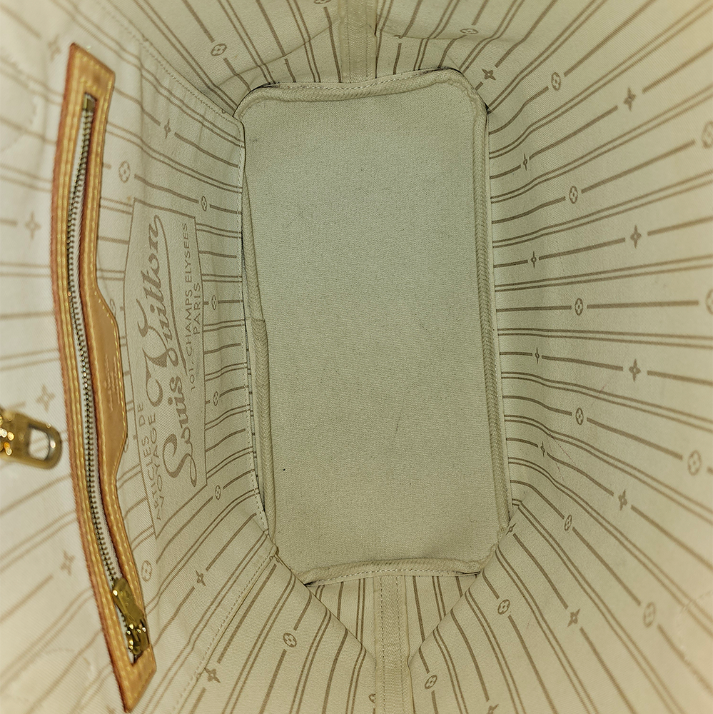 Louis Vuitton Neverfull tote findes i 3 størrelser. PM, MM og GM. Denne taske er en MM, og altså midterbarnet i familien. Neverfull kombinerer både mode og funktionalitet og med sit klassiske design og rummelige kapacitet er Neverfull perfekt til både skolen, kontoret, shoppeturen eller hverdagen. Den rummer alle dine hverdagsnødvendigheder og samtidig kan den nemt indeholde computer og bøger til skolen eller bleer og ekstra tøj til babyen. Den er fremstillet af Louis Vuittons ikoniske Damier Azur canvas med Vachetta læderrem og detaljer. Tasken har et stort rummeligt hovedrum som bliver lukket med karabinhage. Derudover findes en indvendig lynlåslomme. Brug den med snørebåndene trukket ind i siden og få et mere slankt udtryk eller løsn dem for et afslappet look.