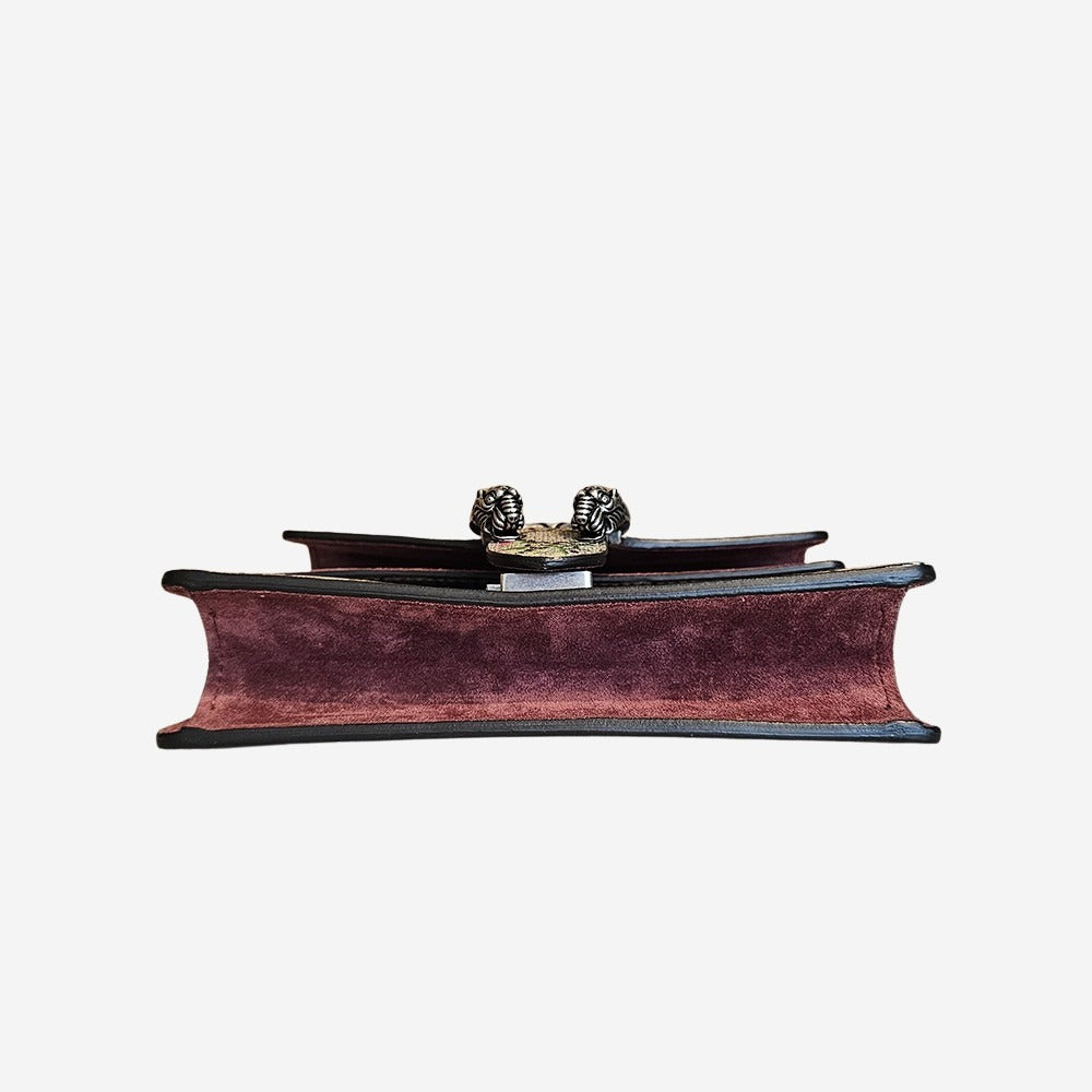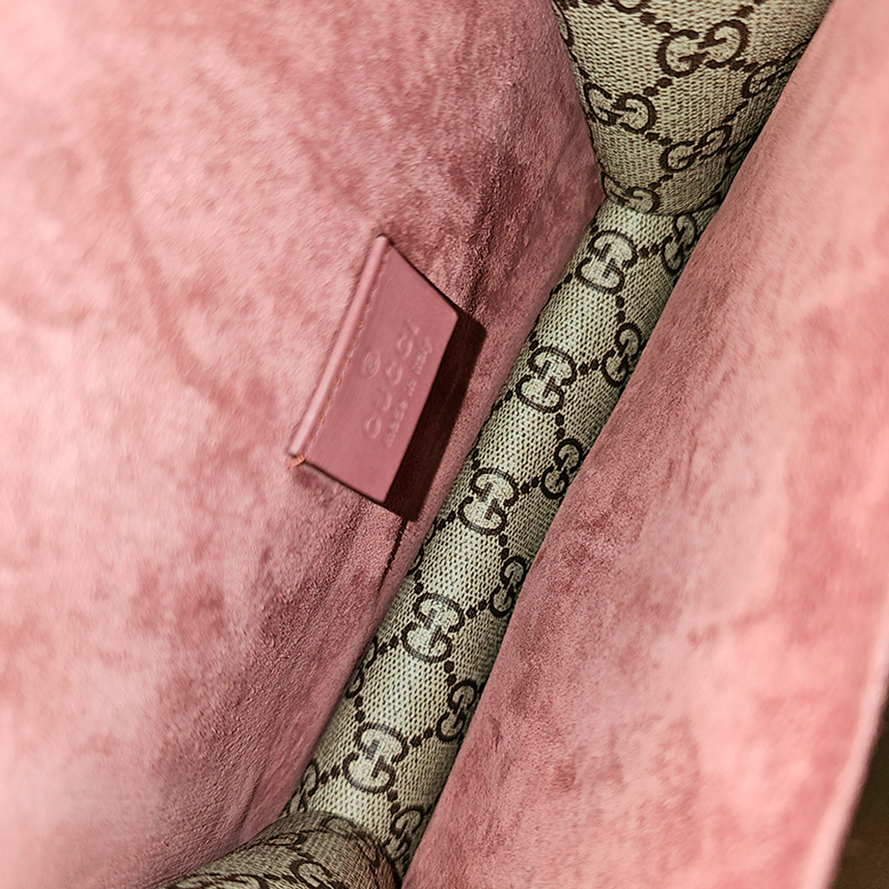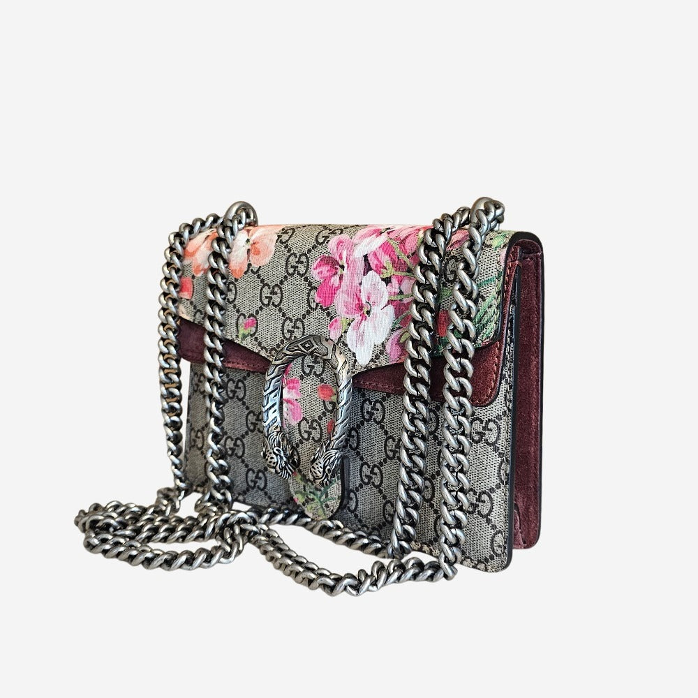 Denne smukke taske fra Gucci er blandt andet defineret af dens tigerhoved-hardware som er til ære for den græske Gud Dionysus, som ifølge myter skulle have krydset floden The Tigris på en tiger som var sendt til ham af den græske Gud Zeus. Udover den unikke lås, er der smukke farvede blomster på canvas som Gucci kalder for floral, og en kæde der kan justeres efter ønsket style. Tasken har et stort hovedrum samt en sliplomme. Tasken er derfor perfekt til alle hverdagens nødvendigheder som solbriller, nøgle, telefon, pung mm.