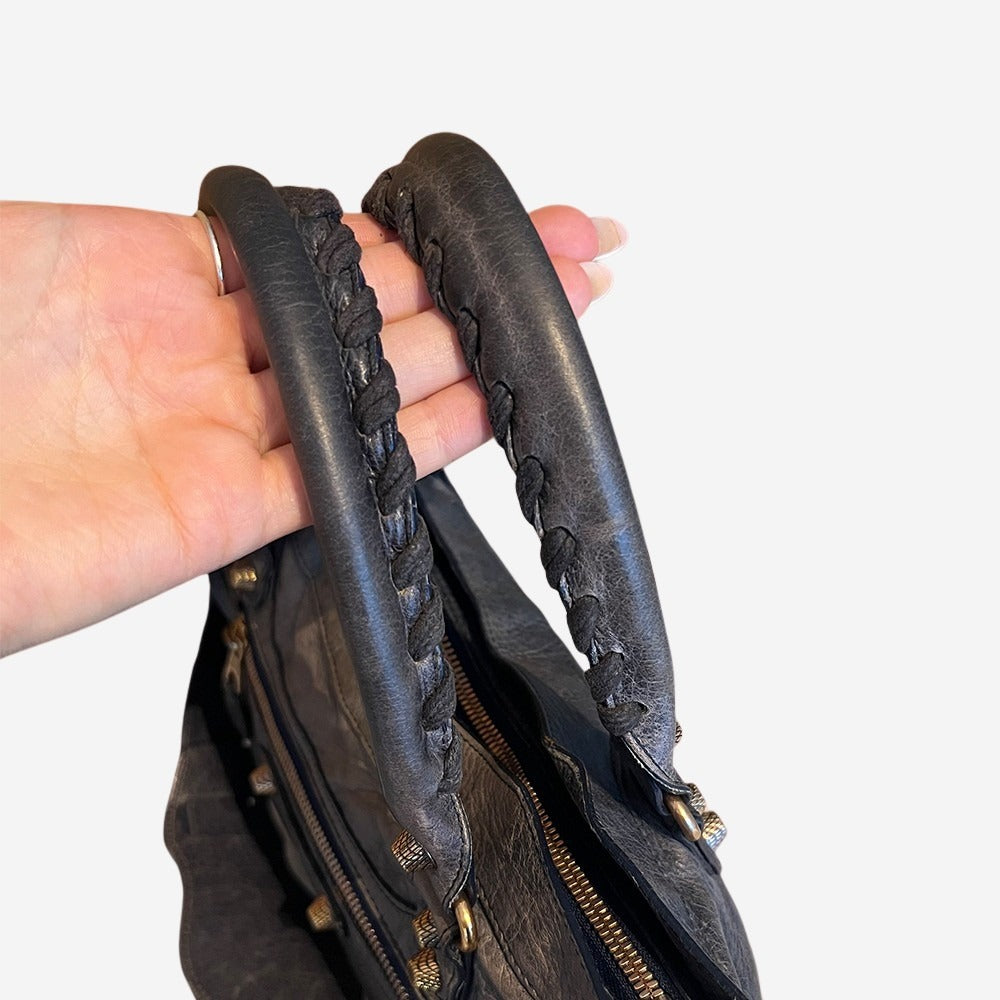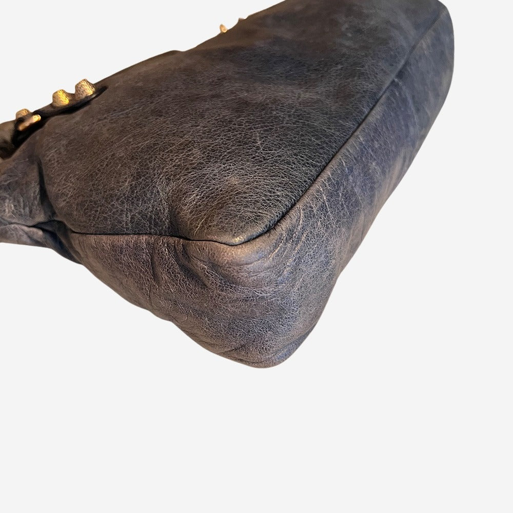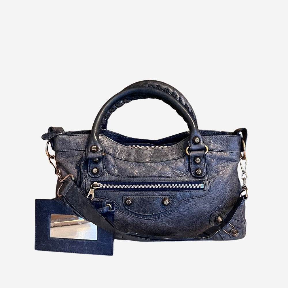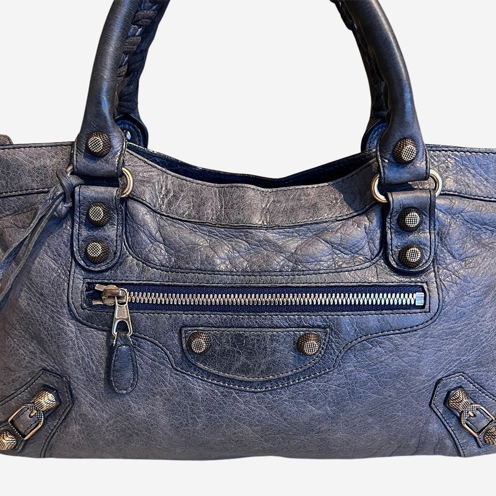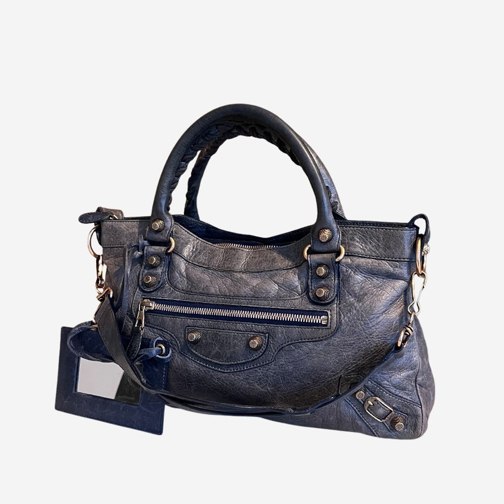 Balenciagas ”Motorcycle Bags” er i dag nogle af modebranchens største it-tasker. Denne version er en mindre udgave af den mest kendte, The City Bag. Det bløde lammeskind og de bløde former, kombineret med nitter, spænder og lædertassels, gør den både rå og feminin på samme tid. Taskens hovedrum kan nemt indeholde både pung, makeup, telefon samt nøgler. Der findes desuden en indvendig samt udvendig lynlåslomme. Tasken kan bæres som både håndtaske og skuldertaske.