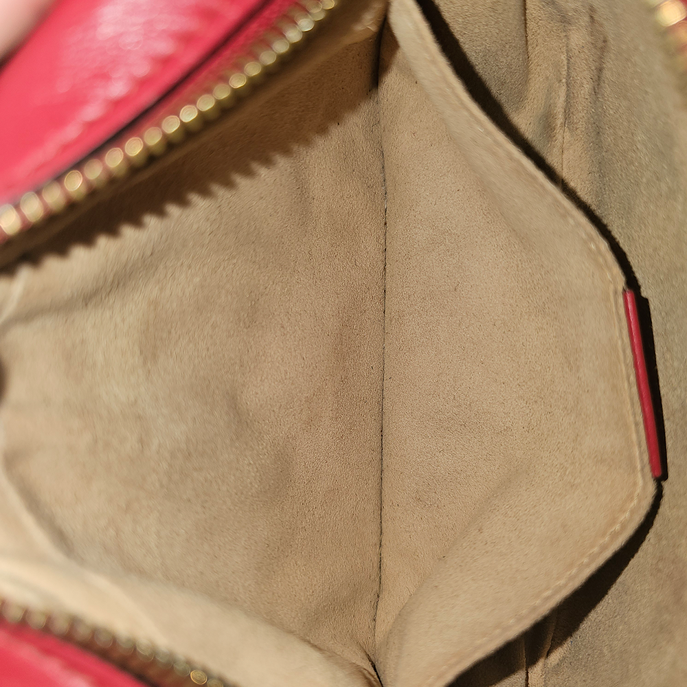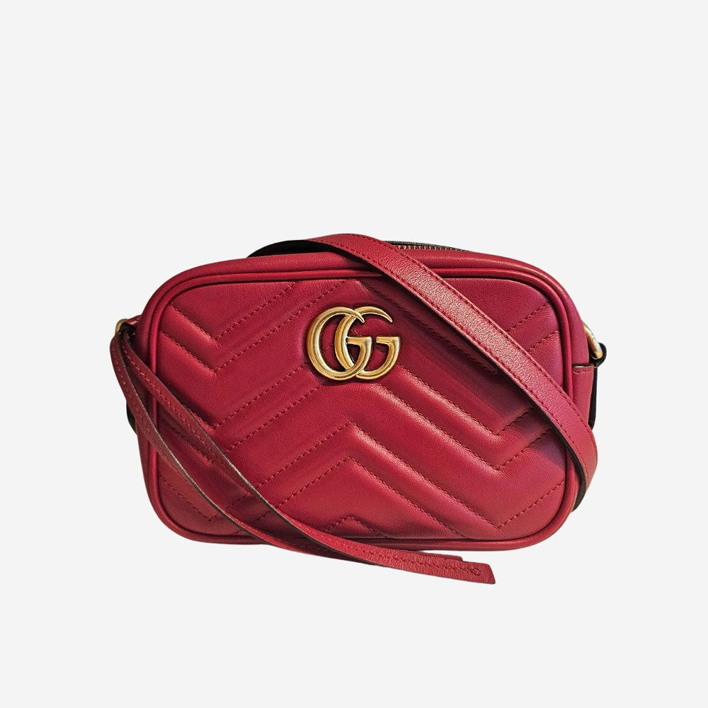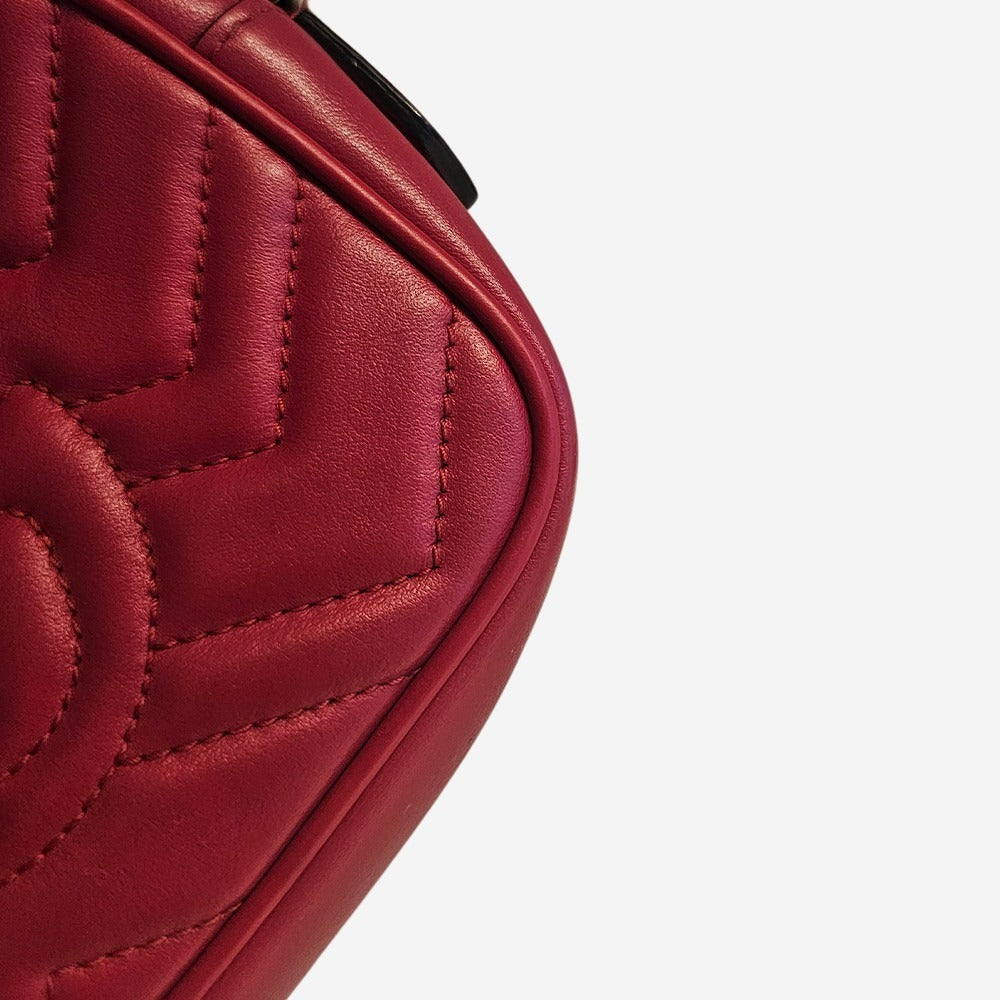 Gucci Marmont taskerne er i øjeblikket meget populære, og er blevet produceret i mange forskellige materialer samt prints i årenes løb. Denne smukke Marmont er fremstillet i rød chevron læder og med guldfarvet hardware. Indvendig er tasken beklædt med mikrofiberfor med ruskindslignende finish. Denne Gucci Marmont taske har et stort hovedrum, som kan indeholde telefon (også pro/plus/ultra modeller), pung, nøgler mm. samt en indvendig sliplomme. Den er perfekt til både hverdag og fest.