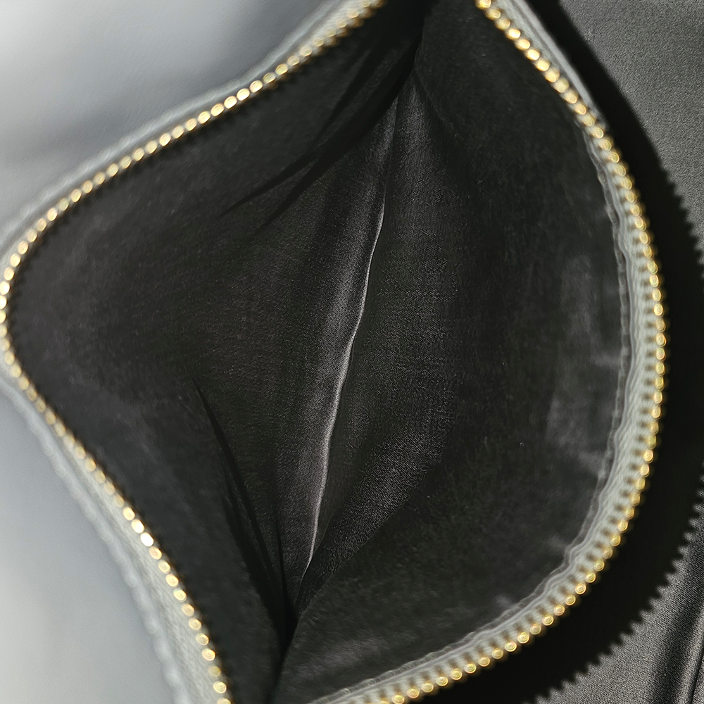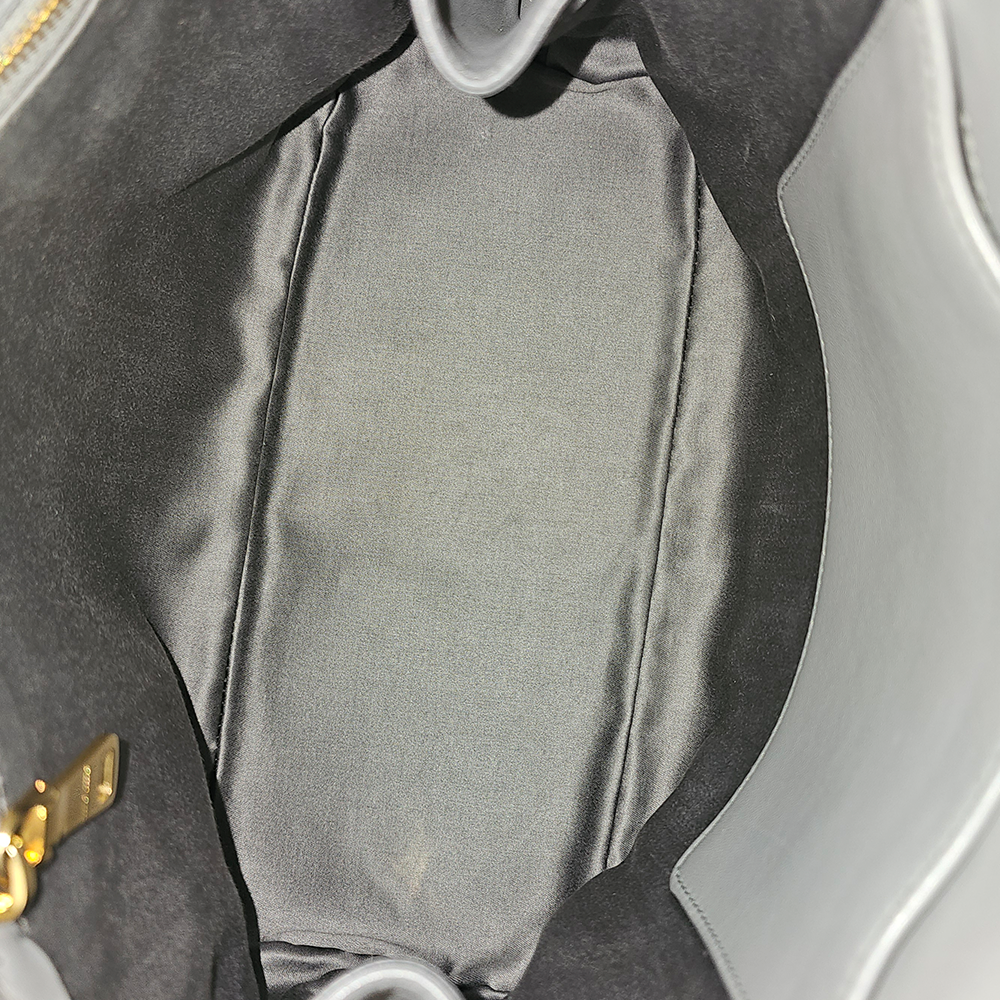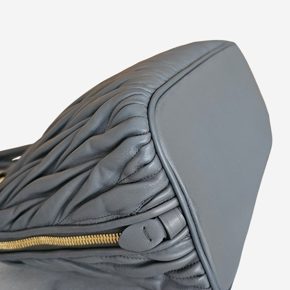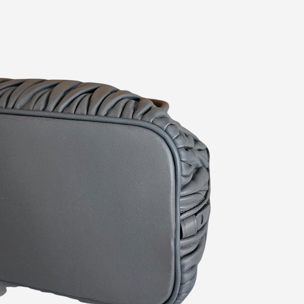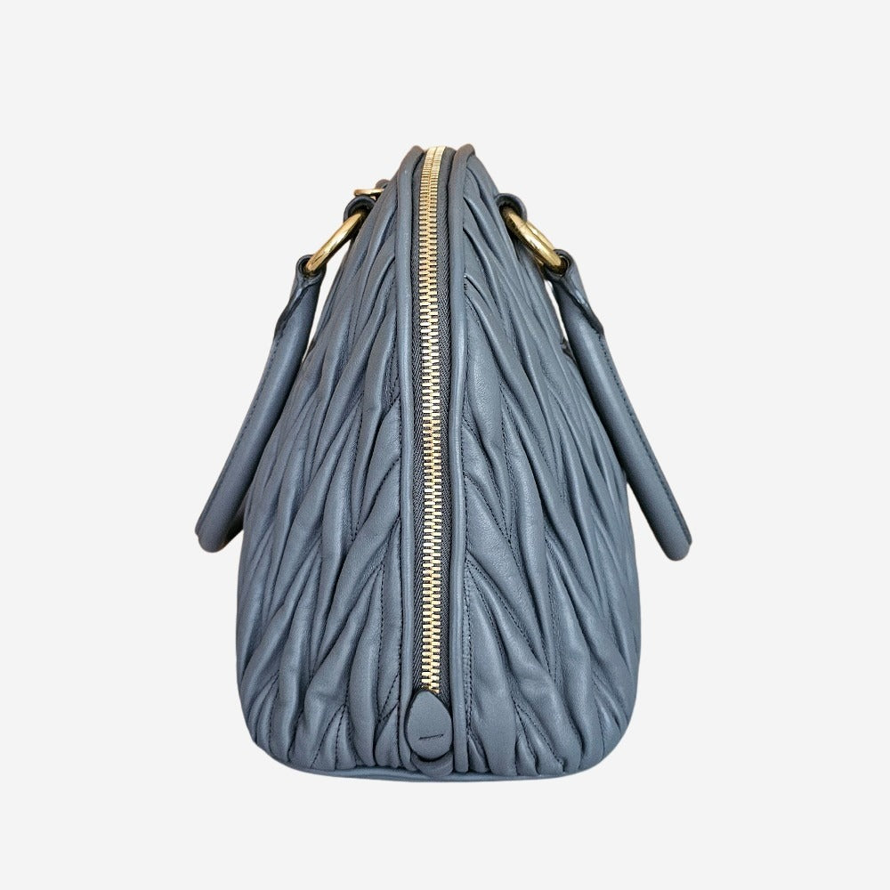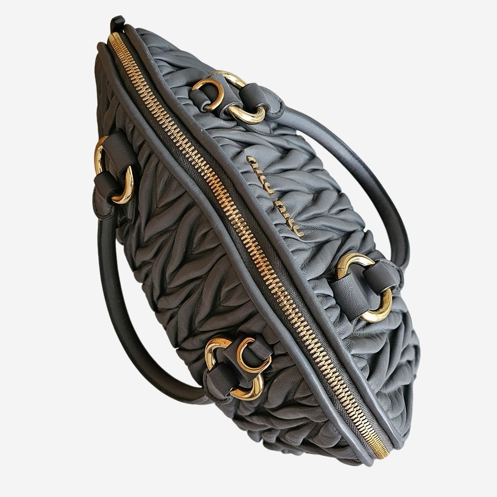 Denne elegante Miu Miu taske er fremstiller i det luksuriøse matelassé læder som er et af brandets mest ikoniske designs. Denne kommer i en smuk lysegrå farve og med en afrundet silhuet med to håndtag samt med en aftagelig og justerbar skulderem, hvilket giver den navnet "2-way". Den er med guldfarvet hardware og på forsiden af tasken ses det velkente Miu Miu logo. Tasken rummer nemt vandflaske, telefon, pung og solbriller. Der findes også 1 x lynlåslomme samt 1 x sliplomme som kan bruges til de mindre og løse genstande som nøgler, lipgloss samt kortholder.