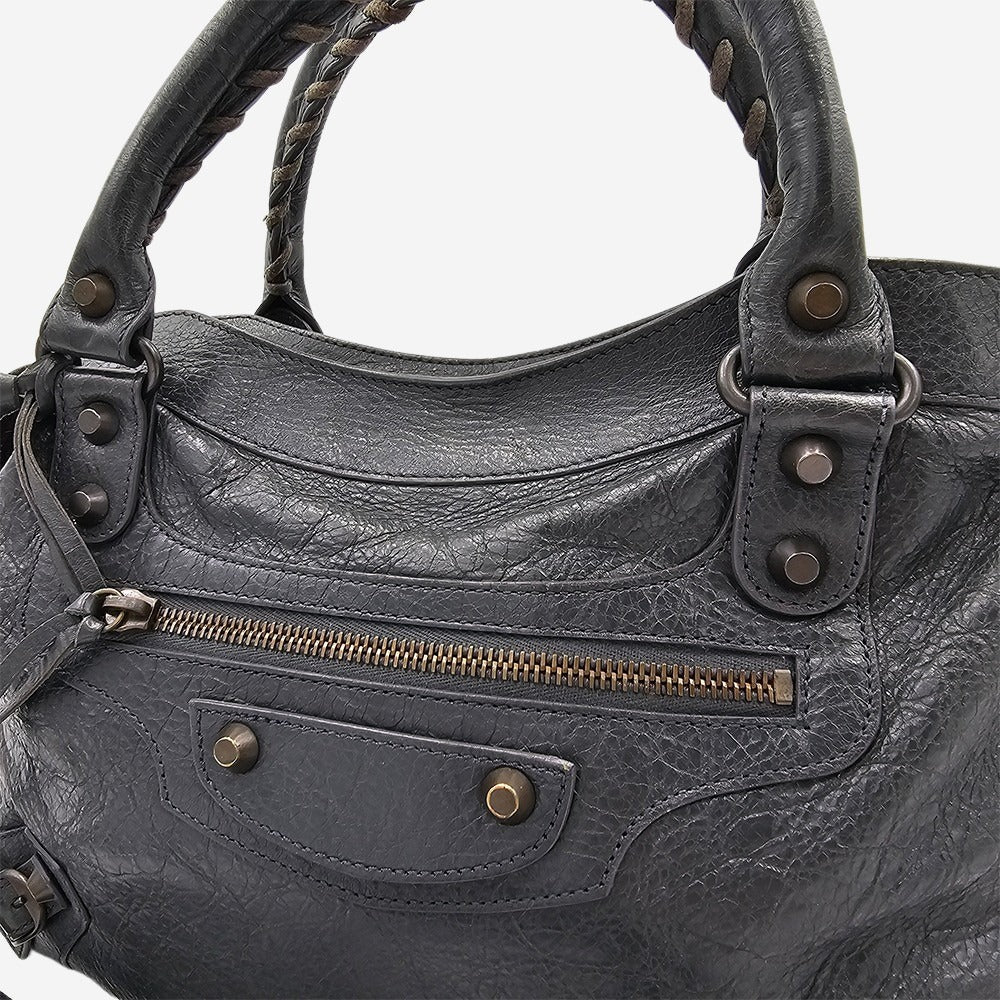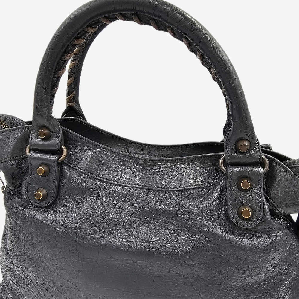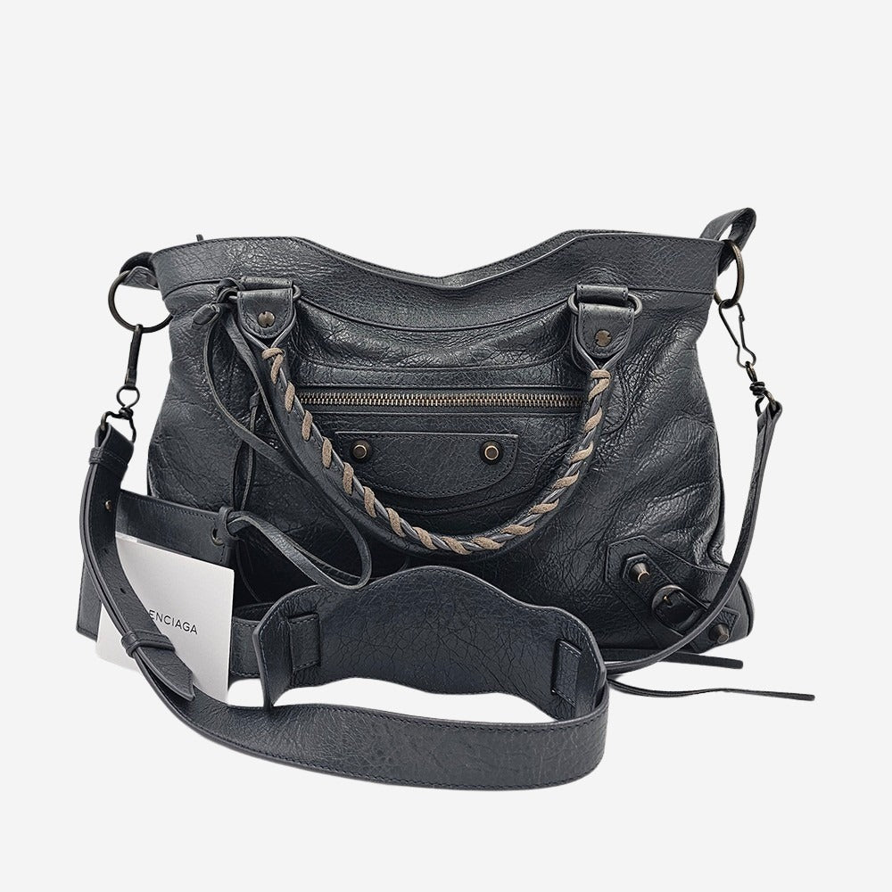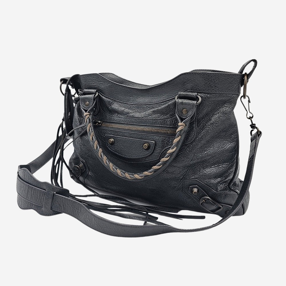 Balenciagas ”Motorcycle Bags” er i dag nogle af modebranchen største IT tasker. Denne version er nok deres mest kendte og hedder: The City Bag. Denne model er dog i deres mindre og mere lette udgave - "Mini City". Det bløde lammeskind og de bløde former, kombineret med nitter, spænder og lædertassel’s, gør den både rå og feminin på samme tid. Selvom denne udgave er mindre, kan taskens hovedrum stadig indeholde alle dine hverdagsfornødenheder såsom pung, makeup, telefon, vandflaske samt nøgler. Der findes en indvendig samt udvendig lynlåslomme. Denne taske kan bæres som både skuldertaske samt crossbody.