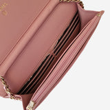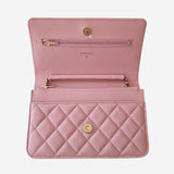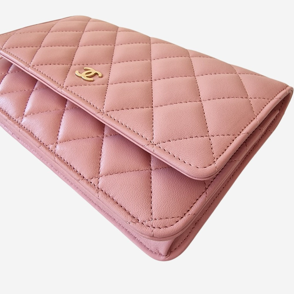 WOC eller Wallet On Chain er Chanels populære bud på taske, clutch og pung i et. WOC er meget alsidig og kæden kan foldes på utallige måder og kan derfor bæres både over skulderen, som crossbody eller i hånden som clutch/pung ved at gemme kæden usynligt indeni. Chanels Wallet On Chain er en meget populær og eftertragtet model og er derfor lavet i utallige farver og materialer. Denne WOC er lavet i det smukkeste lyserøde lammeskind med champagne hardware. Tasken har et hovedrum som kan rumme telefon, kortholder/lille pung, nøgler samt evt. læbestift/lipbalm. Derudover har den en lynlåslomme, en sliplomme samt plads til 6 kort.