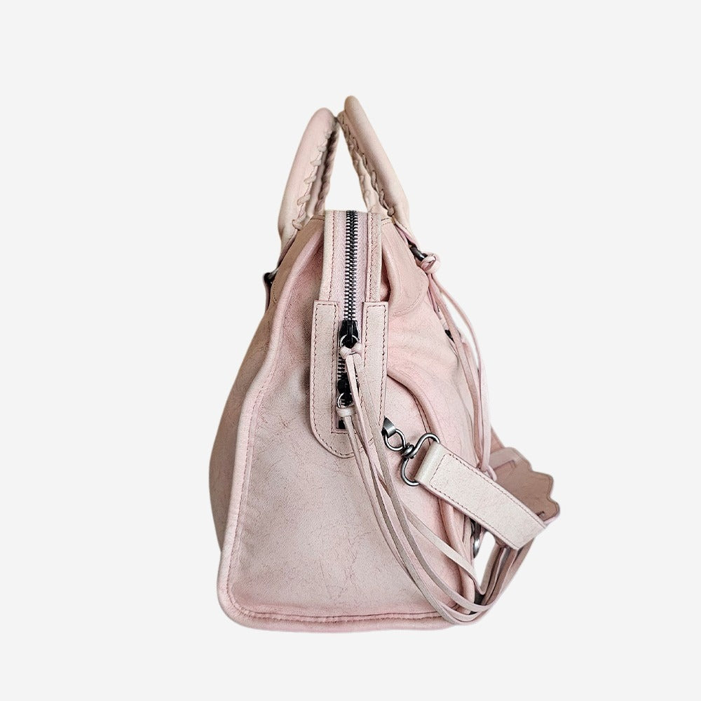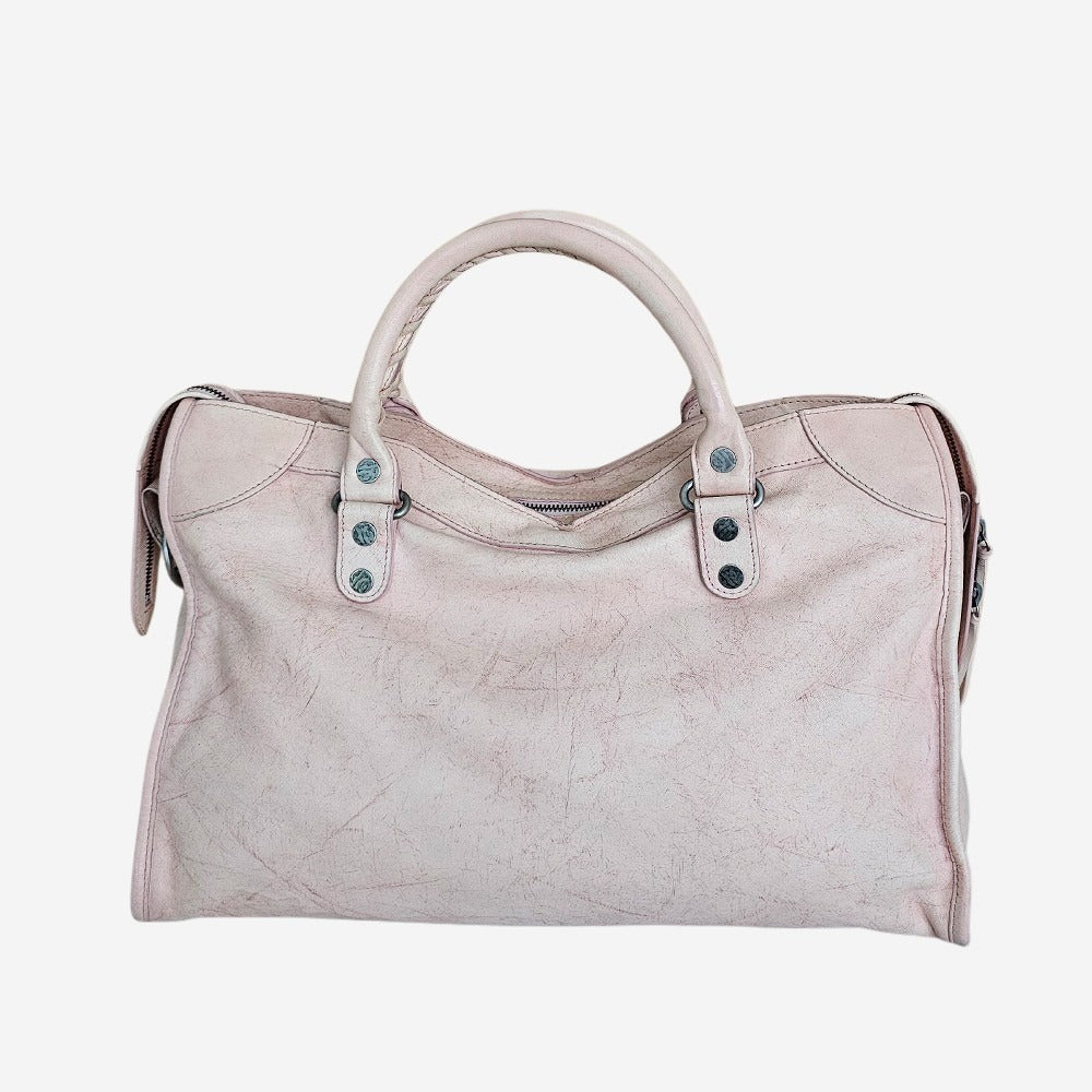Balenciagas ”Motorcycle Bags” er i dag nogle af modebranchen største IT tasker. Denne version er nok deres mest kendte og hedder: The City Bag. Det bløde lammeskind og de bløde former, kombineret med nitter, spænder og lædertassel’s, gør den både rå og feminin på samme tid. Taskens farvekode er "frambiose" hvilket betyder hindbær på fransk. Taskens hovedrum kan indeholde alle dine hverdagsfornødenheder såsom pung, makeup, telefon samt nøgler. Den rummer desuden også ekstra trøje, vandflaske mm. Der findes en indvendig samt udvendig lynlåslomme. Tasken kan bæres som både håndtaske og skuldertaske.