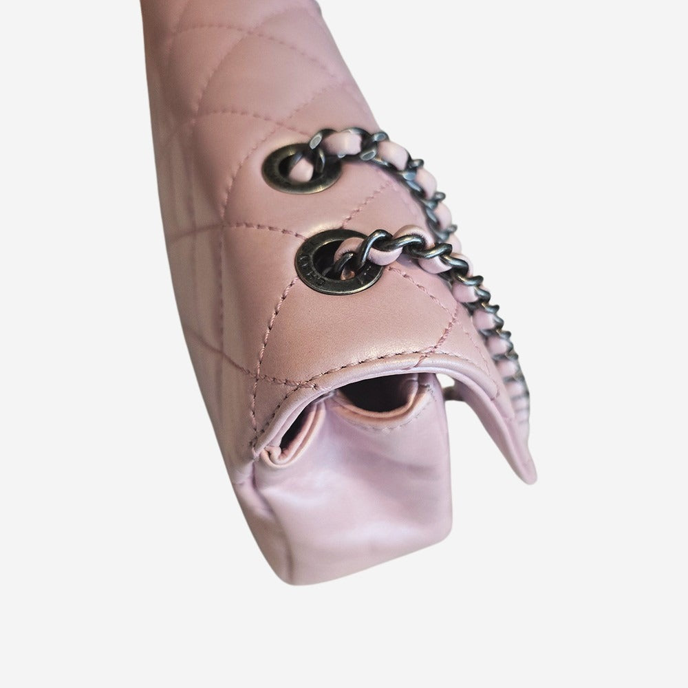 Denne single flap bag fra Chanel er fra 2016-2017.  Den er fremstillet i det smukkeste lyserøde iridescent lammeskind, som er belagt for at give en mere holdbar, glat og perlemorslignende overflade. Dette giver tasken et smukt, anderledes og glansfuldt udseende. Derudover kommer den med ruthenium hardware, som er en mere slidstærk, antik og rå udgave af den klassiske sølv hardware og med bordeaux canvas interiør. Tasken er en single flap, hvilket gør den meget rummelig og den kan indeholde telefon, solbriller, pung, nøgler, lidt makeup mm. Foruden hovedrummet har den en indvendig lynlåslomme, samt 2 yderligere sliplommer.
