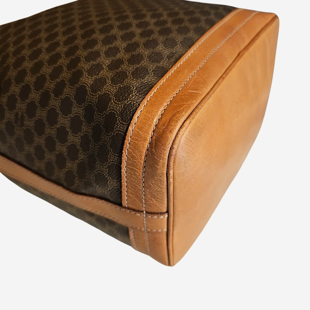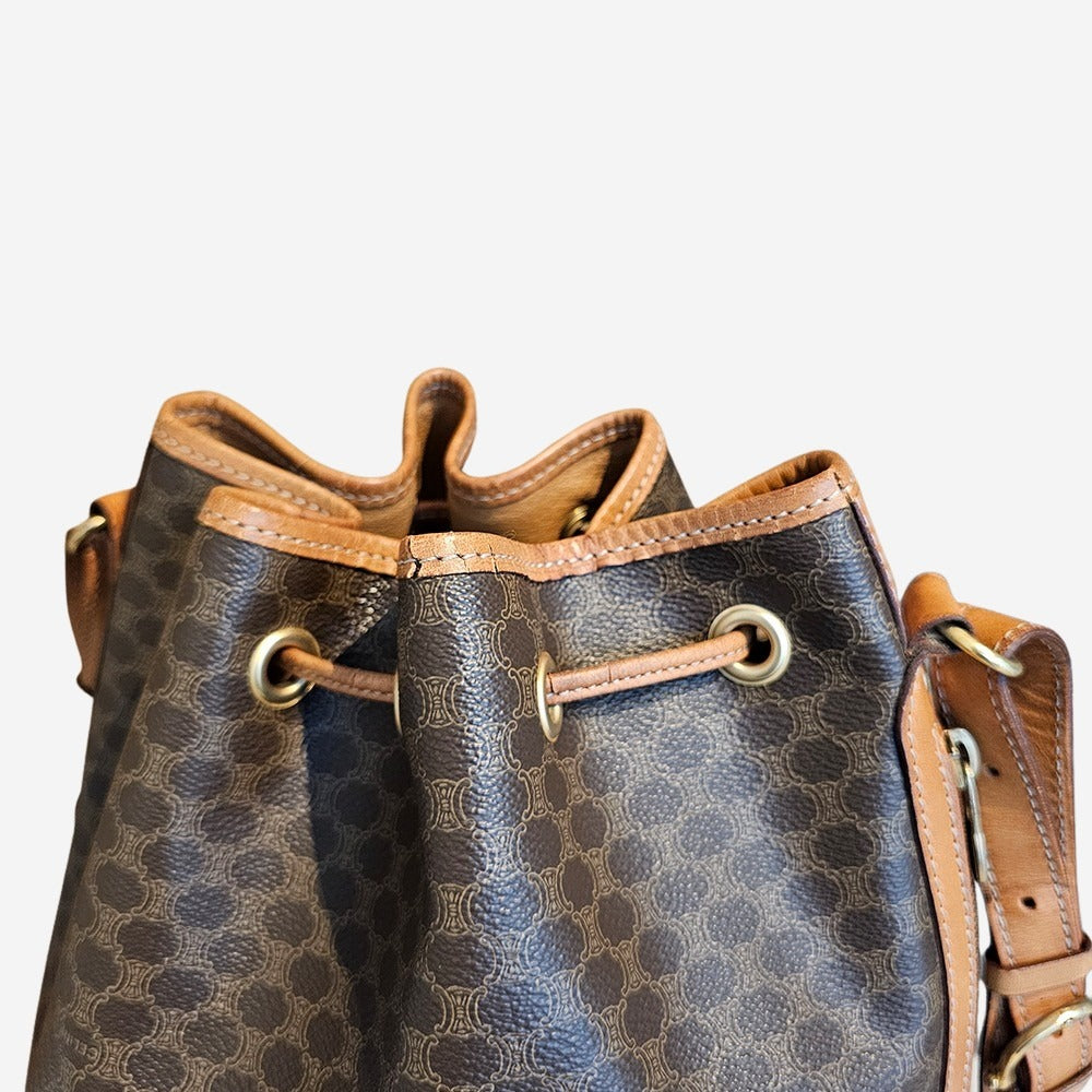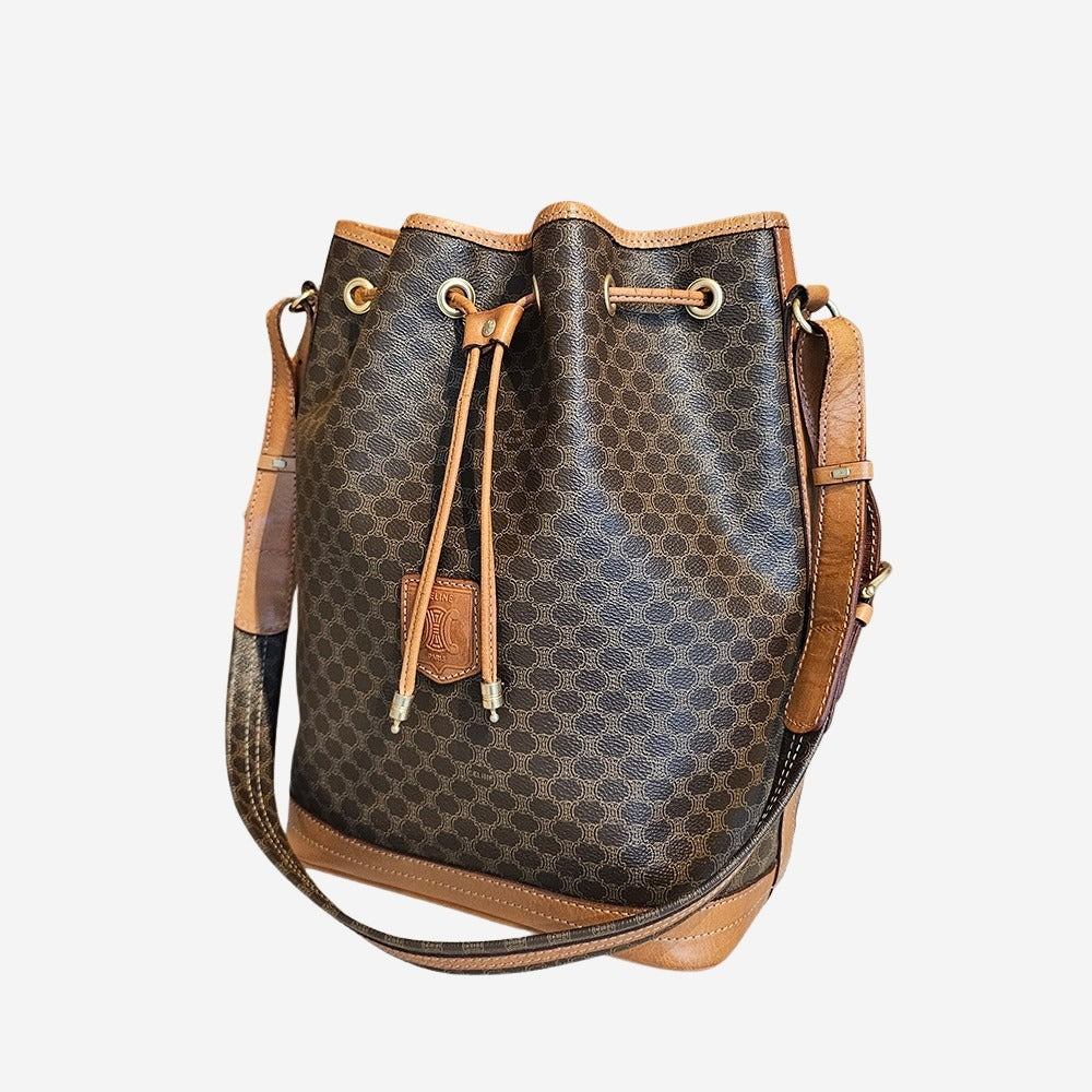 Denne elegante Celine Bucket Bag er en rigtig klassiker fra det franske modehus. Tasken er fremstillet i Célines velkendte Macadam-mønster som blev introduceret i slutningen af 1970’erne. Det klassiske Triomphe-logo, der ses på læderdetaljen foran, blev designet som en hyldest til de to buer ved Place de l’Étoile i Paris – et symbol på Célines franske arv og elegante stil. Tasken har et stort hovedrum med plads til bl.a. computer samt en indvendig lynlåslomme med plads til pung, nøgle, telefon mm. Desuden har tasken to udvendige lynlåslommer med plads til alt det, du ellers vil have med på farten. Tasken kan både bæres som skuldertaske og som crossbody.