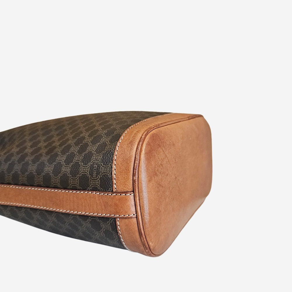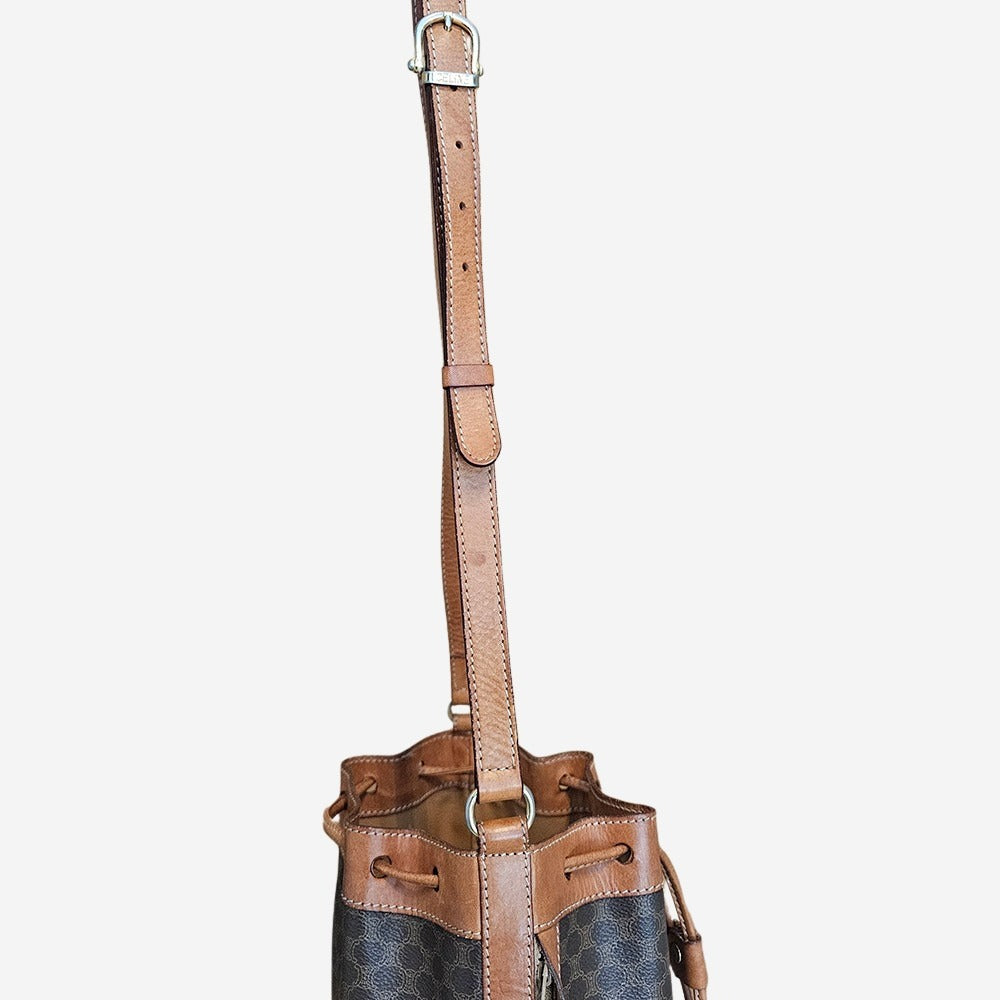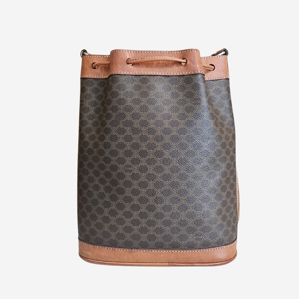 Denne elegante Celine Bucket Bag er en rigtig klassiker fra det franske modehus. Tasken er fremstillet i Célines velkendte Macadam-mønster som blev introduceret i slutningen af 1970’erne. Det klassiske Triomphe-logo, der ses på læderdetaljen foran, blev designet som en hyldest til de to buer ved Place de l’Étoile i Paris – et symbol på Célines franske arv og elegante stil. Tasken har et stort hovedrum med plads til alle dine hverdagsnødvendigheder samt en indvendig lynlåslomme med plads til dine løse genstande som nøgle, lipgloss mm. Tasken kan både bæres som skuldertaske og som crossbody.