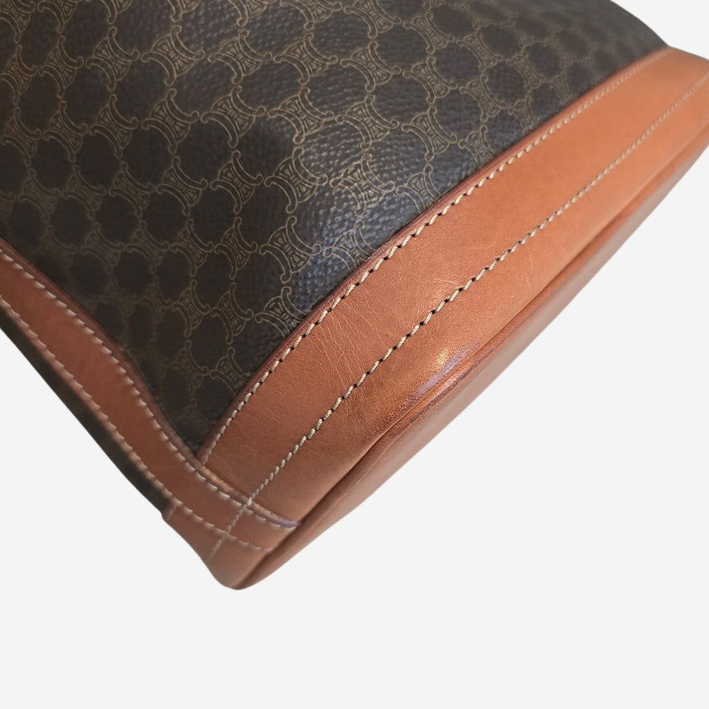 Denne elegante Celine Bucket Bag er en rigtig klassiker fra det franske modehus. Tasken er fremstillet i Célines velkendte Macadam-mønster som blev introduceret i slutningen af 1970’erne. Det klassiske Triomphe-logo, der ses på læderdetaljen foran, blev designet som en hyldest til de to buer ved Place de l’Étoile i Paris – et symbol på Célines franske arv og elegante stil. Tasken har et stort hovedrum med plads til bl.a. computer samt en indvendig lynlåslomme med plads til pung, nøgle, telefon mm. Desuden har tasken to udvendige lynlåslommer med plads til alt det, du ellers vil have med på farten. Tasken kan både bæres som skuldertaske og som crossbody.