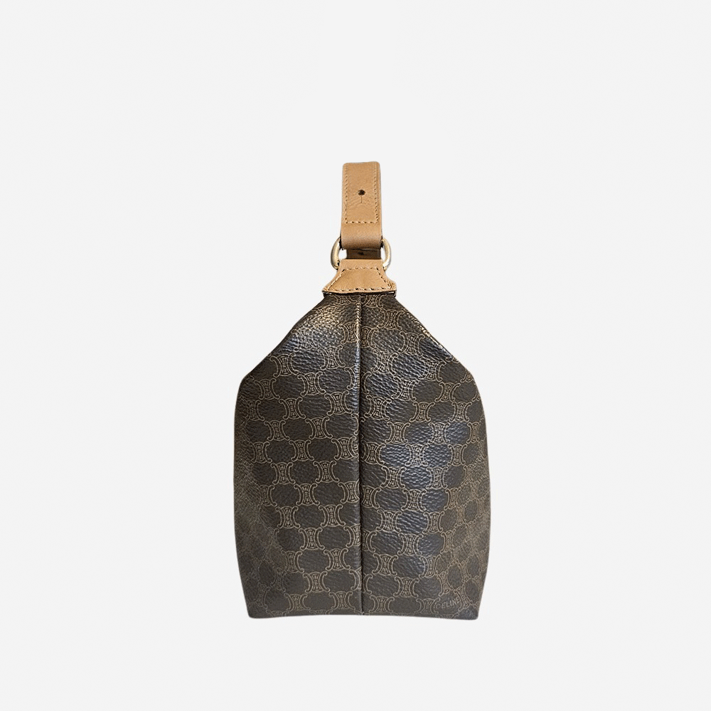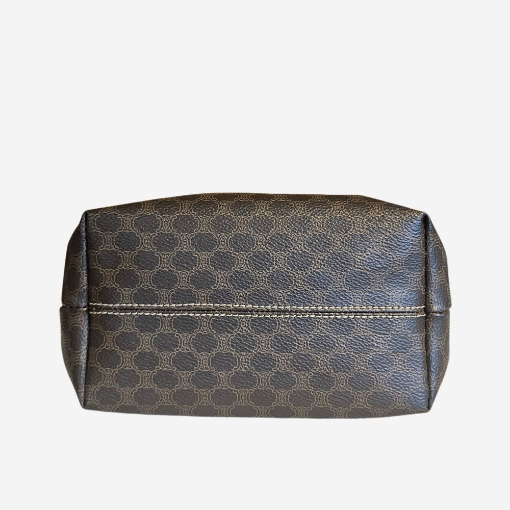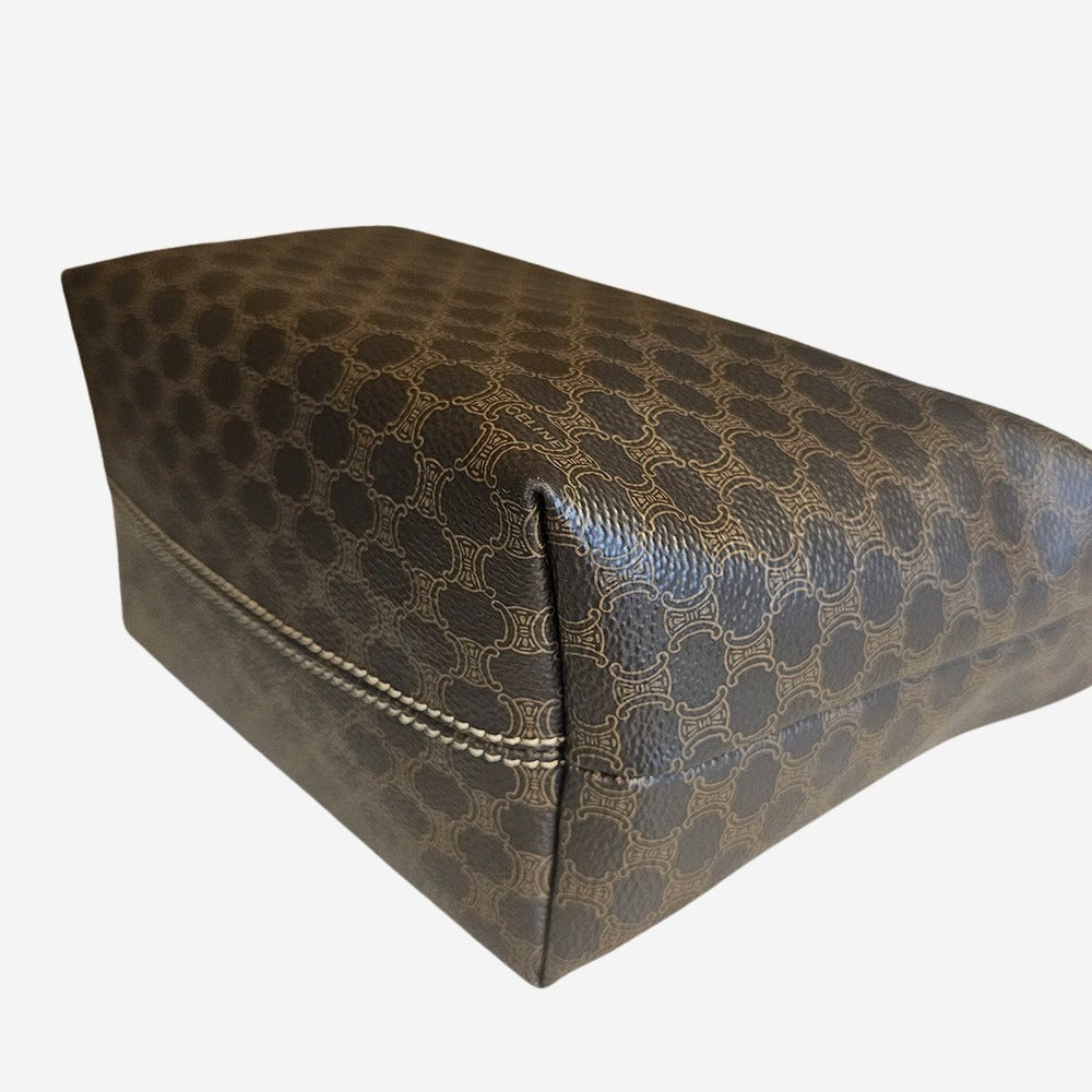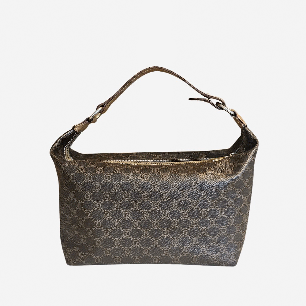 Denne smukke vintage Céline håndtaske er fremstillet i Célines ikoniske Macadam Canvas med eksklusive læderdetaljer samt guldfarvet hardware. Macadam-mønstret blev introduceret i 1970’erne og var inspireret af Louis Vuittons klassiske monogramstil. Tasken har en hobo effekt hvilket giver den en firkantet form i bunden og en runding i toppen. Tasken rummer telefon, pung, nøgle samt solbriller. Der er desuden en lille lynlåslomme med plads til kortholder. En smuk og alsidig håndtaske til livets store og små begivenheder. Tasken kan desuden også nemt bruges som toilettaske.