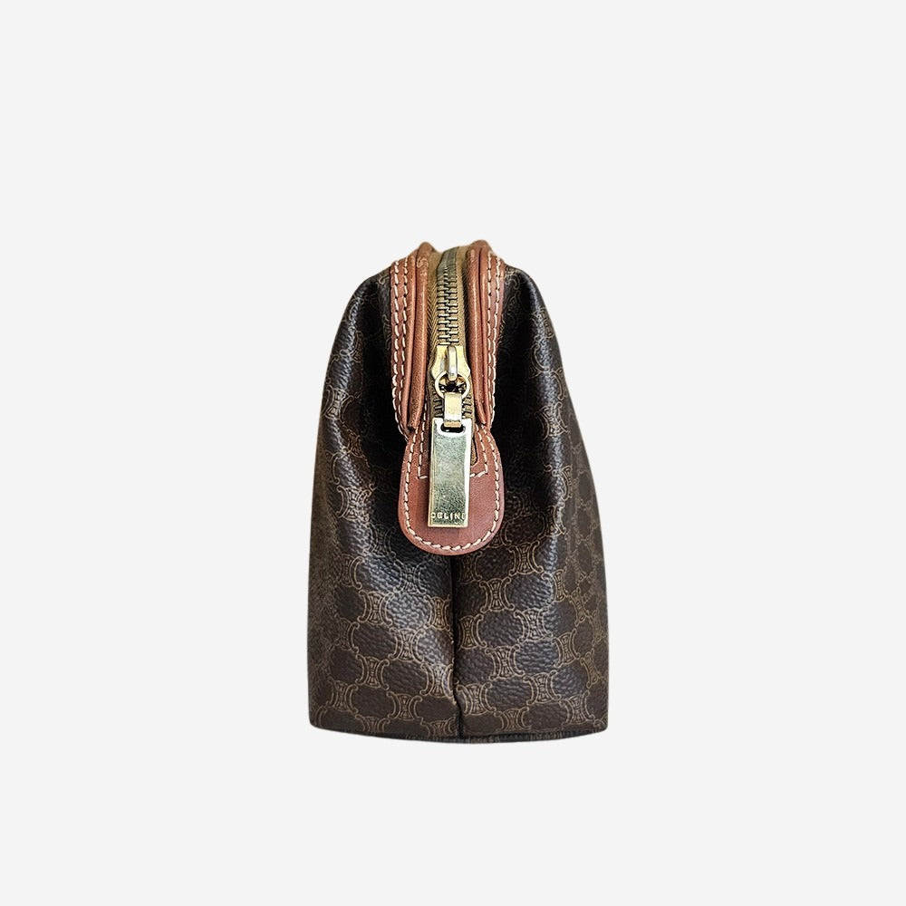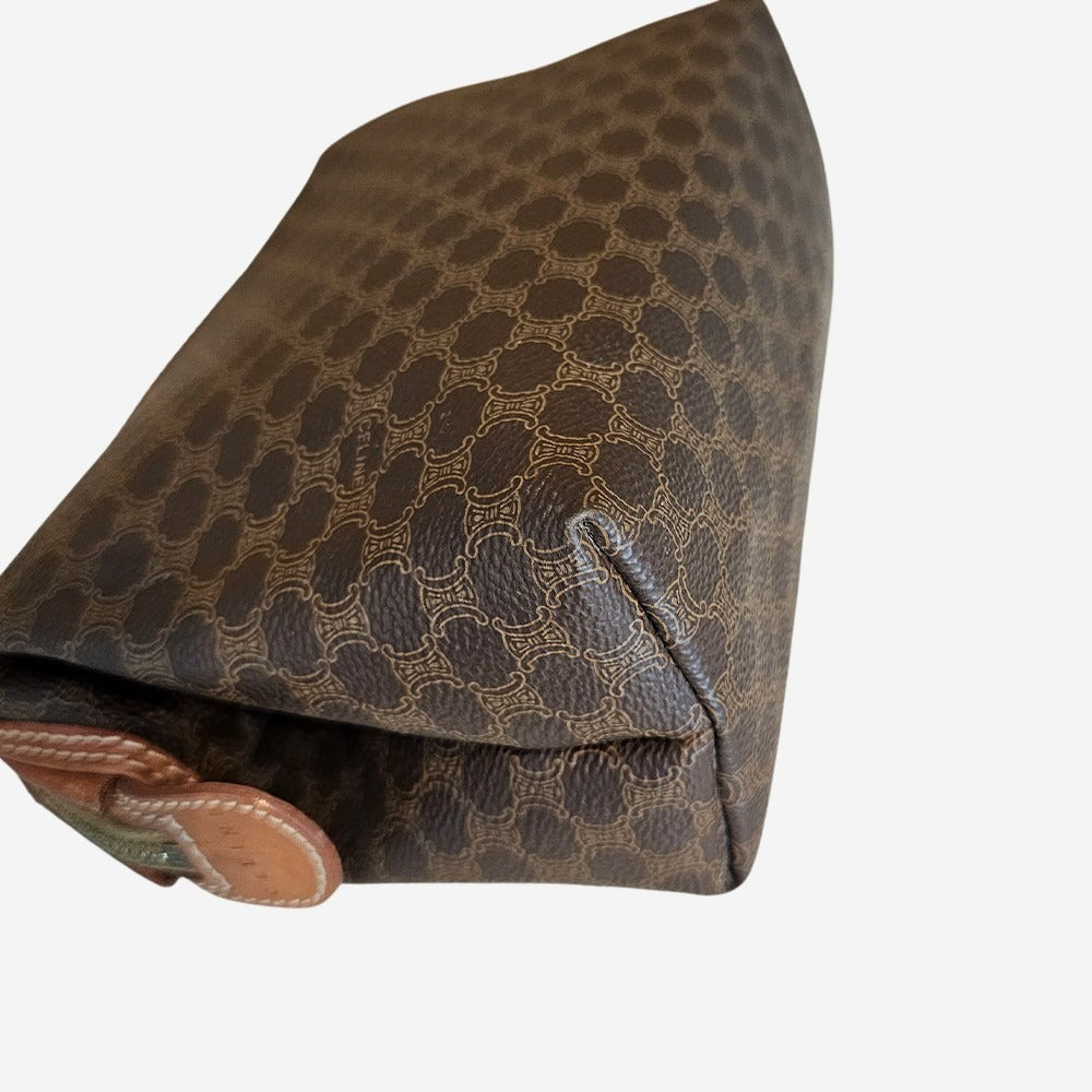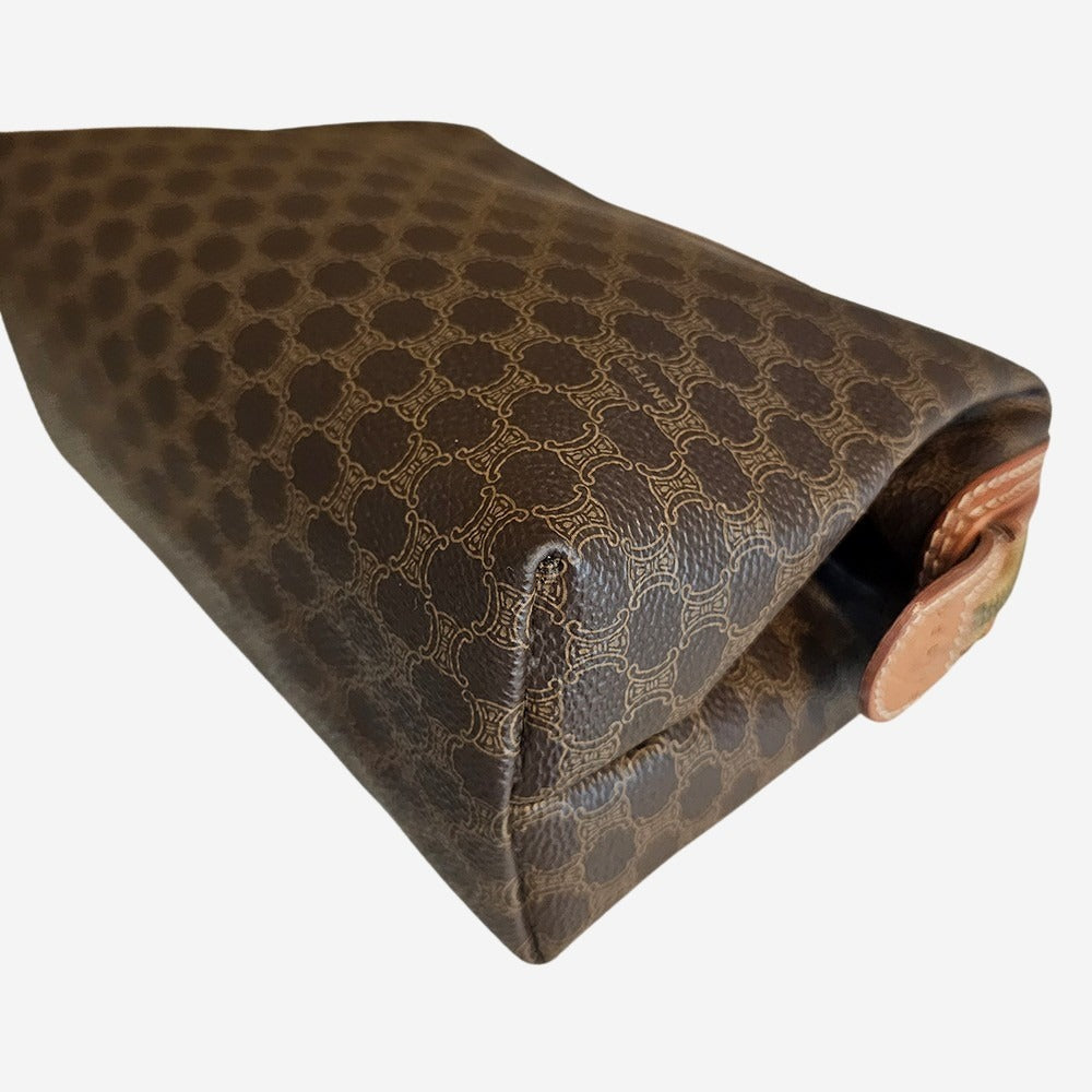 Denne smukke vintage Celine Pouch er fremstillet i Célines ikoniske Macadam Canvas med eksklusive brune læderdetaljer. Macadam-mønstret blev introduceret i 1970’erne og var inspireret af Louis Vuittons klassiske monogramstil. Tasken har et rummeligt hovedrum og to praktiske sliplommer. Hvad end toilettasken skal bruges som din go-to i hverdagen, som clutch til brylluppet eller til dine rejser så er det den perfekte accessory.
