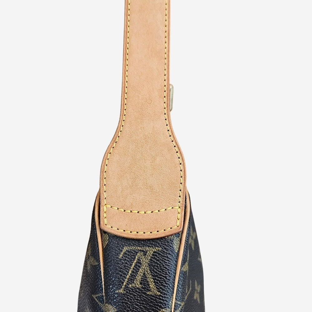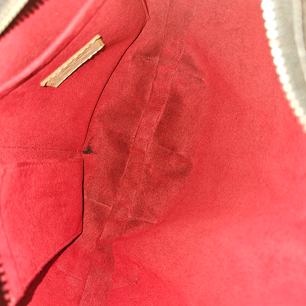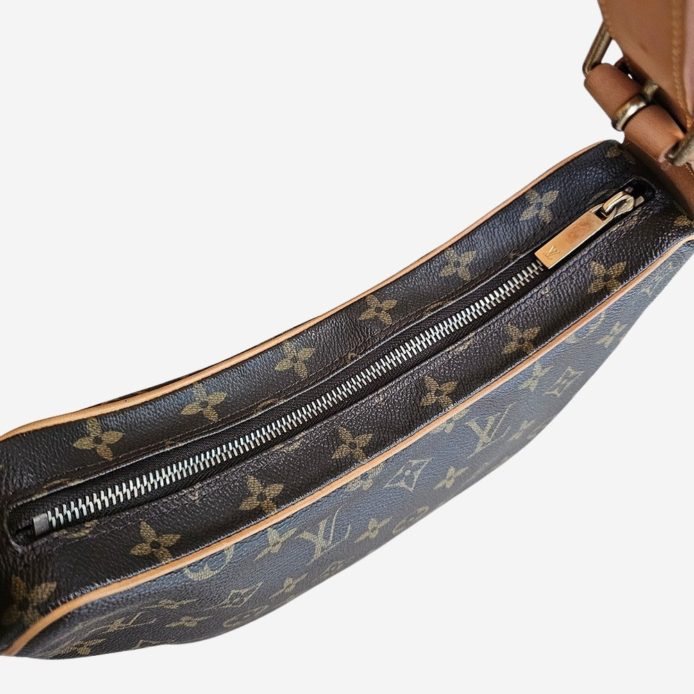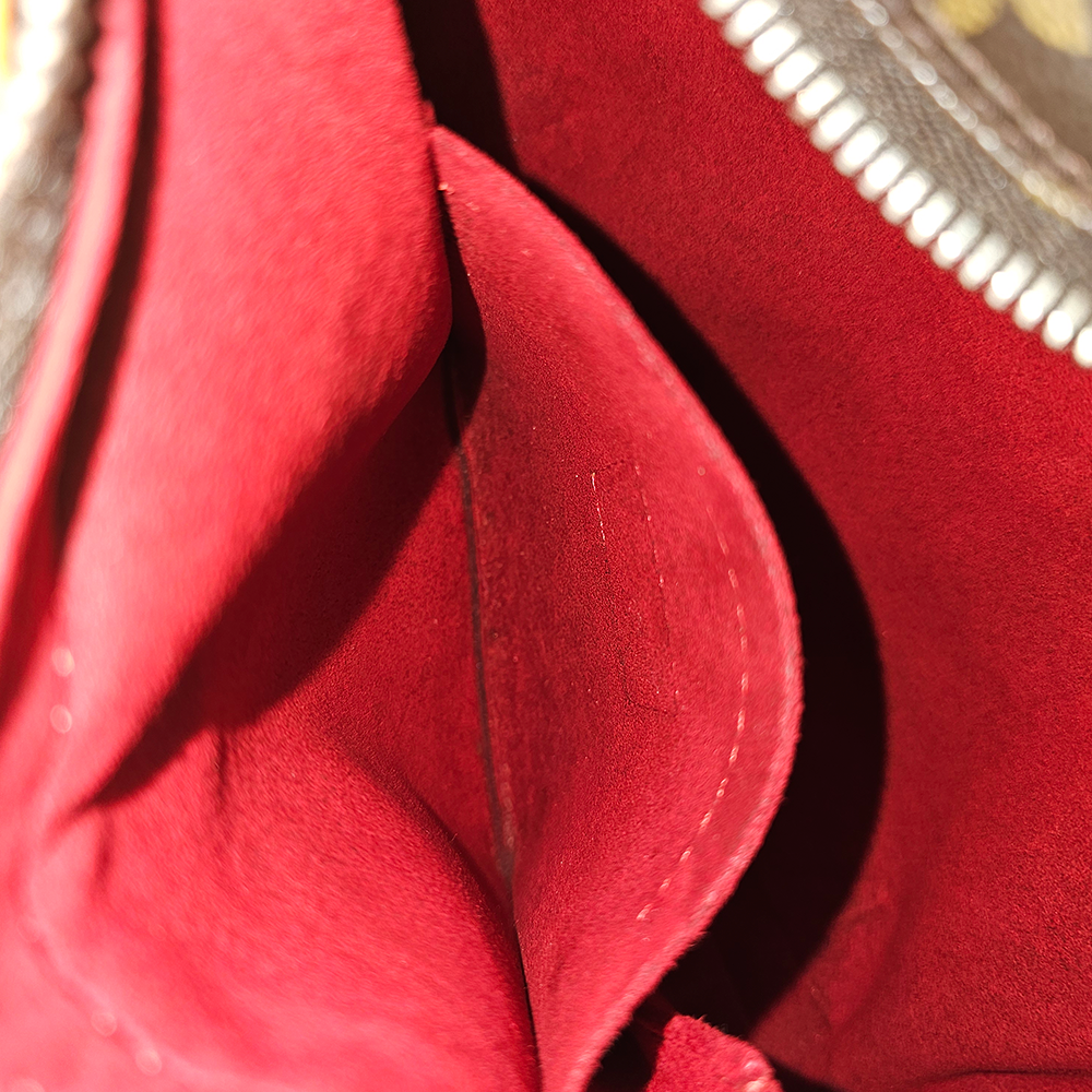 Louis Vuitton croissant er en sjælden skuldertaske, som blev introduceret i begyndelsen af 2000'erne og som i dag er meget svær at finde, da den udgik fra deres sortiment for flere år siden. Den er udformet i en smuk karakteristisk croissant silhuet og har derfra fået sit navn. Den er fremstillet af Louis Vuittons ikoniske monogram coated canvas med vachetta læderrem og detaljer. Taskens hovedrum er betrukket med det fineste røde Alcantara-for, som ligner ruskind. Louis Vuitton Croissant tasken blev introduceret i tre forskellige størrelser - PM, MM og GM, som står for petite modele (lille model), moyen modele (medium model) og grand modele (stor model). Denne taske er en MM og kan indeholde telefon, pung, solbriller/briller, nøgler, lille makeuppung + det løse.