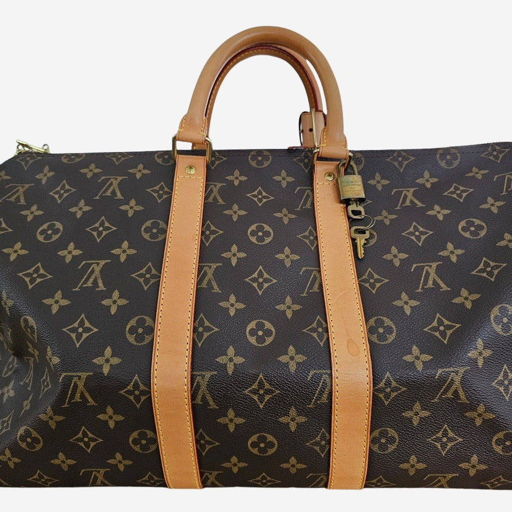 Keepall er fremstillet af Louis Vuittons ikoniske monogram Coated Canvas med Vachetta læder håndtag samt detaljer. Som navnet antyder rummer Louis Vuitton Keepall en hel del. Tasken har et stort hovedrum som nemt kan rumme garderoben til en lille weekendtur. Tasken kan også foldes helt fladt sammen og medbringes i kufferten, så du kan bruge den til håndbagage på vej hjem til alle dine indkøb. Keepall er og bliver den perfekte rejsetaske.