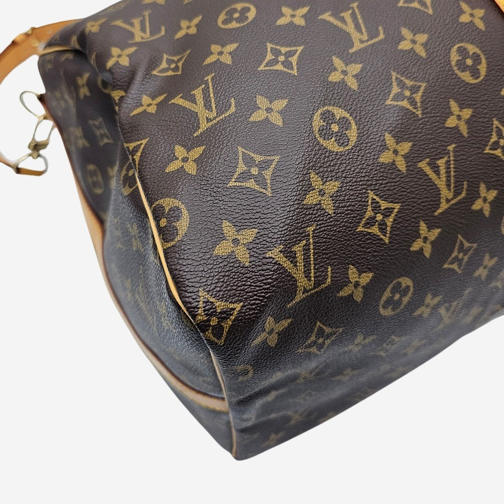 Keepall er fremstillet af Louis Vuittons ikoniske monogram Coated Canvas med Vachetta læder håndtag samt detaljer. Som navnet antyder rummer Louis Vuitton Keepall en hel del. Tasken har et stort hovedrum som nemt kan rumme garderoben til en forlænget weekend og for nogle en hel uges ferie. Tasken kan også foldes helt fladt sammen og medbringes i kufferten, så du kan bruge den til håndbagage på vej hjem til alle dine indkøb. Keepall er og bliver den perfekte rejsetaske. Denne Keepall har desuden skulderrem som kan sættes på efter behov og tasken kan derfor også bruges over skulderen eller crossbody.