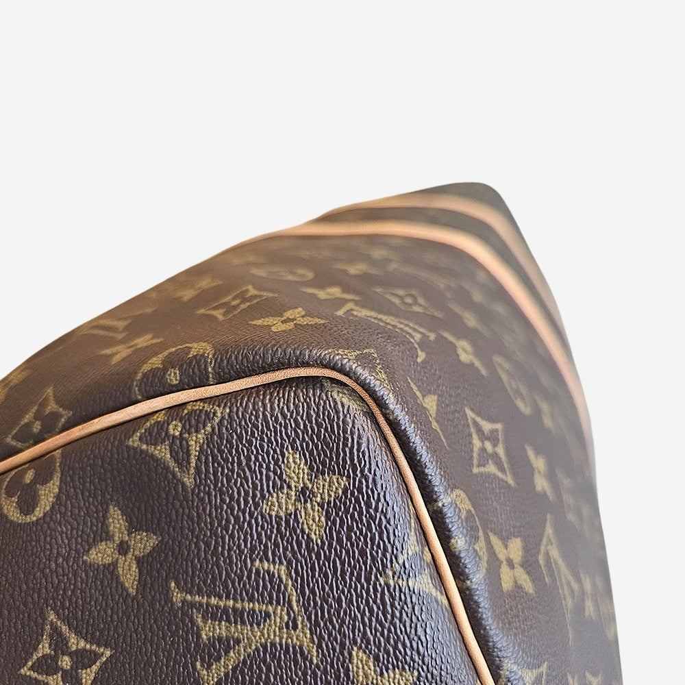 Keepall er fremstillet af Louis Vuittons ikoniske monogram Coated Canvas med Vachetta læder håndtag samt detaljer. Som navnet antyder rummer Louis Vuitton Keepall en hel del. Tasken har et stort hovedrum som nemt kan rumme garderoben til en forlænget weekend og for nogle en hel uges ferie. Tasken kan også foldes helt fladt sammen og medbringes i kufferten, så du kan bruge den til håndbagage på vej hjem til alle dine indkøb. Keepall er og bliver den perfekte rejsetaske. Denne Keepall har desuden skulderrem som kan sættes på efter behov og tasken kan derfor også bruges over skulderen eller crossbody.