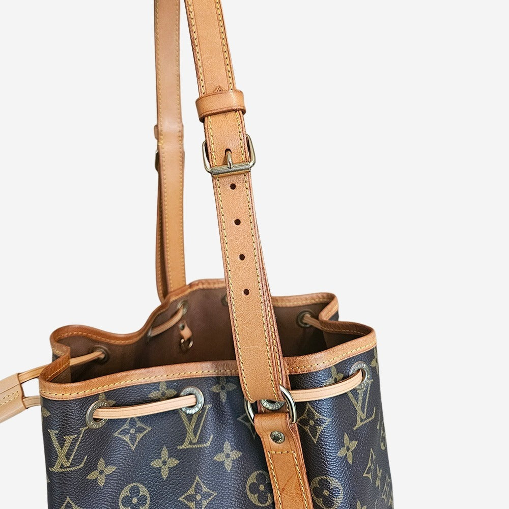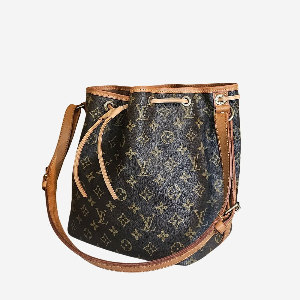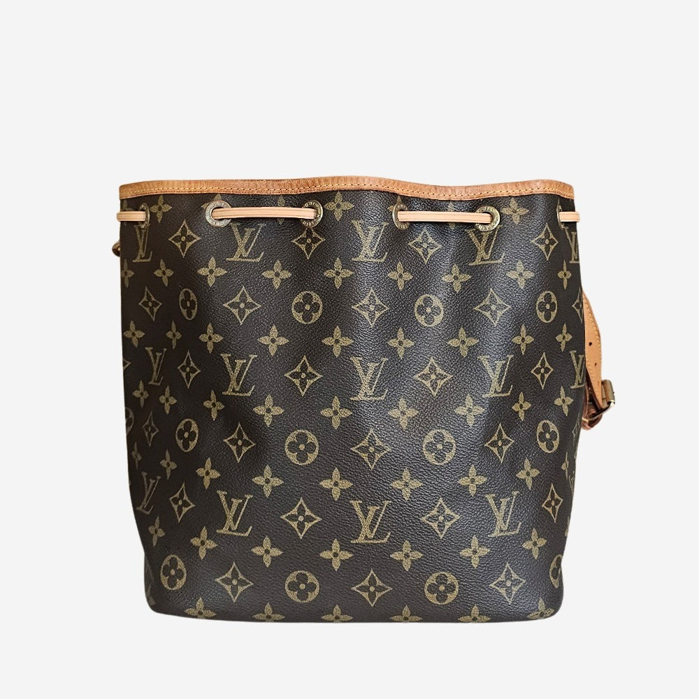Noé blev introduceret i 1932, da en champagneproducent bestilte designet for elegant at kunne transportere champagneflasker. Noé kan stadig i dag indeholde 5 flasker champagne. Petit Noé er familiens lillesøster. Den kan dog ikke indeholde 5 flasker, men rummer stadig alle dine hverdagsfornødenheder. Tasken er fremstillet af Louis Vuittons ikoniske monogram Coated Canvas med Vachetta læderrem, snor og detaljer. Tasken har et stort hovedrum.