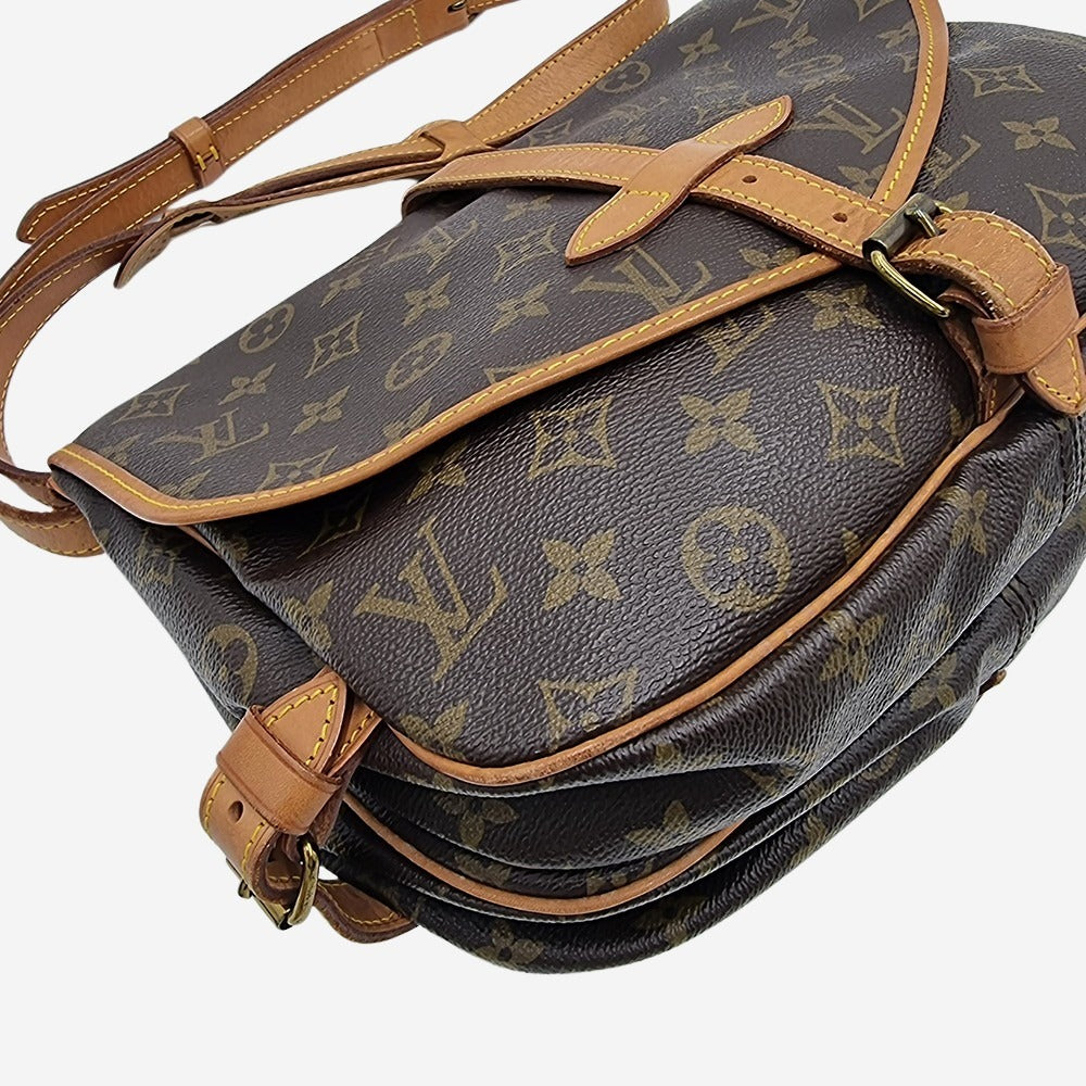 Saumur er inspireret af hestesadlen og blev derfor opkaldt efter en fransk by, som var kendt for deres prestigefyldte rideskole. Den er fremstillet af Louis Vuittons ikoniske monogram Coated Canvas med Vachetta læderrem og detaljer. Denne model er Saumur 30 og er den mindste i familien.  Åben taskens spænder og opdag de to rummelige hovedrum, som passer perfekt til alle dine hverdags nødvendigheder. Saumur 30 er også den perfekte rejsetaske. Pak tablet, pas og guidebog i det ene rum og pung, telefon og nøgler i det andet. Udover de to hovedrum, har tasken desuden en stor sliplomme i det ene rum.