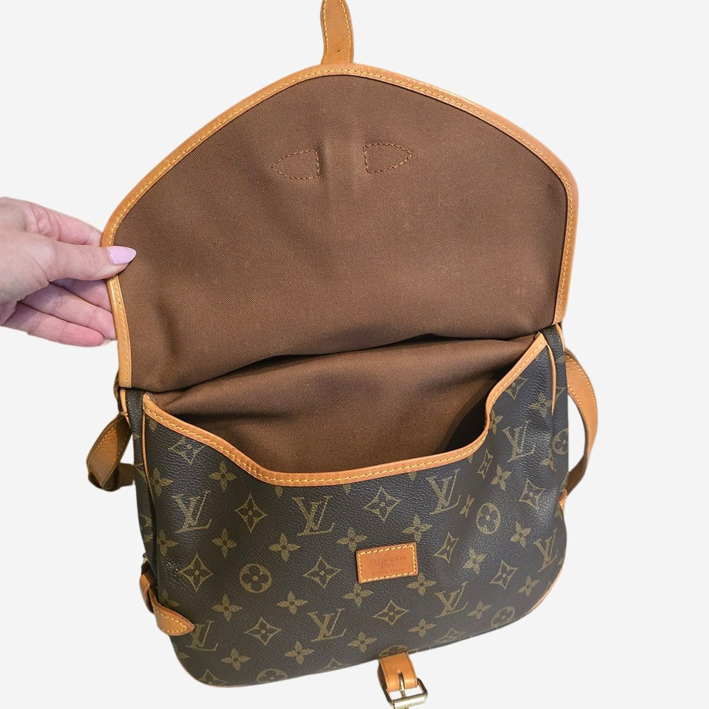 Saumur er inspireret af hestesadlen og blev derfor opkaldt efter en fransk by, som var kendt for deres prestigefyldte rideskole. Den er fremstillet af Louis Vuittons ikoniske monogram Coated Canvas med Vachetta læderrem og detaljer. Denne model er Saumur 30 og er den mindste i familien.  Åben taskens spænder og opdag de to rummelige hovedrum, som passer perfekt til alle dine hverdags nødvendigheder. Saumur 30 er også den perfekte rejsetaske. Pak tablet, pas og guidebog i det ene rum og pung, telefon og nøgler i det andet. Udover de to hovedrum, har tasken desuden en stor sliplomme i det ene rum.