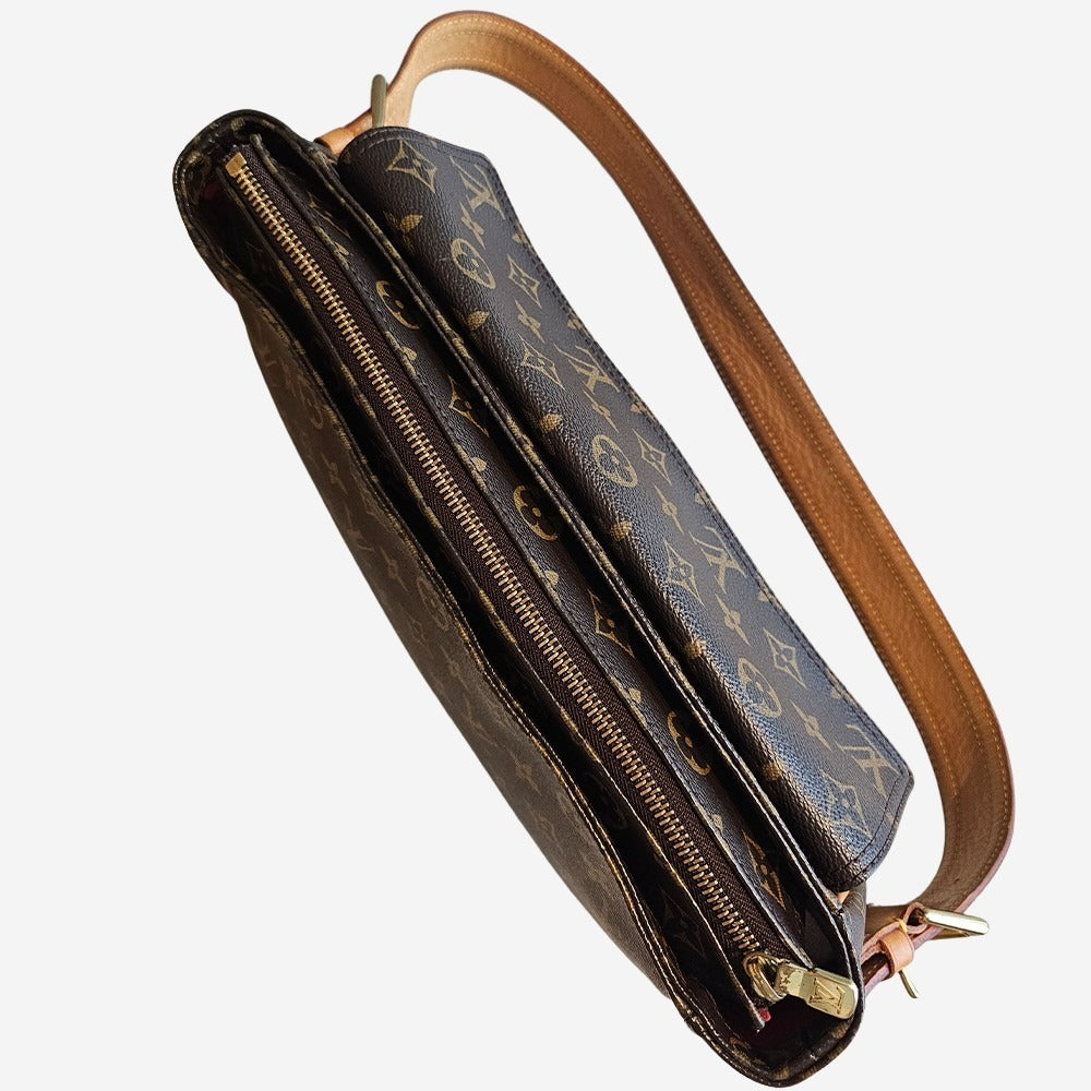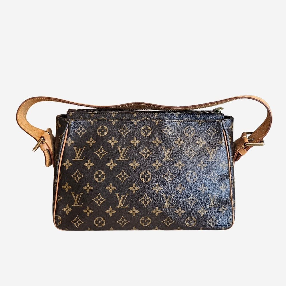 Louis Vuittons Viva Cite taske findes i 3 str. PM, MM og GM. Denne Viva Cite er str. GM og dermed den største i familien. Den er fremstillet af Louis Vuittons ikoniske Monogram Coated Canvas med vachetta læderdetaljer. Tasken har et rummeligt hovedrum, som kan indeholde både vandflaske, pung, telefon, nøgler, solbriller mm. Derudover har den to indvendige lommer samt to udvendige på front, som giver tasken sit smukke udseende.