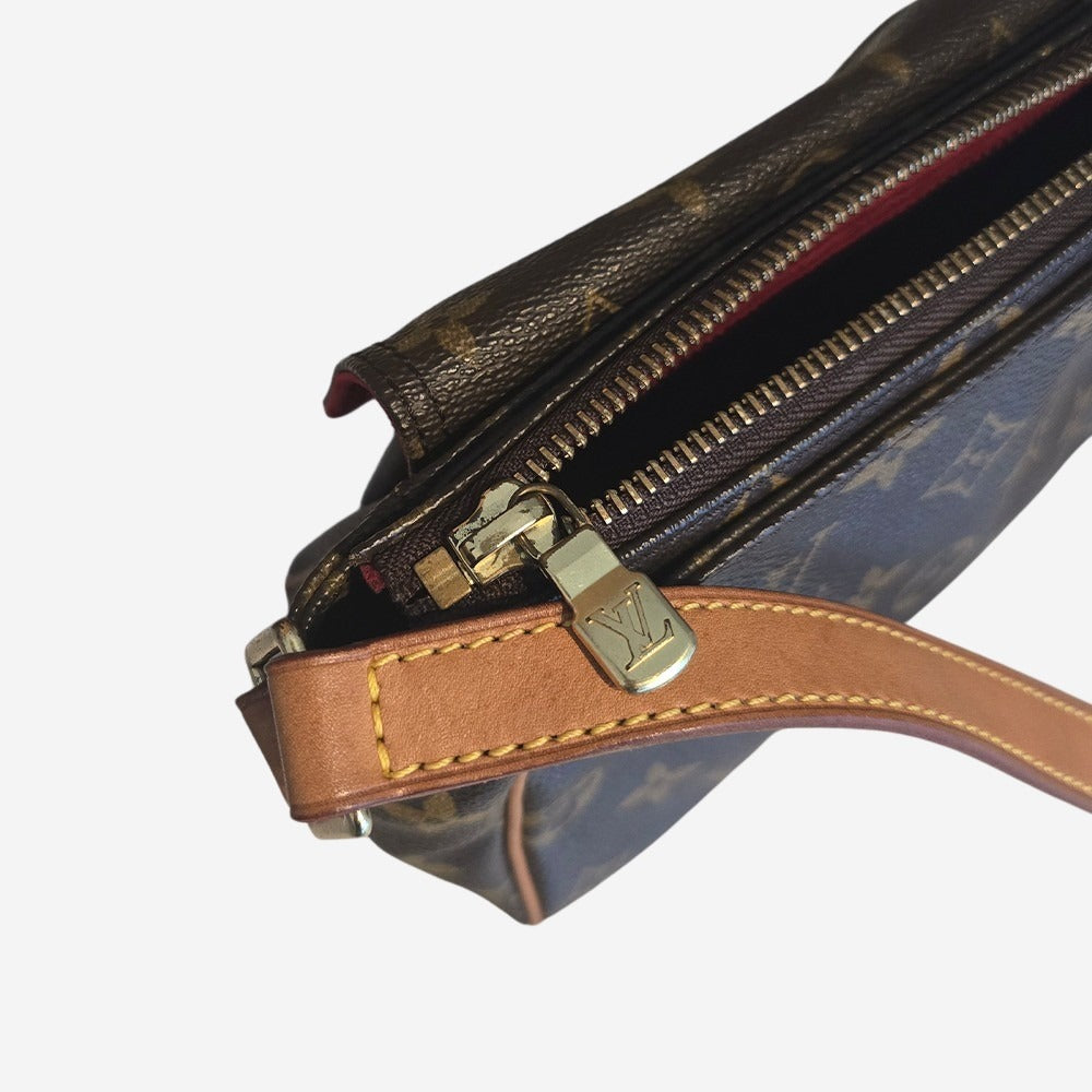 Louis Vuittons Viva Cite taske findes i 3 str. PM, MM og GM. Denne Viva Cite er str. PM og er dermed den mindste i familien. Den er fremstillet af Louis Vuittons ikoniske Monogram Coated Canvas med vachetta læderdetaljer samt skulderrem. Tasken har et hovedrum, som kan indeholde både pung, telefon, nøgler mm. Derudover har den en udvendig lomme som giver tasken sit smukke udseende.