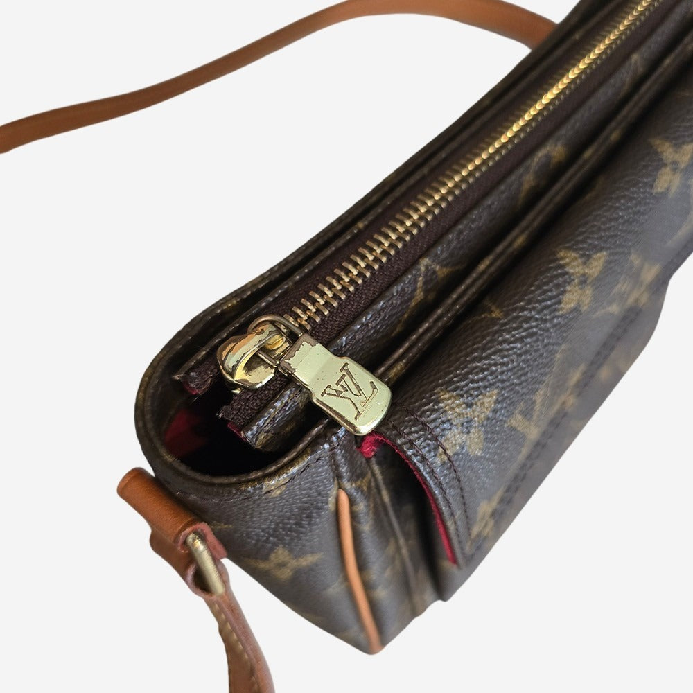 Louis Vuittons Viva Cite taske findes i 3 str. PM, MM og GM. Denne Viva Cite er str. PM og er dermed den mindste i familien. Den er fremstillet af Louis Vuittons ikoniske Monogram Coated Canvas med vachetta læderdetaljer samt skulderrem. Tasken har et hovedrum, som kan indeholde både pung, telefon, nøgler mm. Derudover har den en udvendig lomme som giver tasken sit smukke udseende.