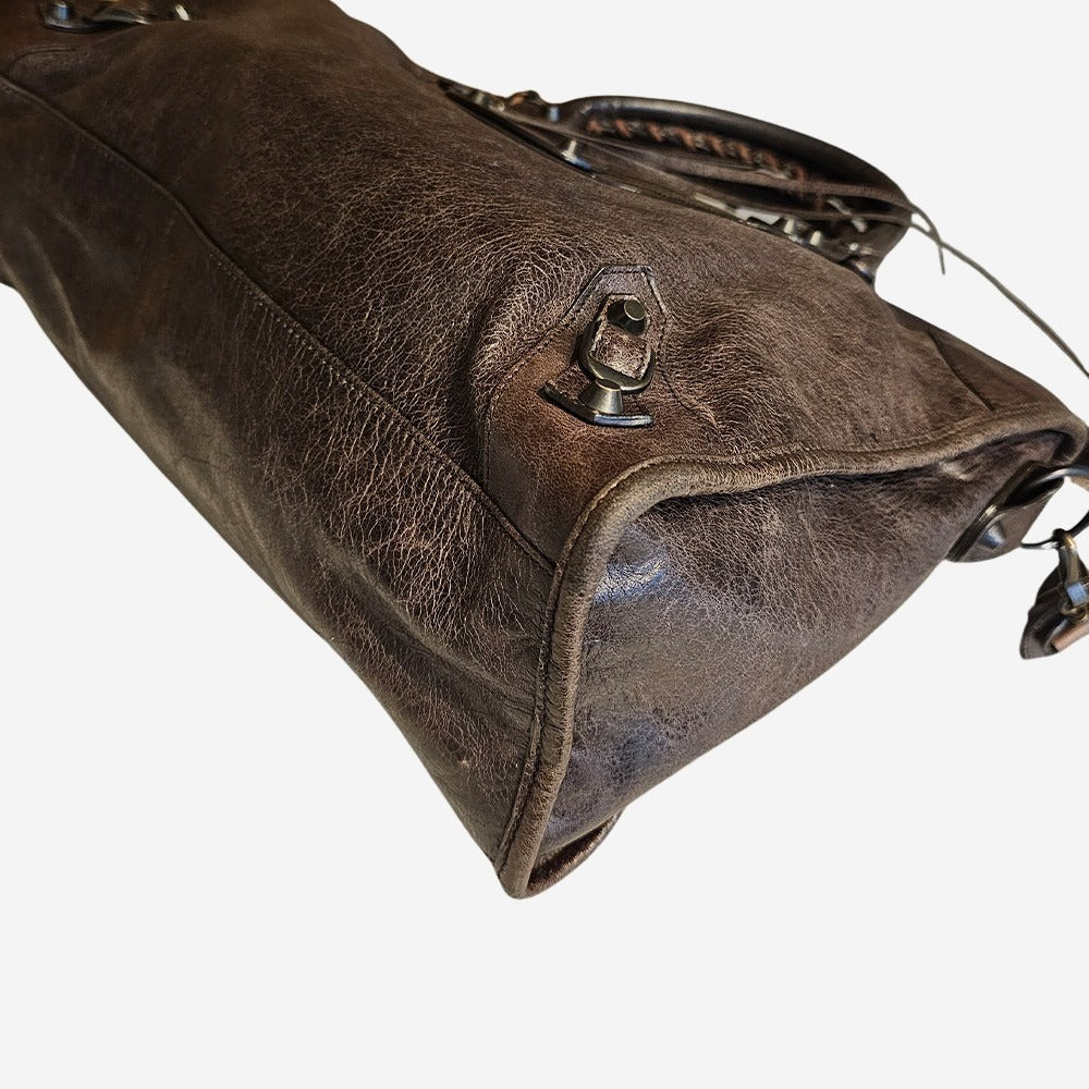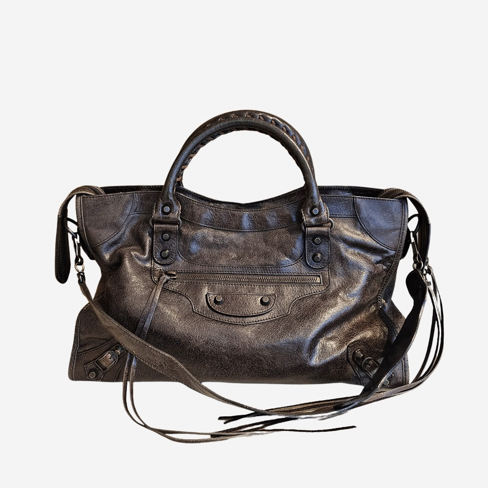 Balenciagas ”Motorcycle Bags” er i dag nogle af modebranchen største IT tasker. Denne version er nok deres mest kendte og hedder: The City Bag. Det bløde lammeskind og de bløde former, kombineret med nitter, spænder og lædertassel’s, gør den både rå og feminin på samme tid. Taskens hovedrum kan indeholde alle dine hverdagsfornødenheder såsom pung, makeup, telefon samt nøgler. Den rummer desuden også ekstra trøje, vandflaske mm. Der findes en indvendig samt udvendig lynlåslomme. Tasken kan bæres som både håndtaske, skuldertaske samt høj crossbody.