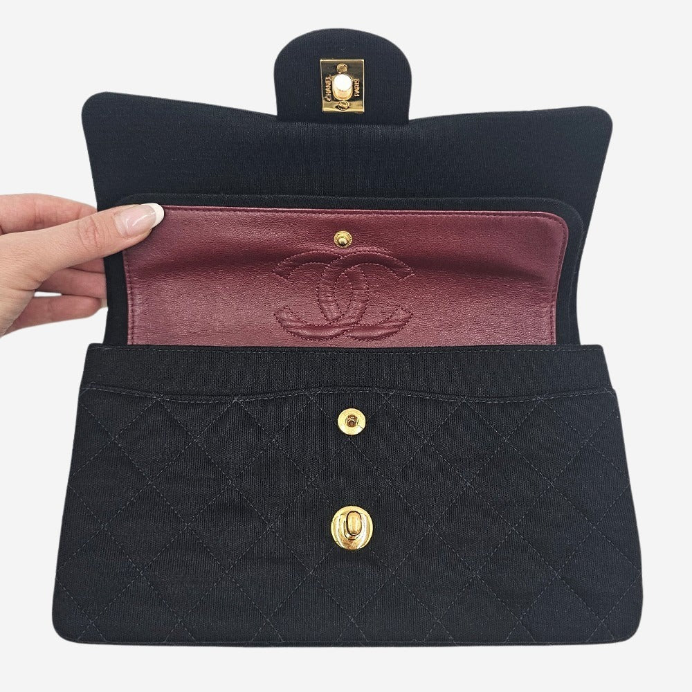 Denne utroligt smukke vintage taske er en sjælden udgave af den klassiske flap taske. Classic flap er nok Chanels mest kendte og eftertragtede taske og denne udgave har alle de klassiske træk, som dem vi kender i dag, dog med den smukke og dekorative reissue kæde. Den er fremstillet i blødt og slidstærkt jersey, 24 karat guldbelagt hardware og bordeaux læderinteriør. Tasken er uden tvivl et ægte samleobjekt for Chanel elskere. Taskens hovedrum kan indeholde pung, solbriller, telefon samt nøgler. Derudover har den yderligere 3 indvendige rum samt 1 udvendig sliplomme.