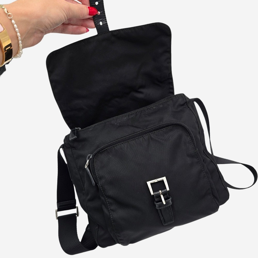 Inspireret af militærets faldskærme, begyndte Prada at arbejde med nylon i 1984. Efter Prada´s relancering af nylon-taskerne, er de gamle vintage tasker blevet et hit igen. Denne taske er fremstillet i nylon og er udsmykket med spænde samt deres berømte mærkevarelogo. Tasken har et stort og rummeligt hovedrum som lukkes med spænde. Den har yderligere en indvendig lynlåslomme samt en udvendig lomme. Tasken er ideel for alle og kan justeres i stofremmen, så den kan bæres både som skuldertaske og crossbody. Perfekt til hverdag, arbejde, skole eller rejser. Tasken er unisex og er fantastisk til både mænd og kvinder.