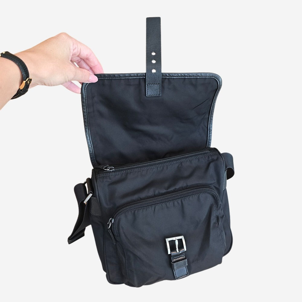 Inspireret af militærets faldskærme, begyndte Prada at arbejde med nylon i 1984. Efter Prada´s relancering af nylon-taskerne, er de gamle vintage tasker blevet et hit igen. Denne taske er fremstillet i nylon og er udsmykket med spænde samt deres berømte mærkevarelogo. Tasken har et stort og rummeligt hovedrum som lukkes med spænde. Den har yderligere en indvendig lynlåslomme samt en udvendig lomme. Tasken er ideel for alle og kan justeres i stofremmen, så den kan bæres både som skuldertaske og crossbody. Perfekt til hverdag, arbejde, skole eller rejser. Tasken er unisex og er fantastisk til både mænd og kvinder.
