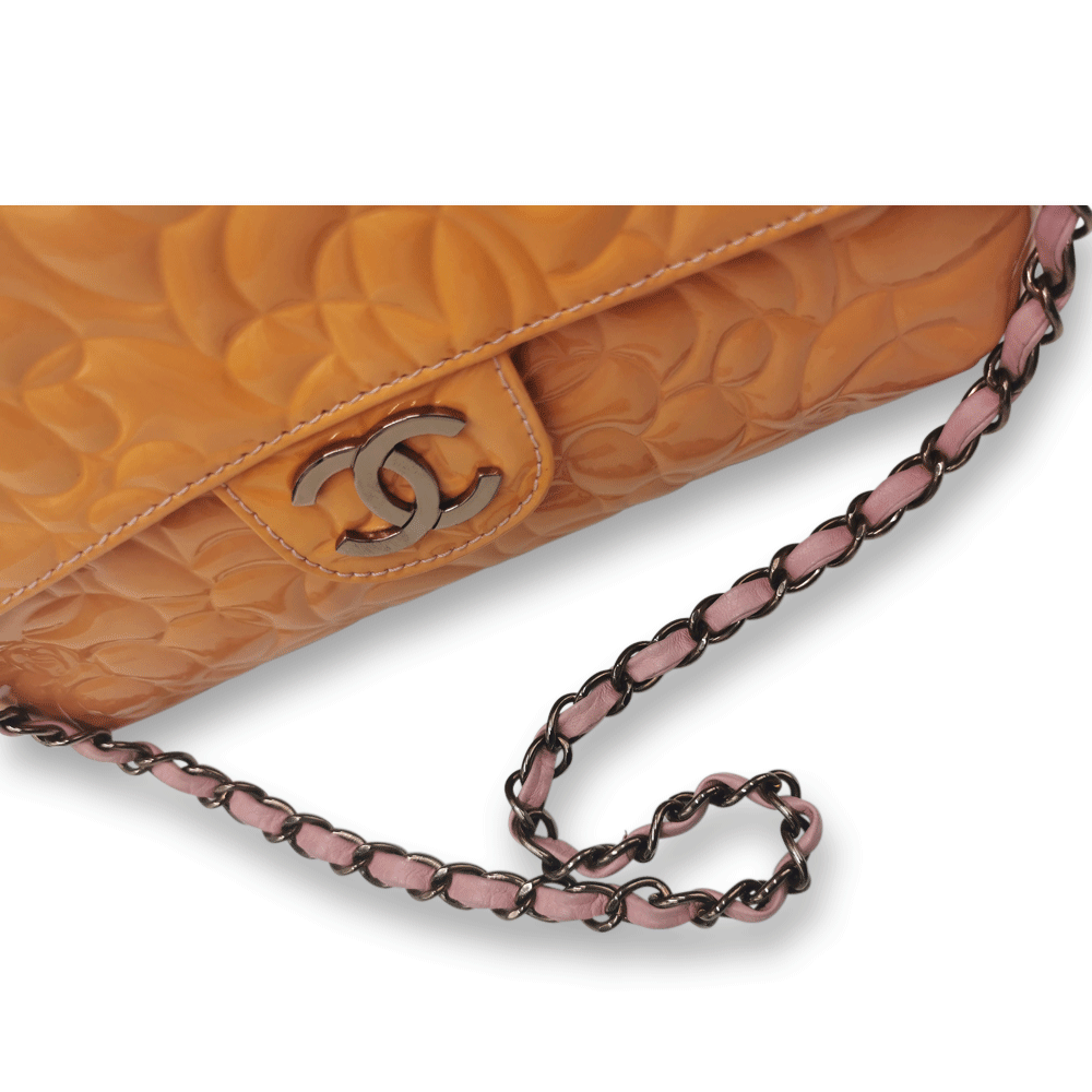Orange Camellia patent flap bag