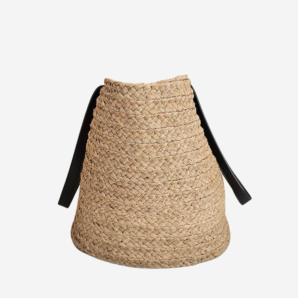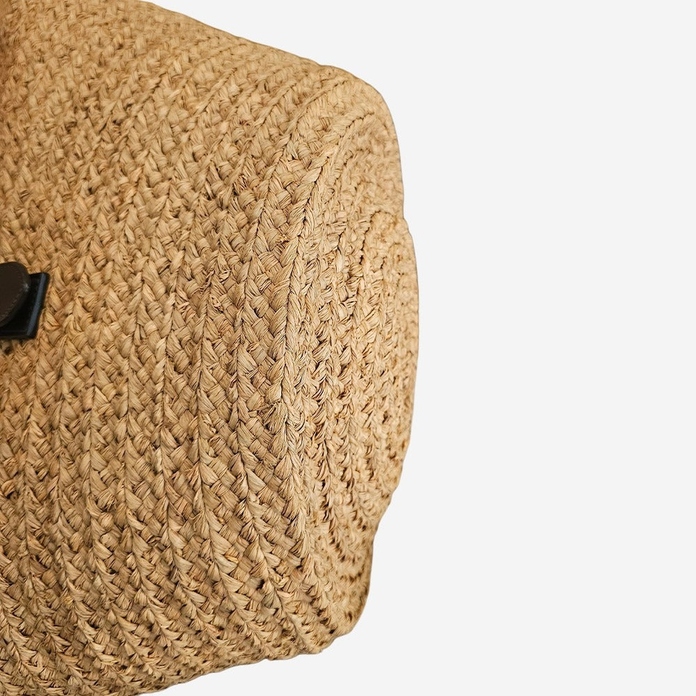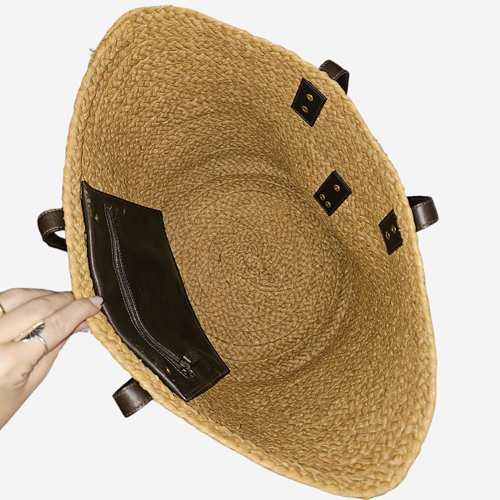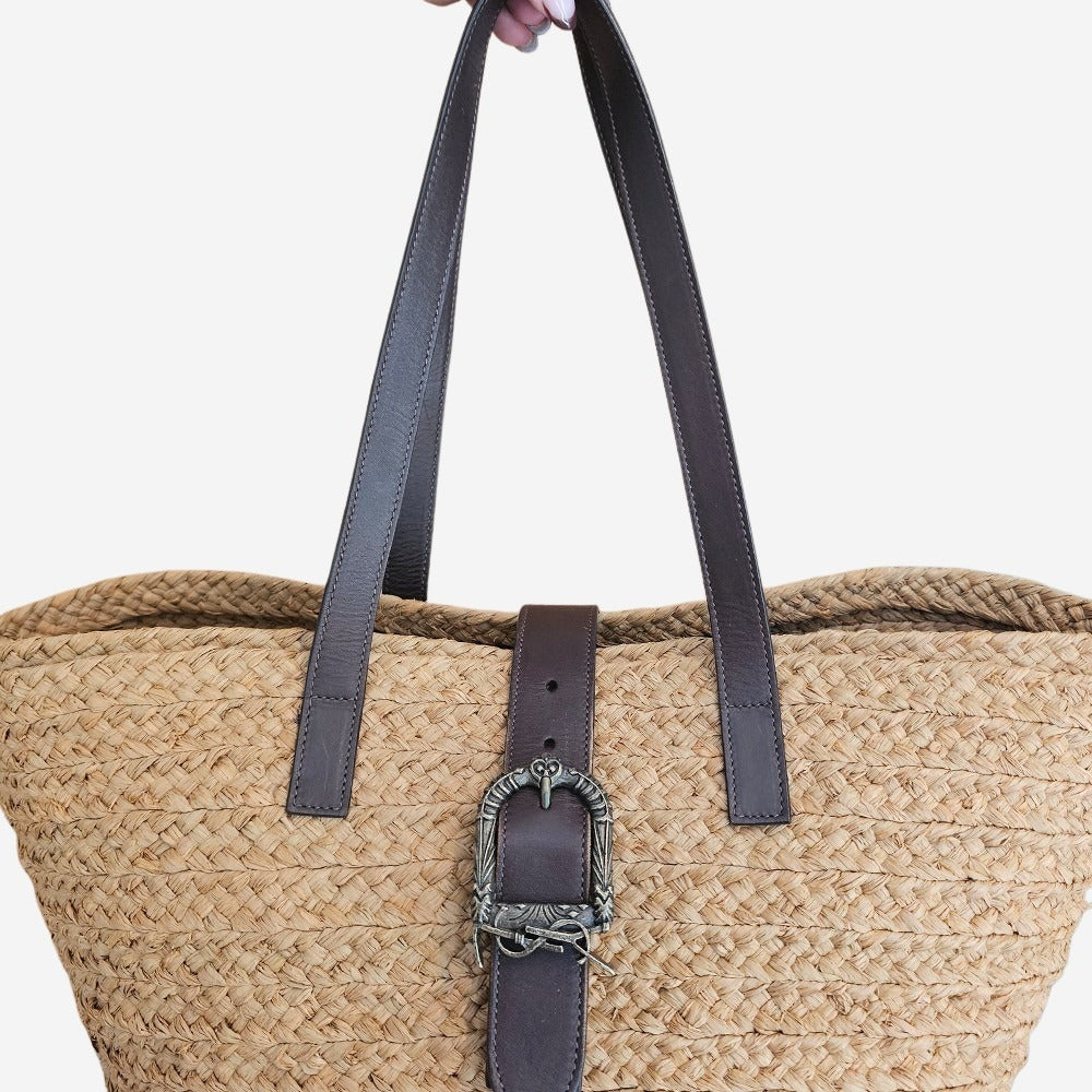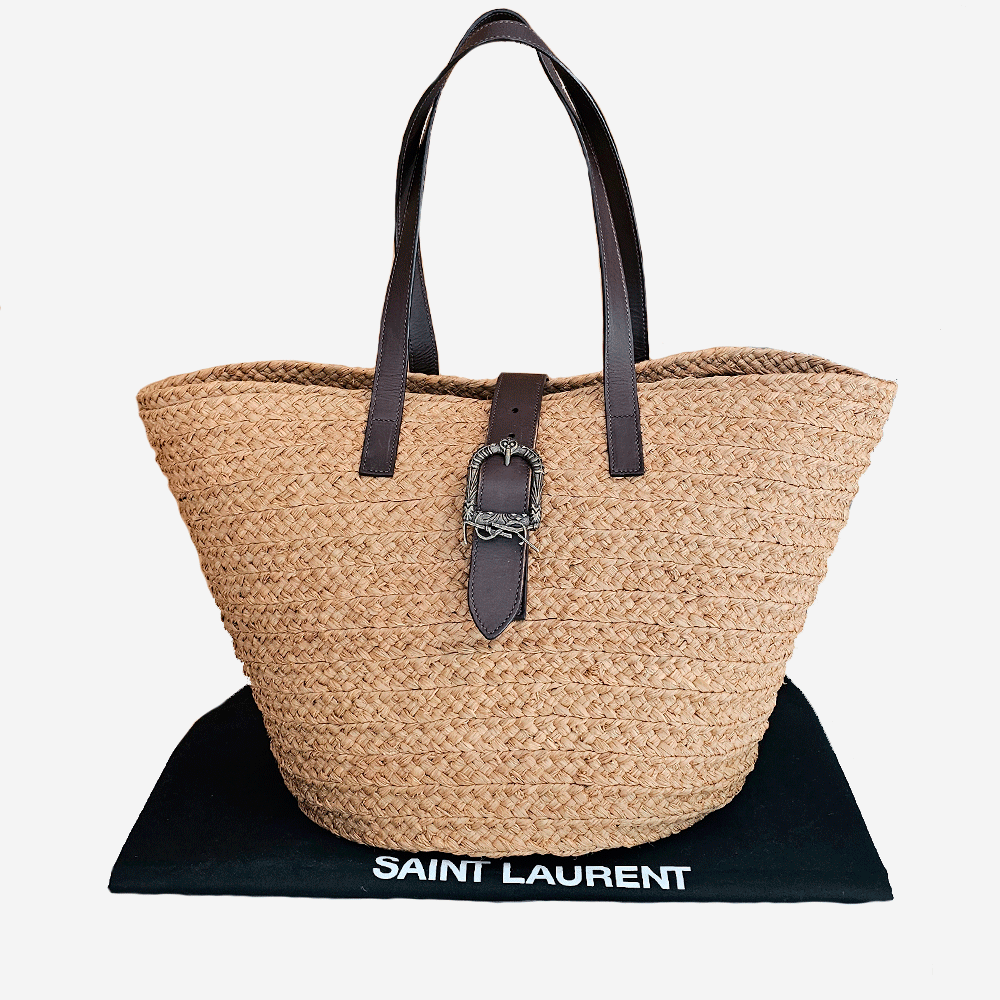 Denne smukke YSL taske er en eksklusiv sommerfavorit  som er flettet i naturlig raffia og designet med en rummelig og vifteformet silhuet, der giver en behagelig og afslappet stemning, præcis som en ferie skal være. Tasken har en åben top som lukkes med en smuk læderrem og et elegant metalspænde som viser det ikoniske YSL-logo. Tasken rummer nemt et strandhåndklæde, en vandflaske, sandaler mm. Desuden er der en indvendig lynlåslomme som kan bruges til dine løse genstande som telefon, nøgle og pung. Det perfekt valg til solrige dage, hvor klasse og lethed går hånd i hånd.