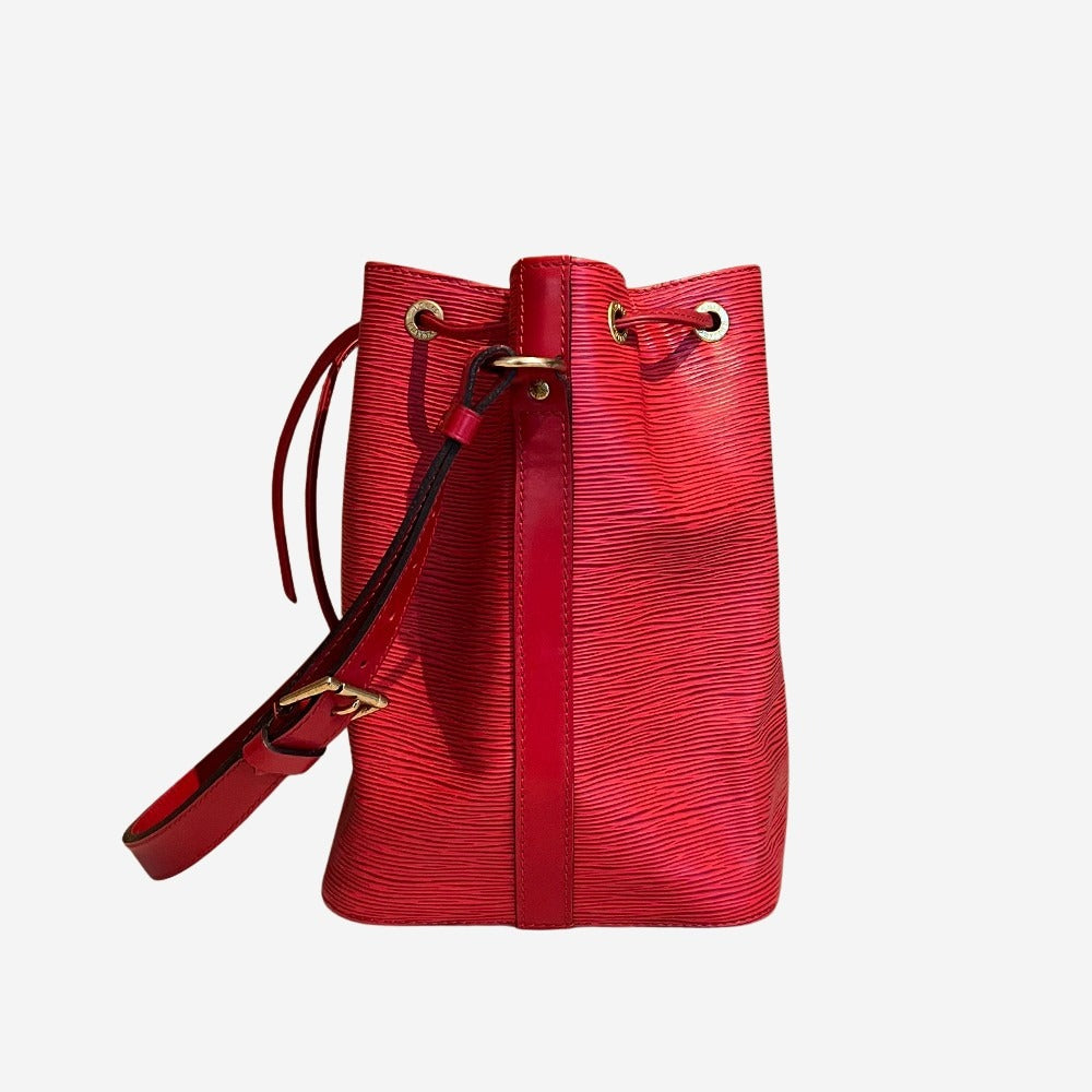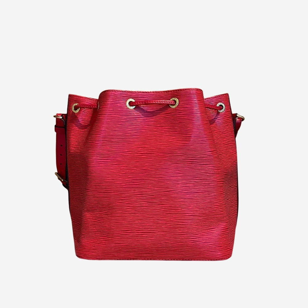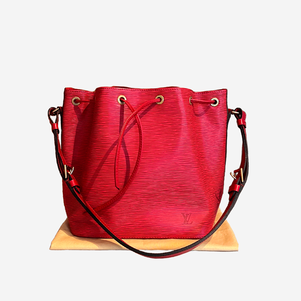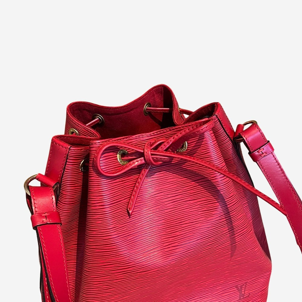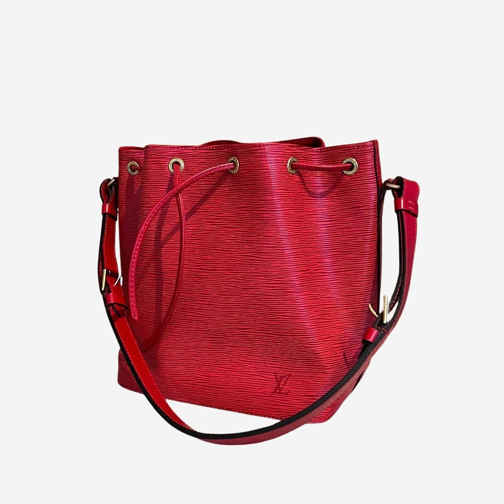 Noé blev introduceret i 1932, da en champagneproducent bestilte designet for elegant at kunne transportere champagneflasker. Noé kan stadig i dag indeholde 5 flasker champagne. Petit Noé er familiens lillesøster. Den kan dog ikke indeholde 5 flasker, men rummer stadig alle dine hverdagsfornødenheder. Tasken er fremstillet af Louis Vuittons smukke og riflede epi læder med læderrem samt detaljer i rødt læder. Tasken har et stort hovedrum.