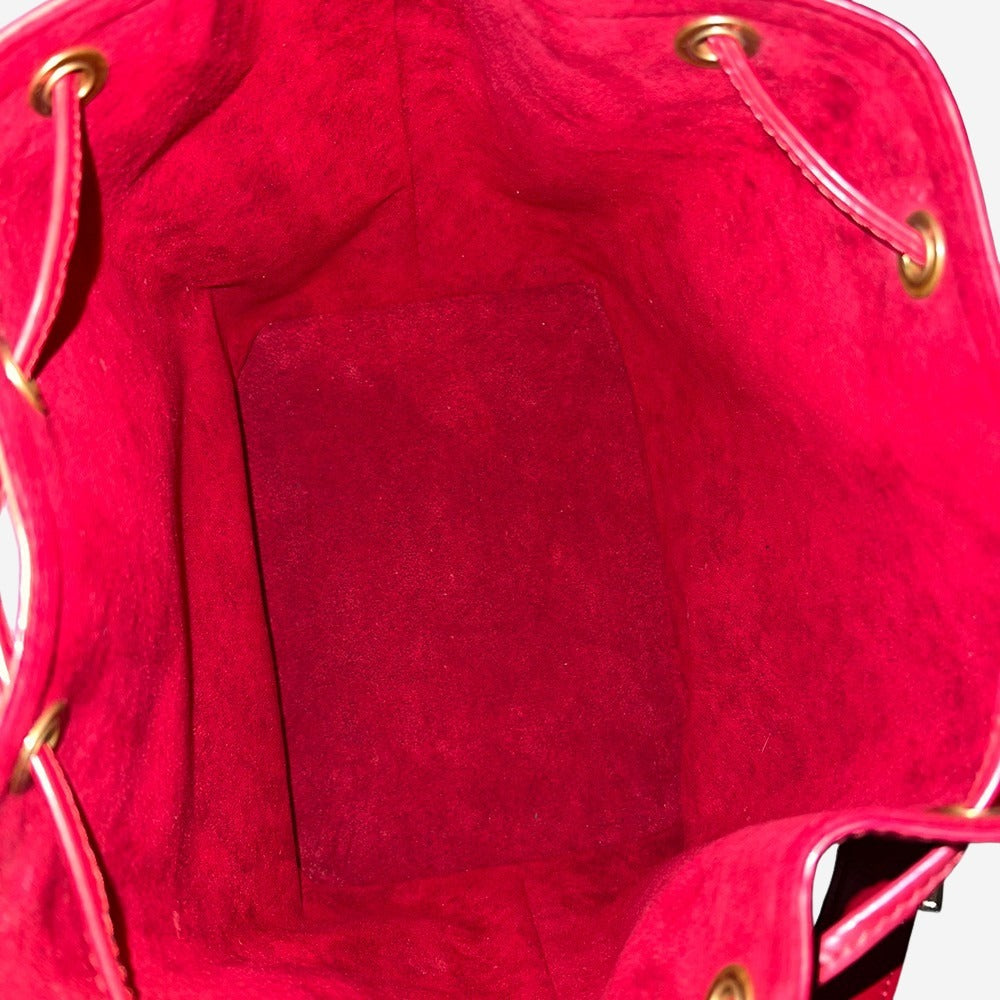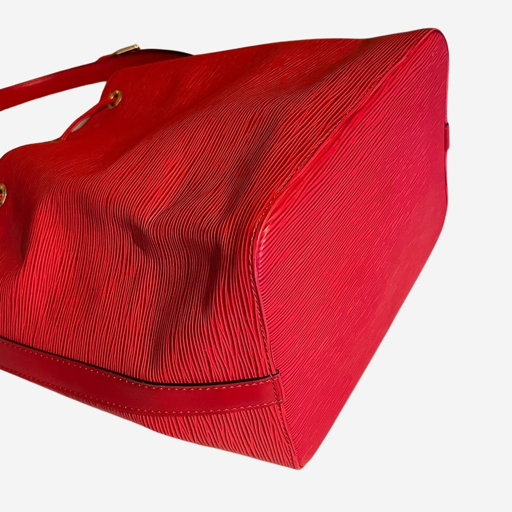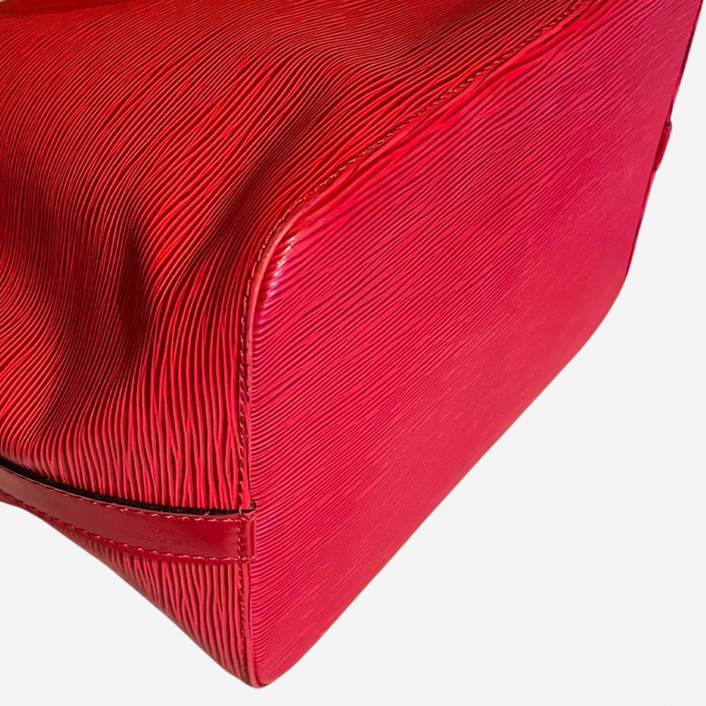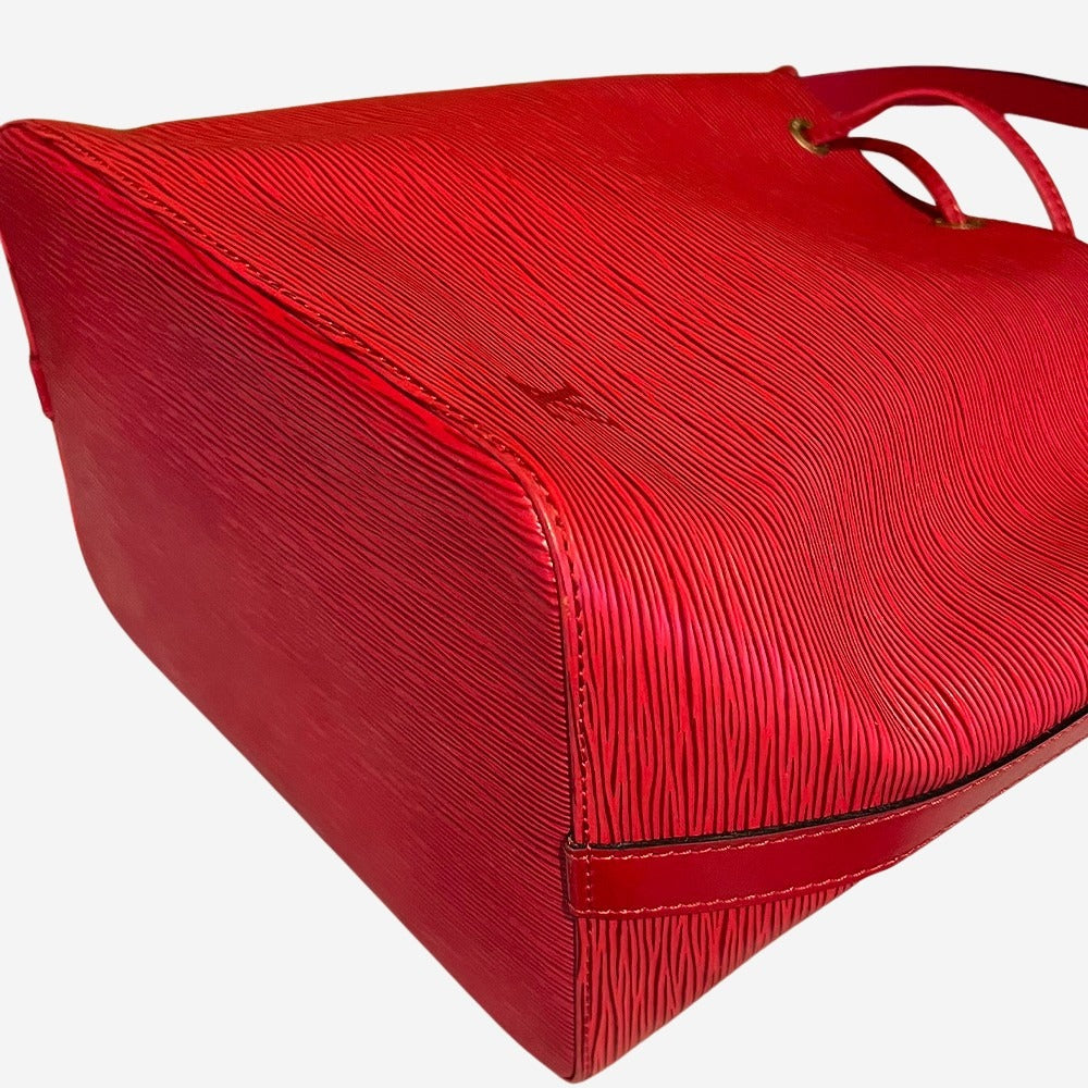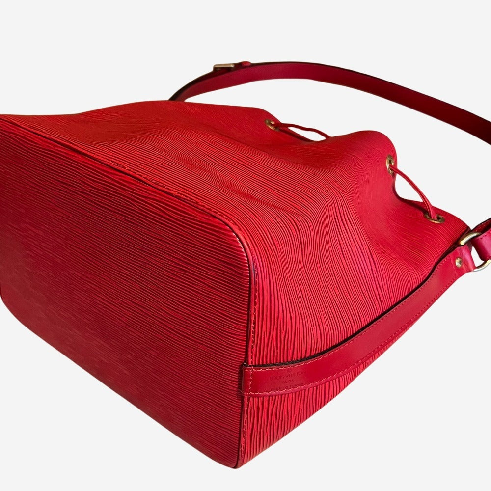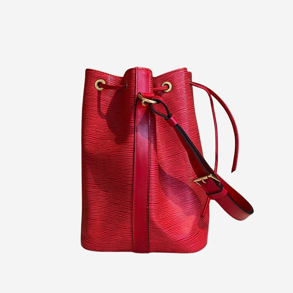 Noé blev introduceret i 1932, da en champagneproducent bestilte designet for elegant at kunne transportere champagneflasker. Noé kan stadig i dag indeholde 5 flasker champagne. Petit Noé er familiens lillesøster. Den kan dog ikke indeholde 5 flasker, men rummer stadig alle dine hverdagsfornødenheder. Tasken er fremstillet af Louis Vuittons smukke og riflede epi læder med læderrem samt detaljer i rødt læder. Tasken har et stort hovedrum.