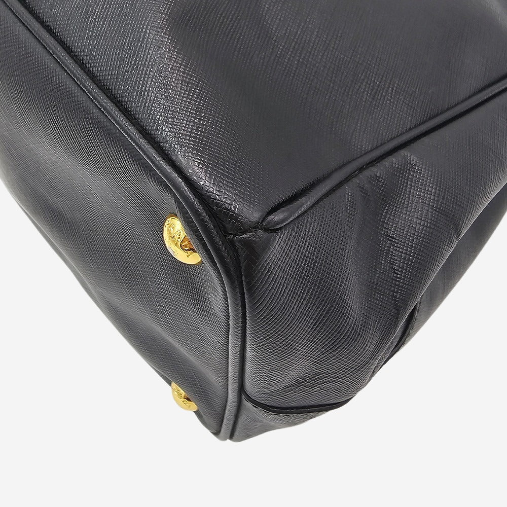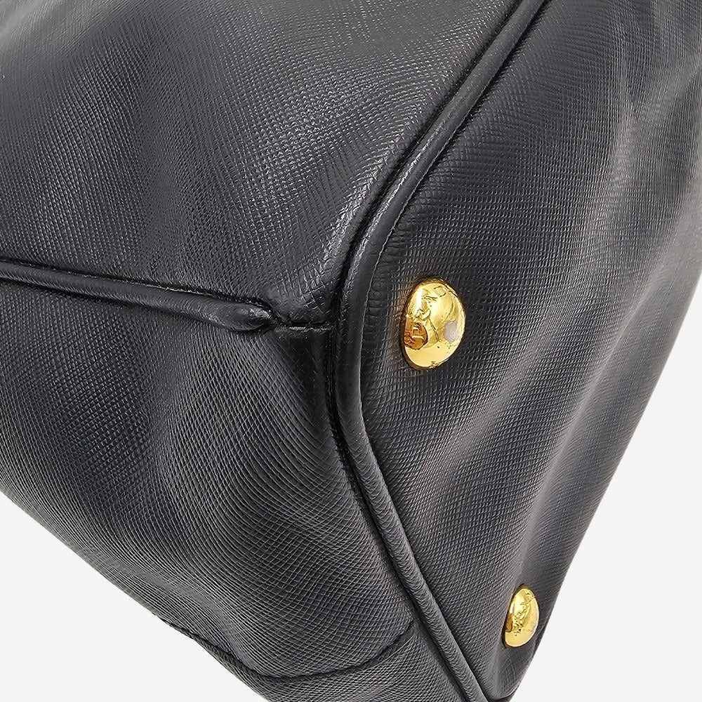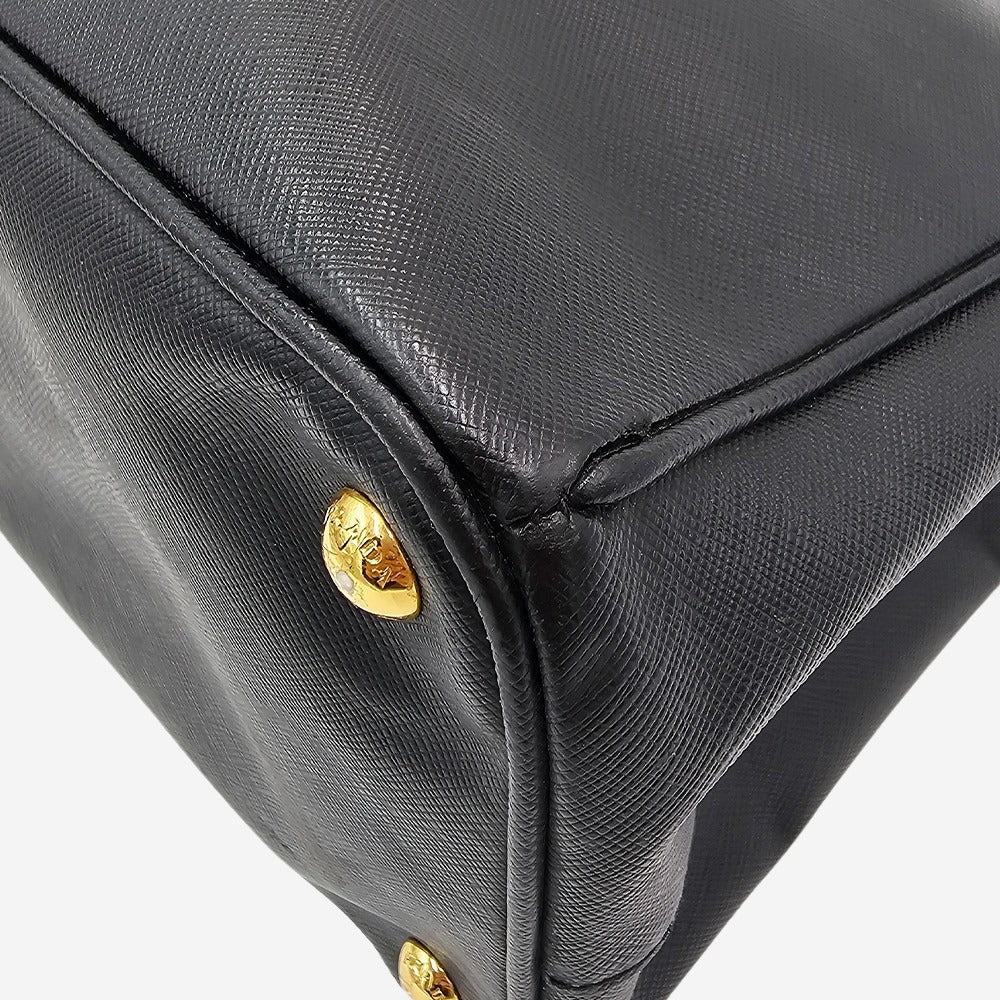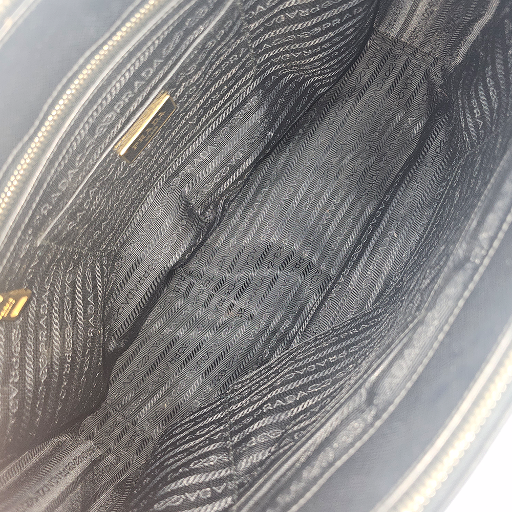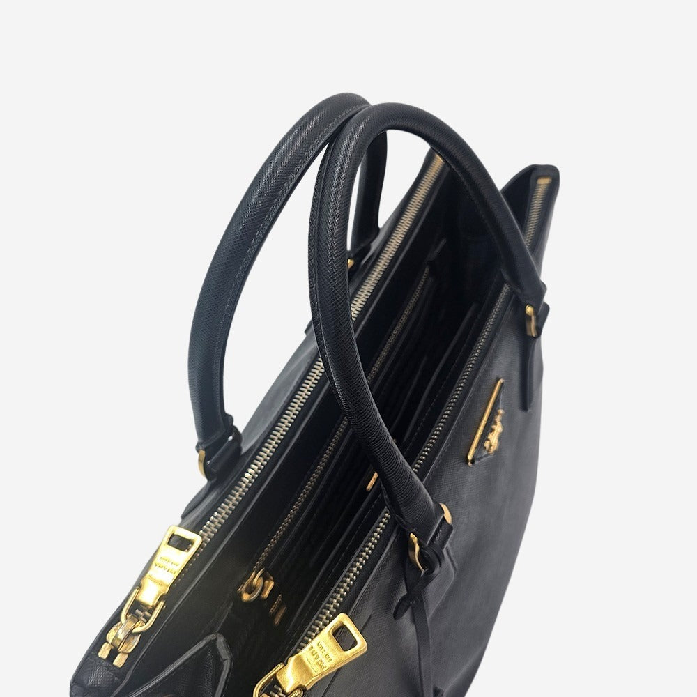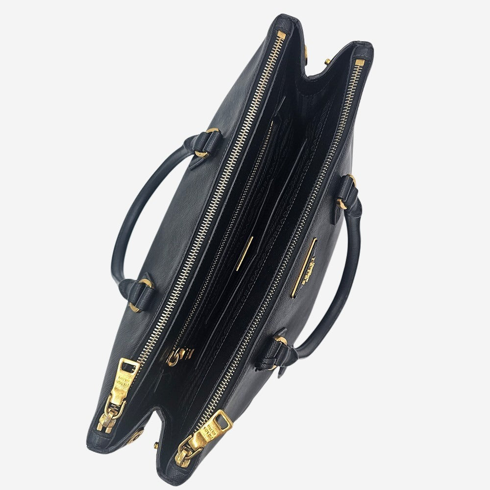 Prada Galleria blev lanceret i 2007 og har siden etableret sig som et ikonisk design fra det anerkendte italienske modehus. Tasken er fremstillet af det holdbare og elegante saffiano-læder i sort samt smukke gulddetaljer, der tilføjer et eksklusivt præg. Tasken er funktionel med sine to store hovedrum, ét stort rum i midten til f.eks. computer, samt en lille sliplomme plus endnu en lynlåslomme. Tasken her, er altså perfekt til at kunne rumme alle hverdagens fornødenheder plus meget mere. Den perfekte taske til arbejde eller skole.
