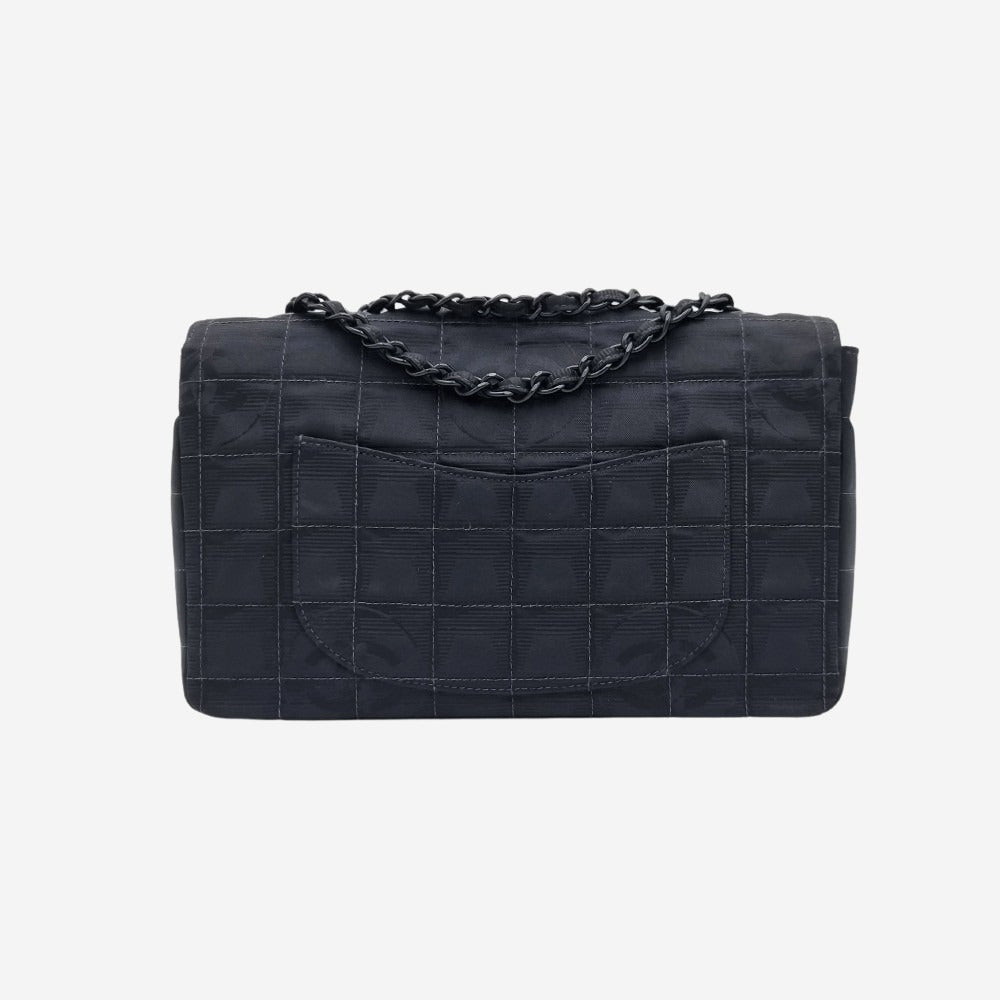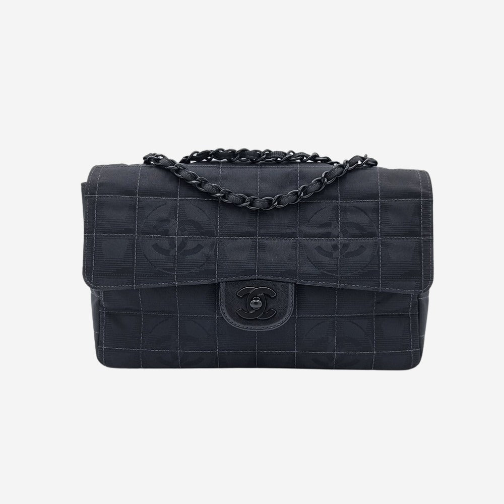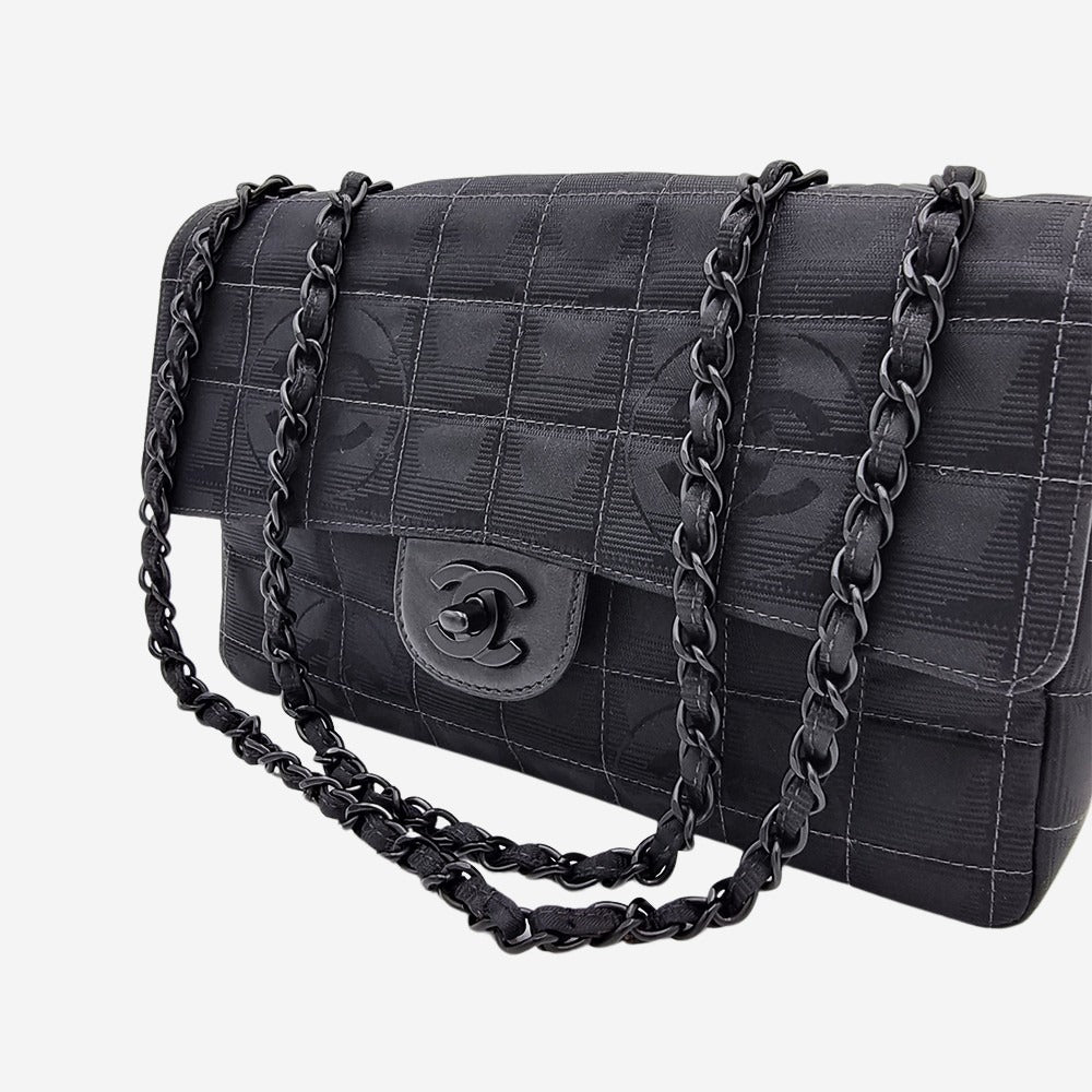 Chanels oprindelige "Travel line" kollektion blev udgivet i 1990’erne. I 2002 relancerede de serien og kaldte den for "New Travel Line". Alle modellerne i denne serie er kendetegnet ved deres lethed og materialet i nylon som er printet med CC-logoet. Denne sjældne og cool model minder utroligt meget om den klassiske single flap bag, hvori den store forskel ligger indvendigt i rumfordelingen. Hvor den klassiske flap kun har sliplommer, har denne model også en praktisk lynlåslomme. Hovedrummet kan indeholde alle dine hverdagsfornødenheder såsom pung, telefon, solbriller samt nøgler.