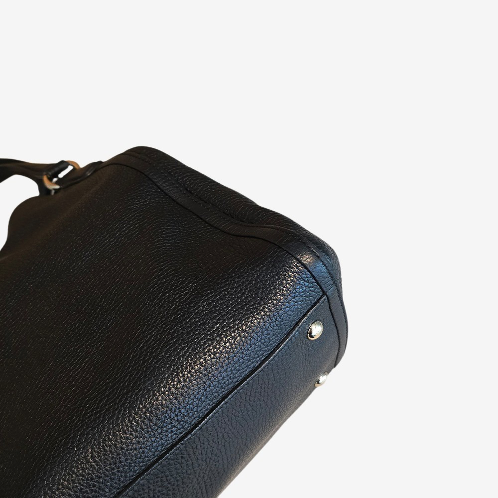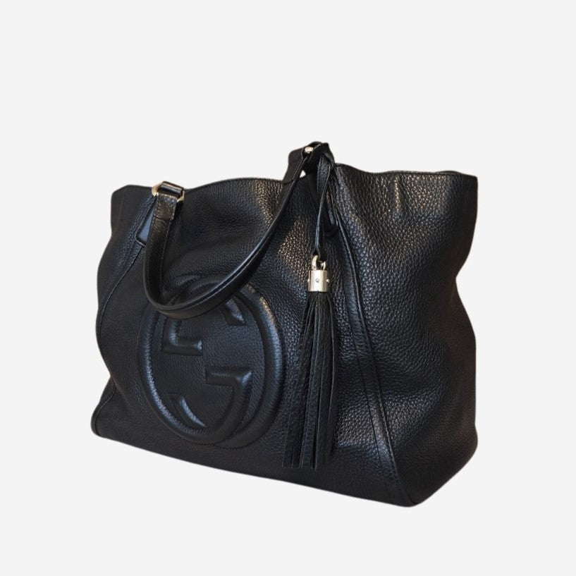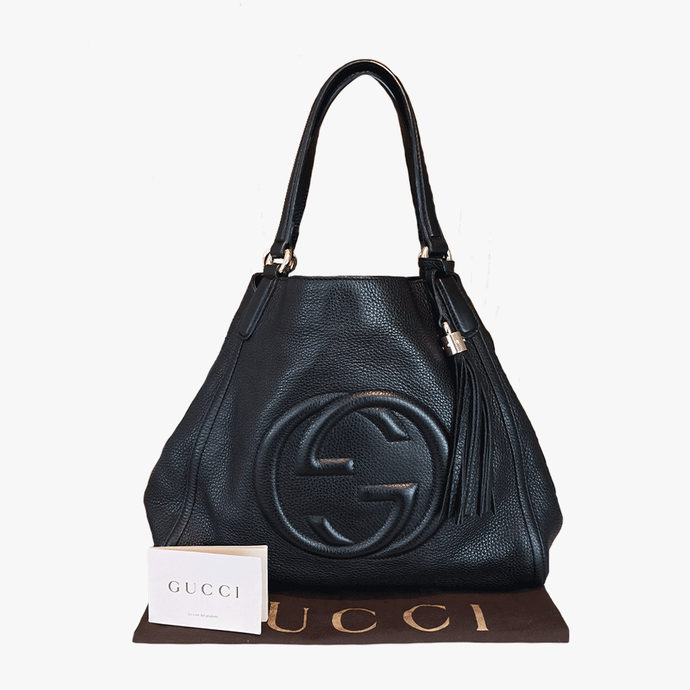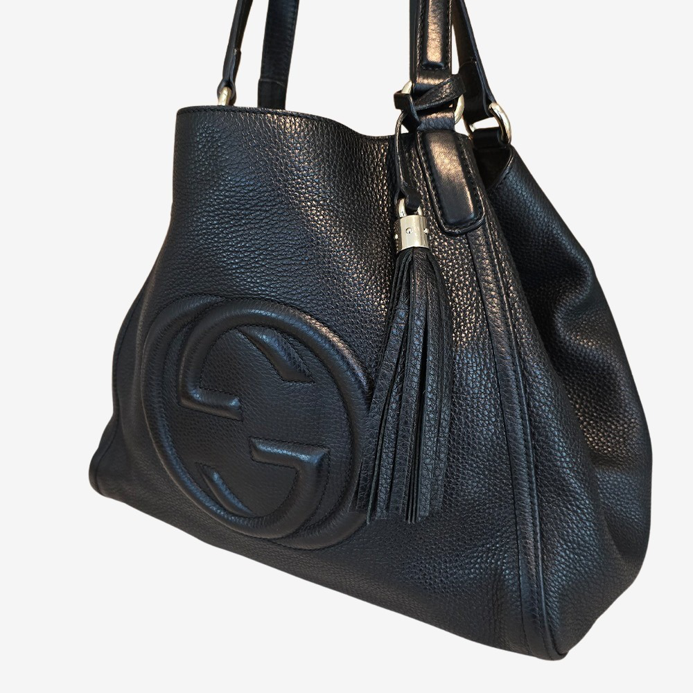 Denne populære Gucci Soho Tote er fremstillet af sort blødt læder i højeste kvalitet, med husets ikoniske GG logo på front, guld hardware samt dobbelte tophåndtag med en flot dekorativ lædertassel. Tasken har et stort og rummeligt hovedrum, som bliver lukket med karabinhage. Tasken kan nemt indeholde både computer og alle hverdagsfornødenheder. Derudover findes en indvendig lynlåslomme samt to sliplommer. Brug tasken med karabinhagen lukket, og få et mere slankt udtryk eller brug tasken uden, for et mere afslappet look samt større rummelig. Denne klassiker bliver hurtigt din go-to skole, hverdags eller arbejdstaske.