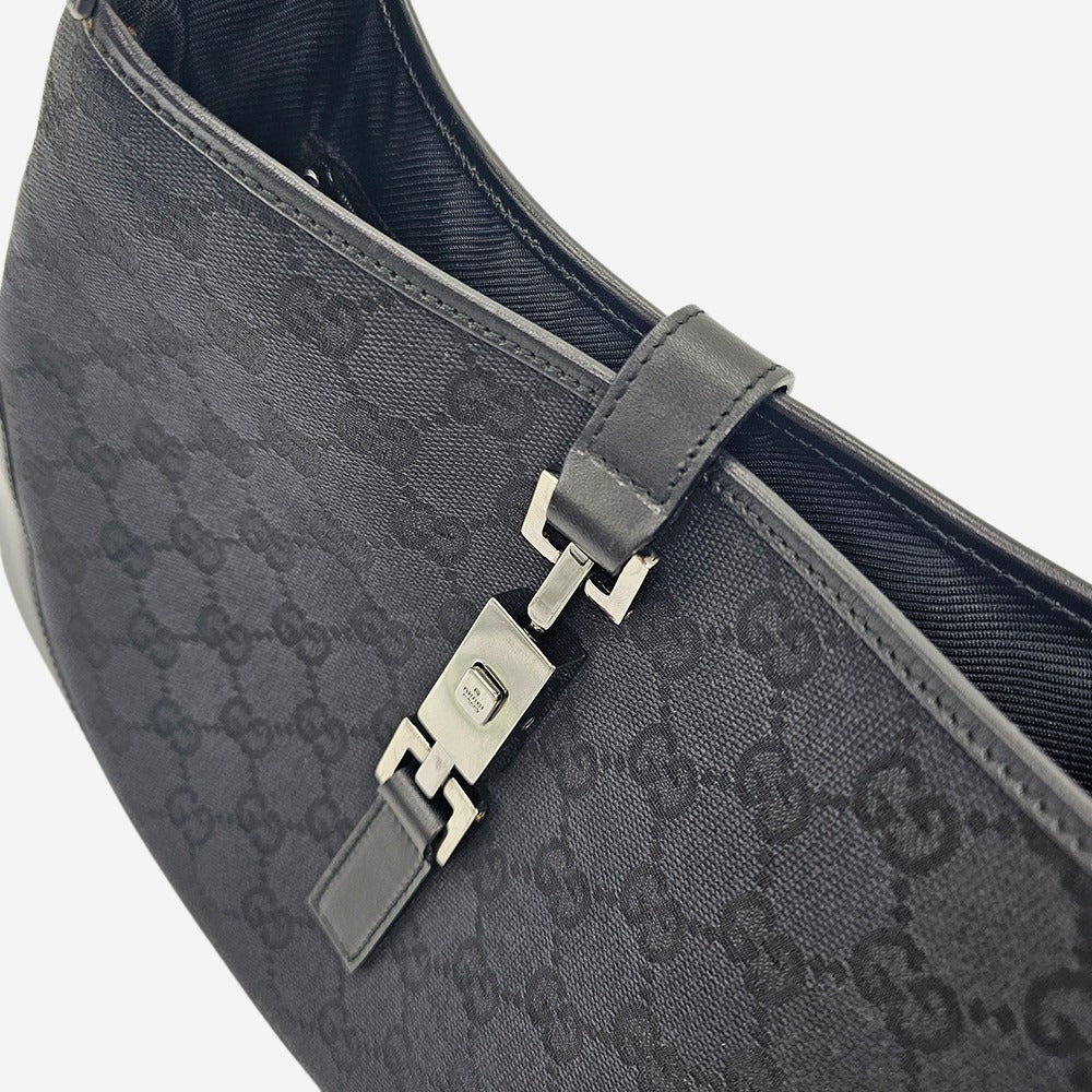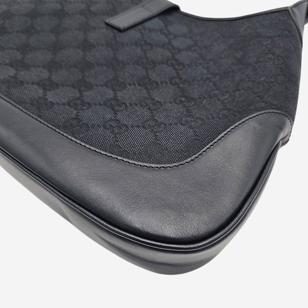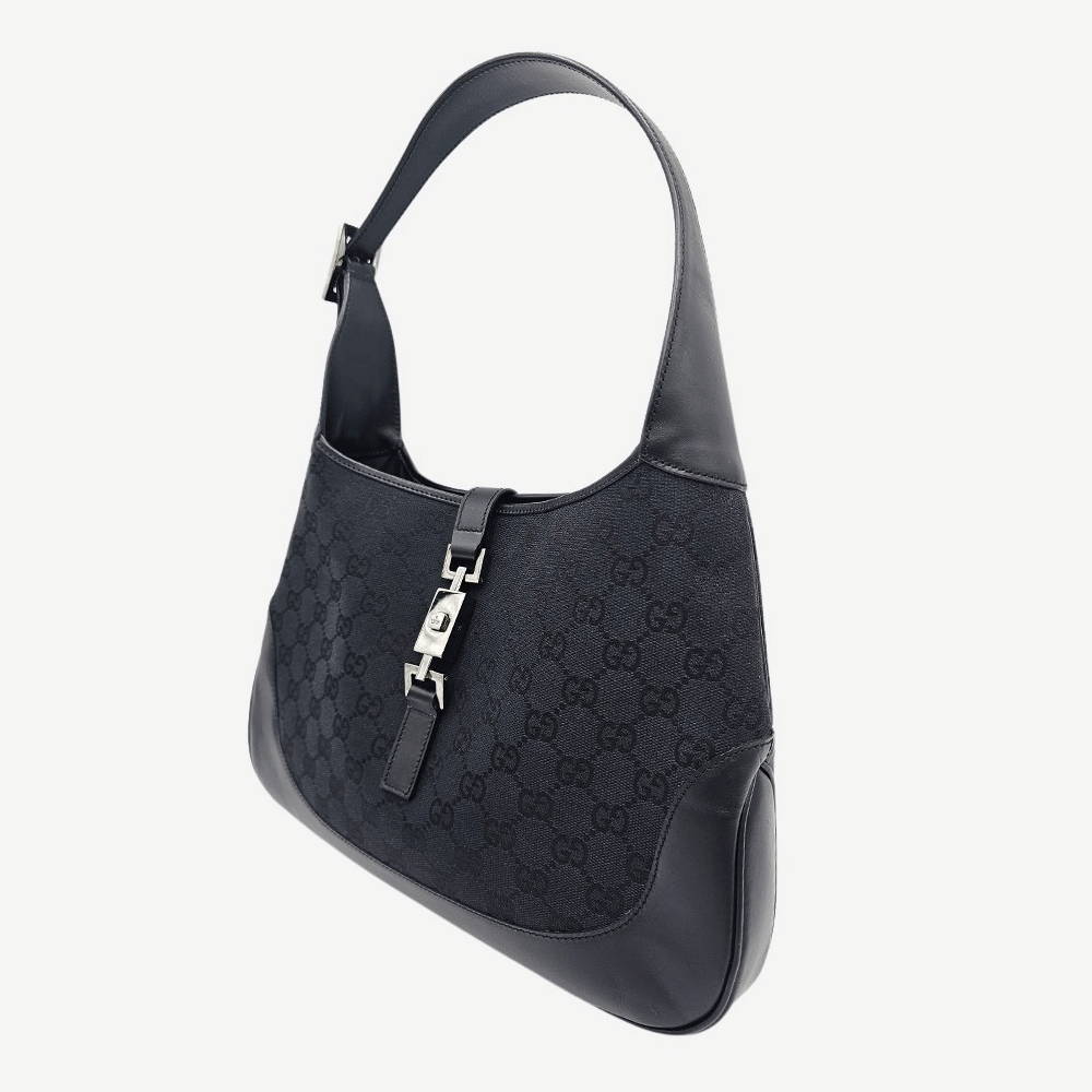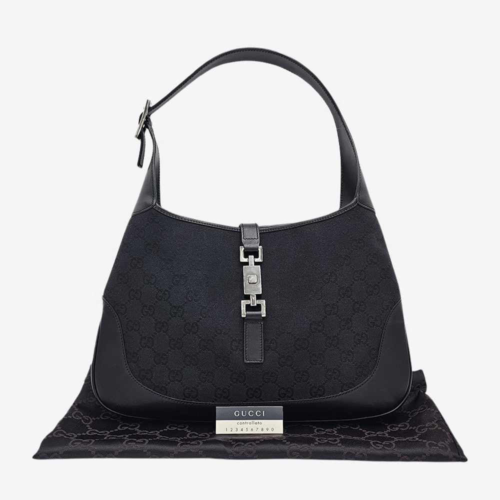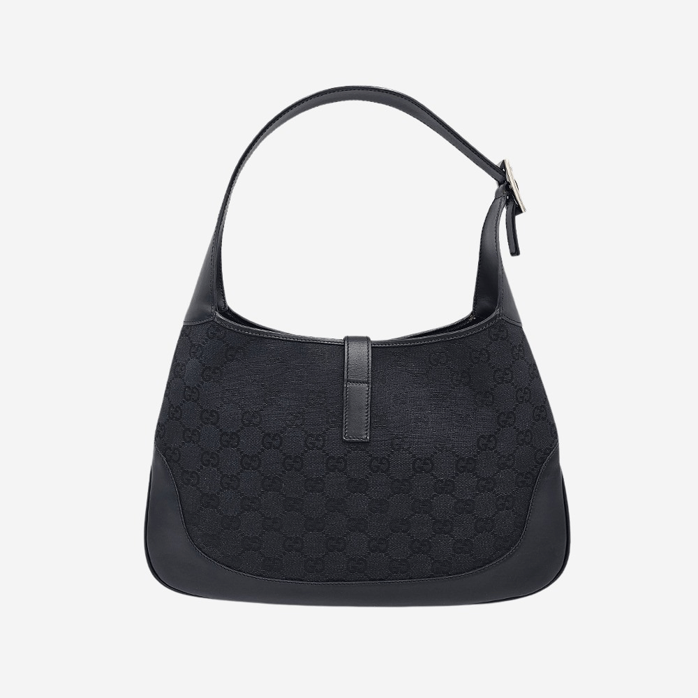 Jackie tasken blev introduceret af Gucci i 1961. Siden har tasken opnået sin popularitet og slået sit navn fast i modeverdenen med hjælp fra Jacqueline Kennedy Onassis. Hun blev ofte spottet med tasken og den blev derfor hurtigt kendt som hendes yndlingstaske. Efterfølgende fik den sit nye navn efter hende. Jackie er gennem tiden blevet designet i et utal af farver samt materialer og fås stadig hos Gucci den dag i dag. Denne skønne Jackie er fremstillet i sort canvas med sorte læder detaljer. Den rummer alle dine hverdagsfornødenheder plus det ekstra såsom telefon, pung, nøgler, solbriller, vandflaske mm. Tasken har yderligere en indvendig lynlåslomme.