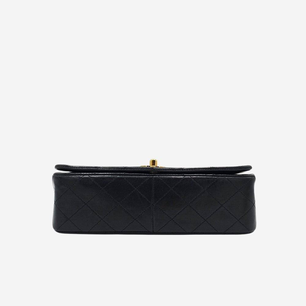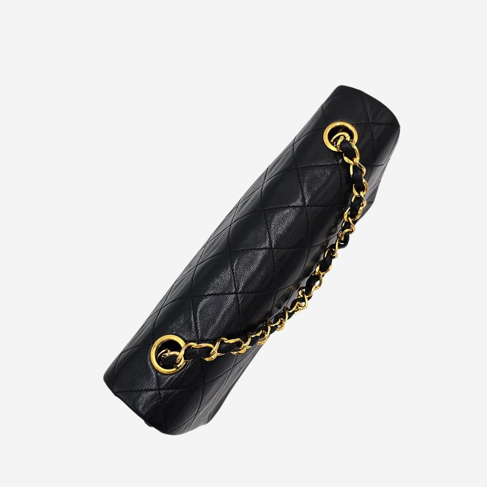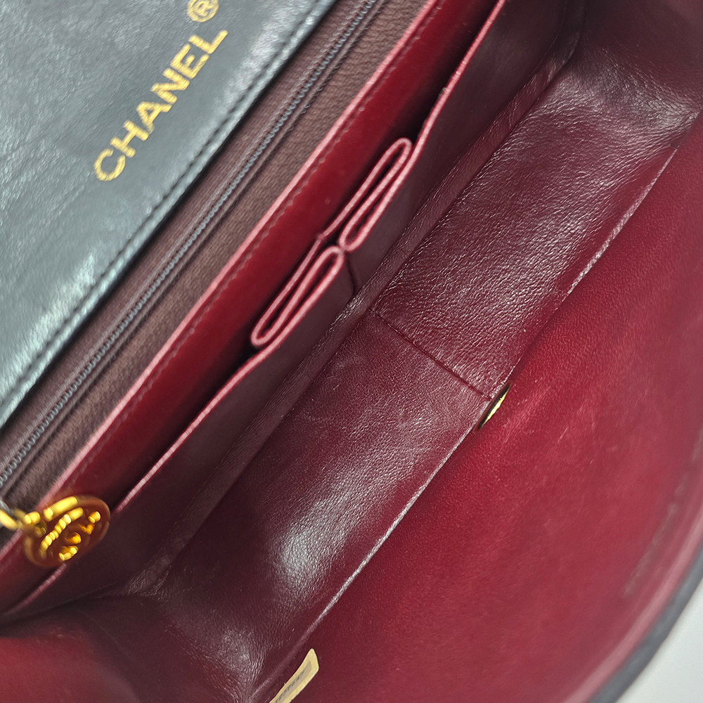 Denne meget smukke og unikke vintage flap er helt tilbage fra serienummerets spæde start. Den er fremstillet i utroligt slidstærkt lammeskind, 24 karat guldbelagt hardware og med det klassiske bordeaux læderinteriør. Taskens hovedrum kan indeholde pung, telefon, solbriller samt nøgler. Derudover har den yderligere 1 indvendig lynlåslomme samt 3 små sliplommer. Den perfekte crossbodytaske til både hverdag og fest.