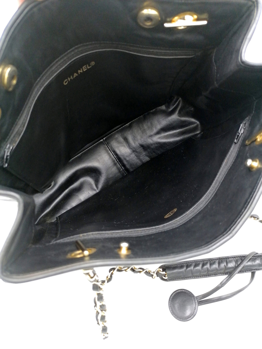 Denne Tote fra Chanel er fremstillet i det blødeste Quilted lammeskind med guld hardware. Tasken har et stort og rummeligt hovedrum med to indvendige lynlåslommer. Derudover har den yderligere 2 udvendige sliplommer. Tasken kommer med den fine og luksuriøse CC-charm i læder og guld.