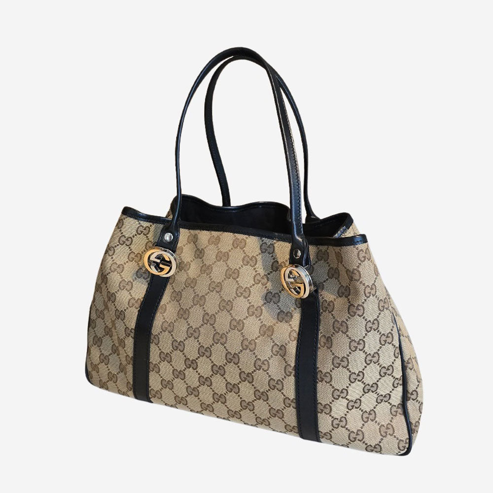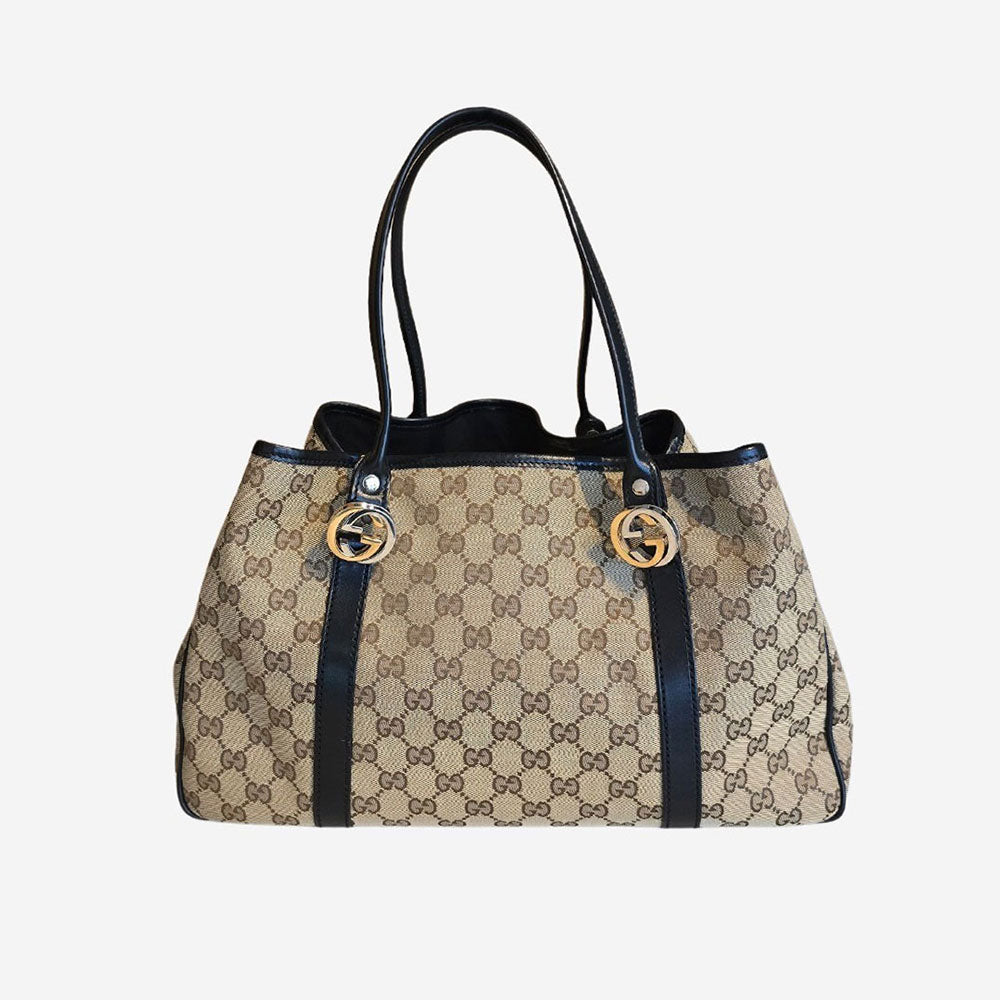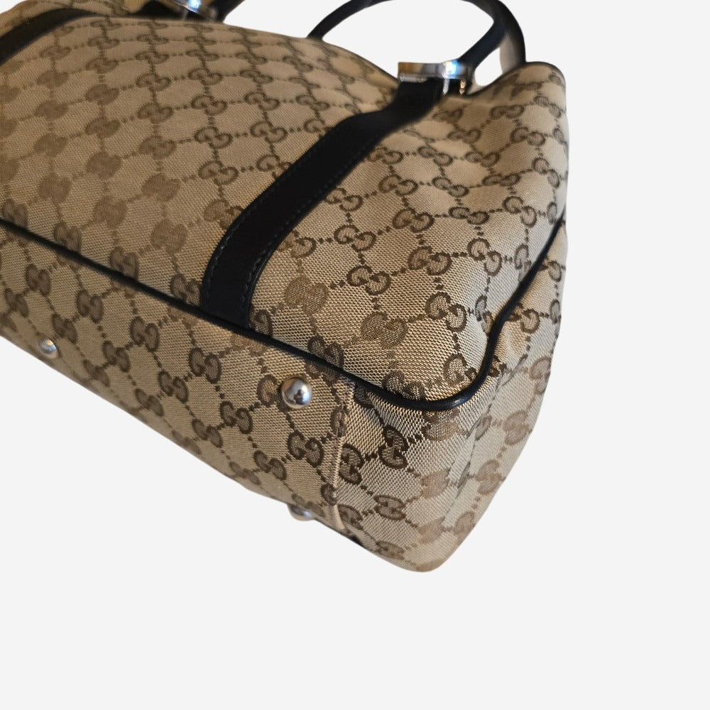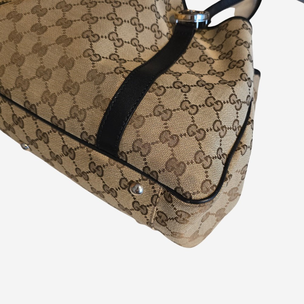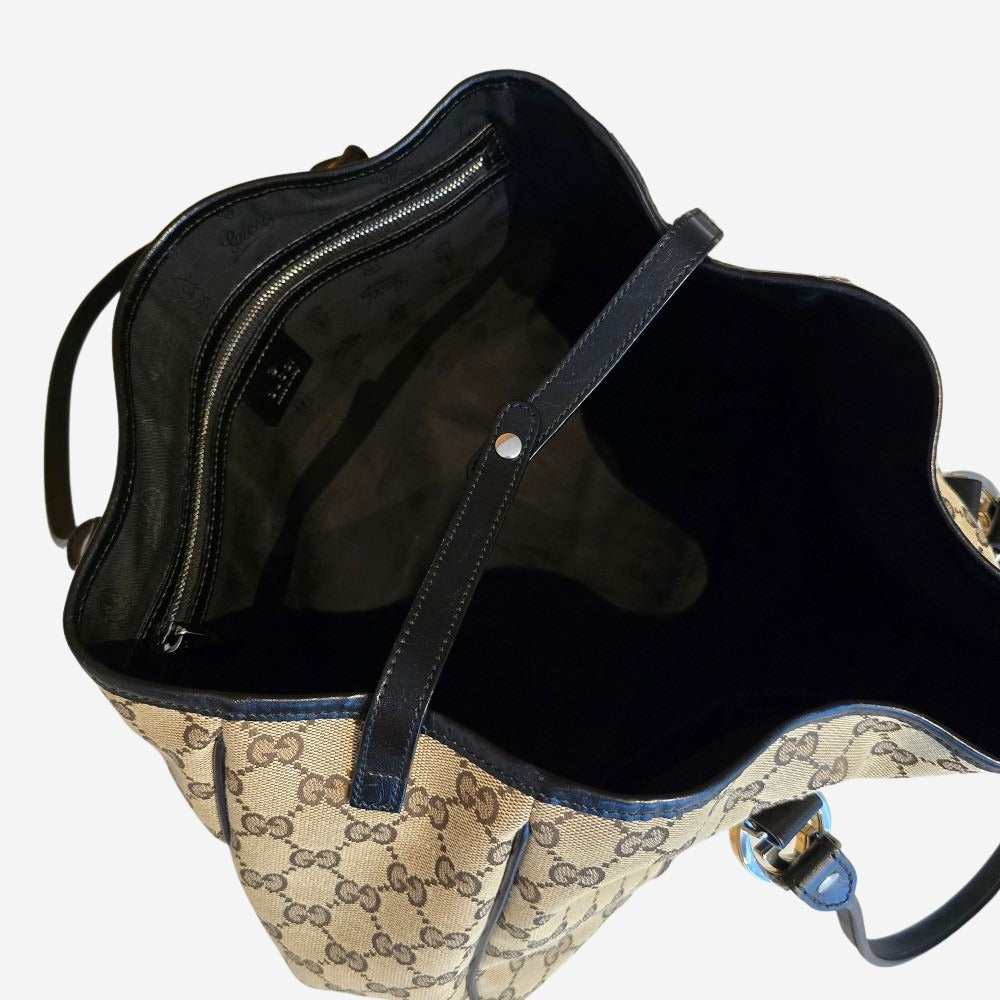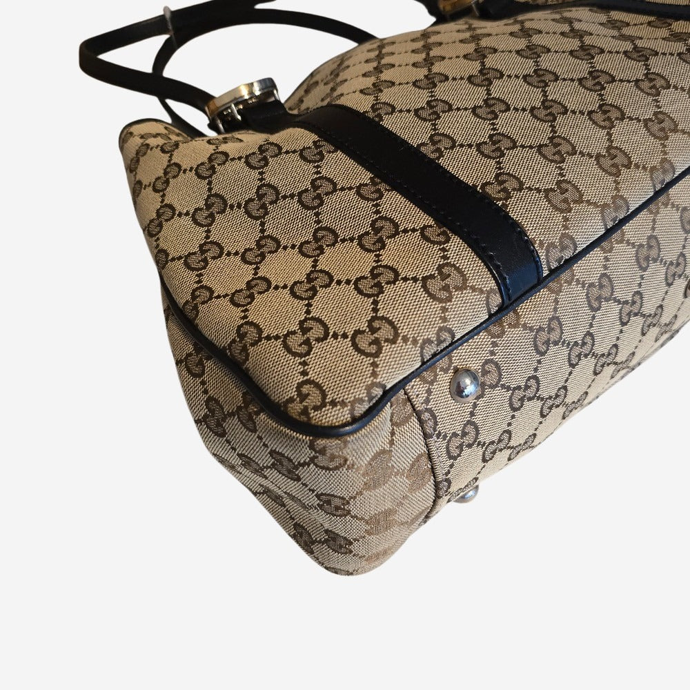 Denne cool vintage tote fra Gucci er fremstillet i deres kendte GG monogram mønster med sorte læderdetaljer og GG-logoer i guld og sølvtoner på begge sider af læderskulderremmen. Denne skønhed har et rummeligt hovedrum og kan indeholde alle dine daglige fornødenheder med stil.