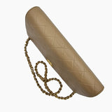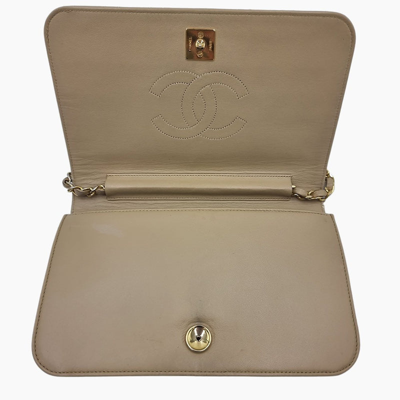 Denne meget smukke og unikke vintage flap bag, er helt tilbage fra serienummerets fødeår, 1986. Den er fremstillet i utroligt slidstærkt læder med ægte 24 karat guldbelagt hardware og beige læderinteriør. Nogle kalder denne model, for den tidlige udgave af WOC (Wallet on chain), som er Chanels populære bud på taske, clutch og pung i et. Denne full flap er nemlig designet på samme måde, med kæden som kan foldes på utallige måder og derfor kan denne også bæres både over skulderen, som crossbody eller i hånden som clutch/pung ved at gemme kæden usynligt indeni. Taskens hovedrum kan indeholde pung, telefon samt nøgler plus det løse. Derudover har den yderligere 1 indvendig lynlåslomme. Den perfekte crossbody taske til både hverdagen og festen.