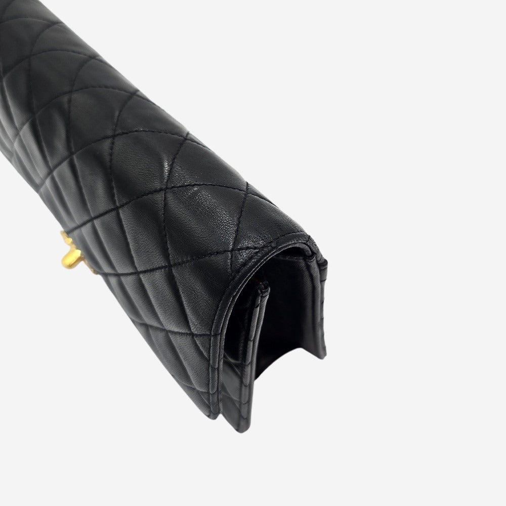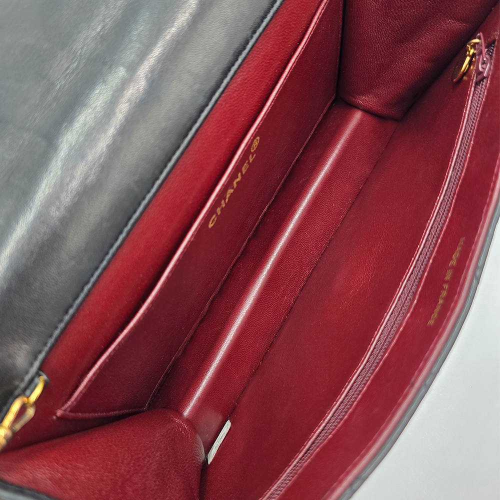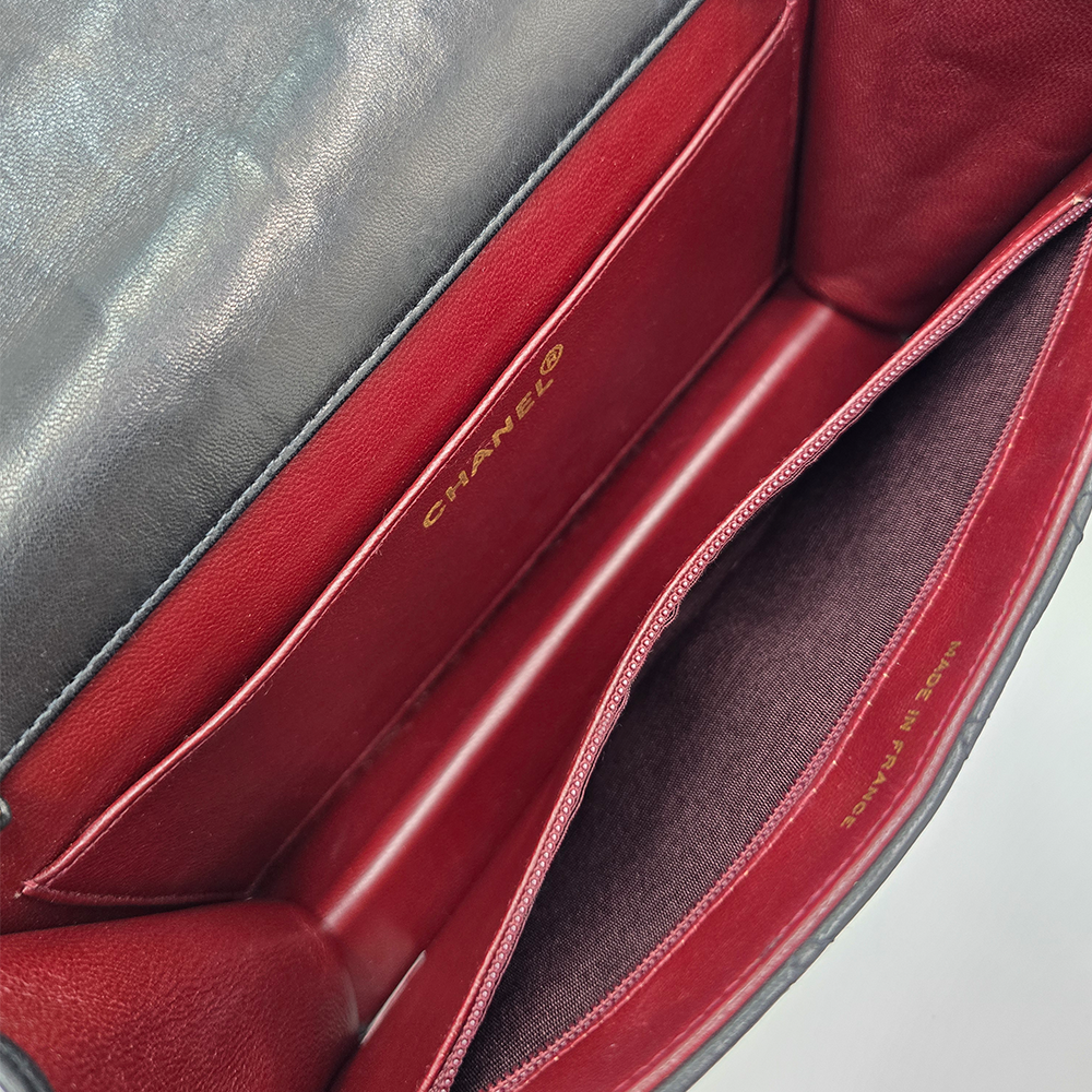 Denne utrolig smukke vintage taske er en sjælden udgave af den klassiske flap, som nok er Chanels mest kendte og eftertragtede taske. Den har alle de klassiske træk som CC-turnlock, eksklusivt diamant quiltet lammeskind samt det bordeauxfarvede læderinteriør. Dog kommer denne udgave med den sjældne og utroligt smukke guldkæde, som kun er blevet brugt på udvalgte modeller i 80'erne samt 90'erne. Foruden kæden, er denne taske også en smule anderledes i formen samt kommer med kun en enkelt flap fremfor dobbeltflappen, som er mest normalt for den klassiske flap. Taskens hovedrum kan indeholde pung, solbriller, telefon, nøgler mm. Derudover har den yderligere 2 indvendige rum samt 1 udvendig sliplomme. Den kan bæres over skulderen eller som crossbody, og er uden tvivl et ægte samleobjekt for Chanel elskere.