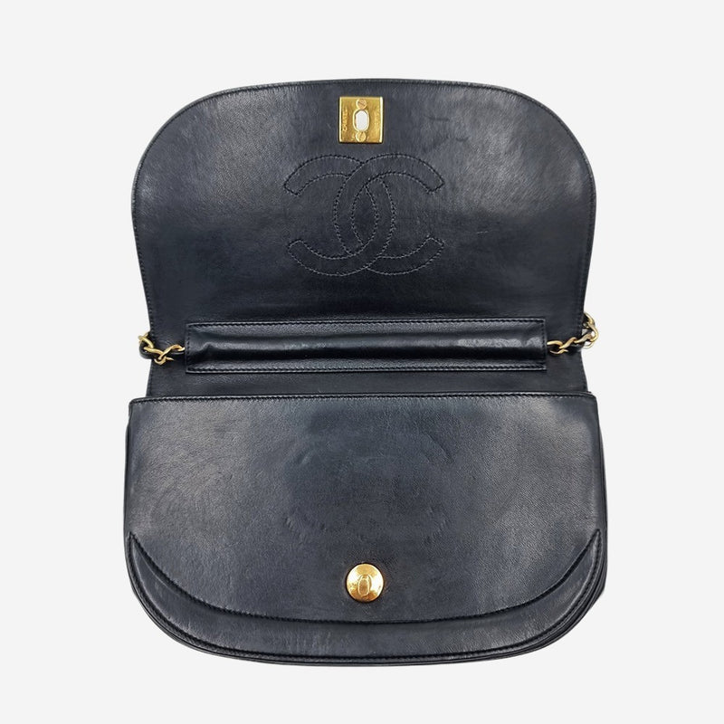 Denne meget smukke, unikke og sjældne vintage half moon flap bag, er fra Karl Lagerfelds spæde år hos Chanel. Tasken er med serienummer, fra det år som han introducerede dem, nemlig i 1986. Den er fremstillet i utroligt slidstærkt kalvelæder, ægte 24 karat guldbelagt hardware og bordeauxfarvet interiør. Taskens hovedrum kan indeholde pung, telefon samt nøgler. Derudover har den yderligere 1 indvendig lynlåslomme. Den perfekte crossbody taske til både hverdagen og festen. Den er desuden designet således at kæden kan gemmes indeni tasken og dermed kan den også bruges i hånden som clutch/pung.