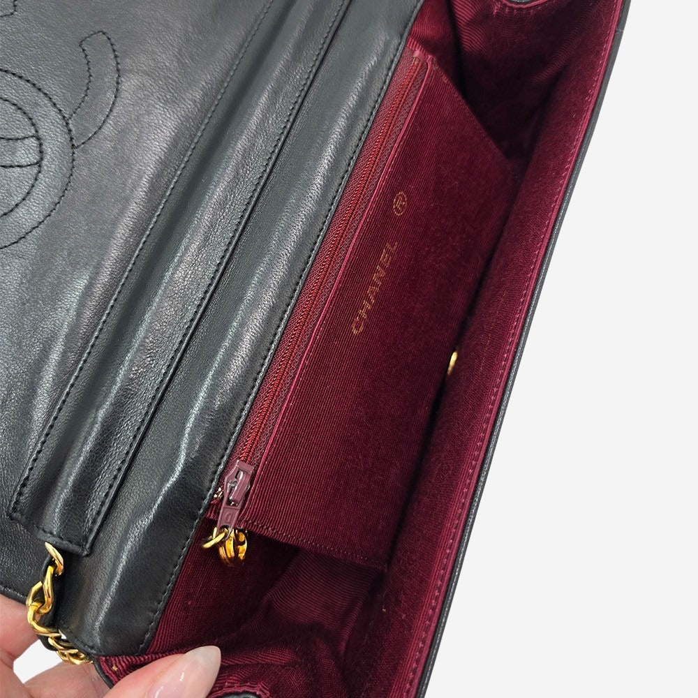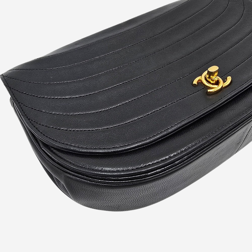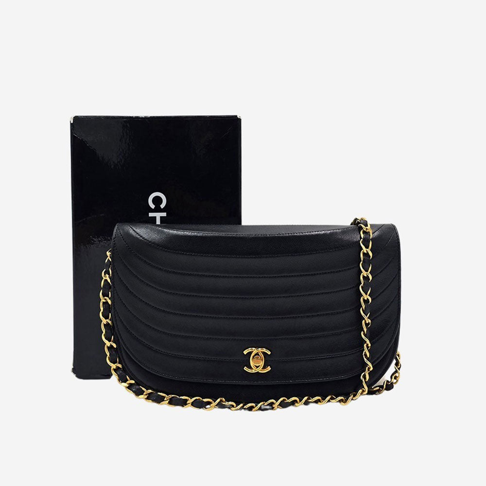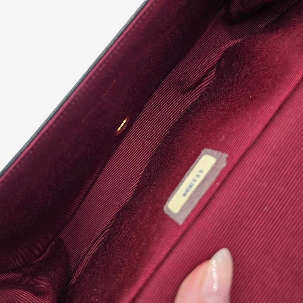 Denne meget smukke, unikke og sjældne vintage halfmoon flap bag, er fra Karl Lagerfelds spæde år hos Chanel og fra serienummerets begyndelse. Den er fremstillet i utroligt slidstærkt kalvelæder, ægte 24 karat guldbelagt hardware og bordeauxfarvet interiør. Taskens hovedrum kan indeholde pung, telefon samt nøgler. Derudover har den yderligere 1 indvendig lynlåslomme. Den perfekte taske til både hverdag og fest. Den er desuden designet således at kæden kan gemmes indeni tasken og dermed kan den også bruges i hånden som clutch/pung.
