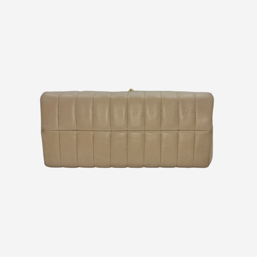 "Diamond quilt" er et af Chanels mest ikoniske designs, men "Mademoiselle quilt" er bestemt helt unik. Som erstatning for de diamantformede syninger er lodrette linjer quiltet over hele denne smukke vintage crossbody taske. Denne meget smukke og unikke vintage flap bag, er fremstillet i utroligt slidstærkt læder med ægte 24 karat guldbelagt hardware og i den fineste sand farve. Taskens hovedrum kan indeholde pung, telefon, solbriller samt nøgler. Derudover har den yderligere 1 indvendig lynlåslomme samt indvendig sliplomme. Den perfekte crossbody taske til både hverdagen og festen.