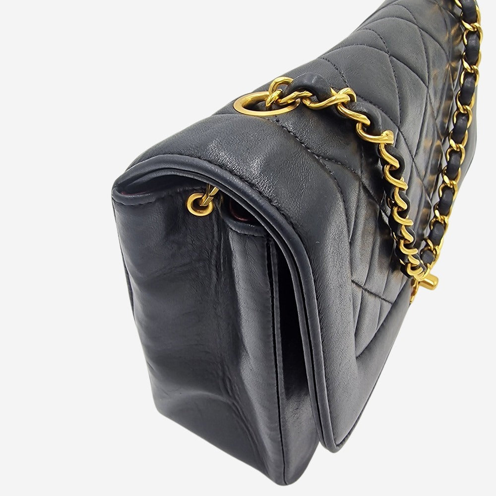 Chanel Diana tasken blev produceret fra 1989 til cirka 1995 og er et eftertragtet fund blandt både vintagejægere og Diana-beundrere. Dette klassiske design blev brugt så ofte af prinsesse Diana, at Karl Lagerfeld følte, at det kun var passende at ære hende i navnet. Chanel Diana tasken blev genoplivet i foråret 2015 kollektionen som Vintage Chic Flap tasken, men den originale vintage Diana taske, står stadig som noget helt særligt. Denne Diana er fremstillet i lækker lammeskindslæder med 24 karat guldbelagt hardware. Kun tasker før 2009 blev fremstillet med ægte guldbelagt hardware. Taskens hovedrum kan indeholde pung, telefon samt nøgler. Derudover har den yderligere 1 indvendig lynlåslomme samt sliplomme.