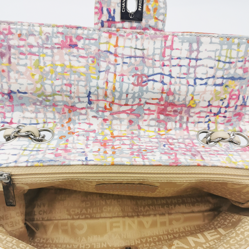 Farverig, elegant og luksuriøs er denne flap bag fra Chanel. Den er lavet af flerfarvet kanvas med et akvarel print og beige læderlinning samt læderflettet kæde. Derudover er tasken tilsat en dekorativ kløverformet charm samt sølv Chanel CC Mademoiselle drejelås. Indvendigt åbner du op til guldfarvet satin interiør med CHANEL navnet indvævet. Denne flap bag kan bruges som både håndtaske, skuldertaske samt crossbody og er ideel til hverdagsbrug, da den rummer de mest nødvendige hverdagsfornødenheder, såsom pung, telefon, solbriller samt nøgler.