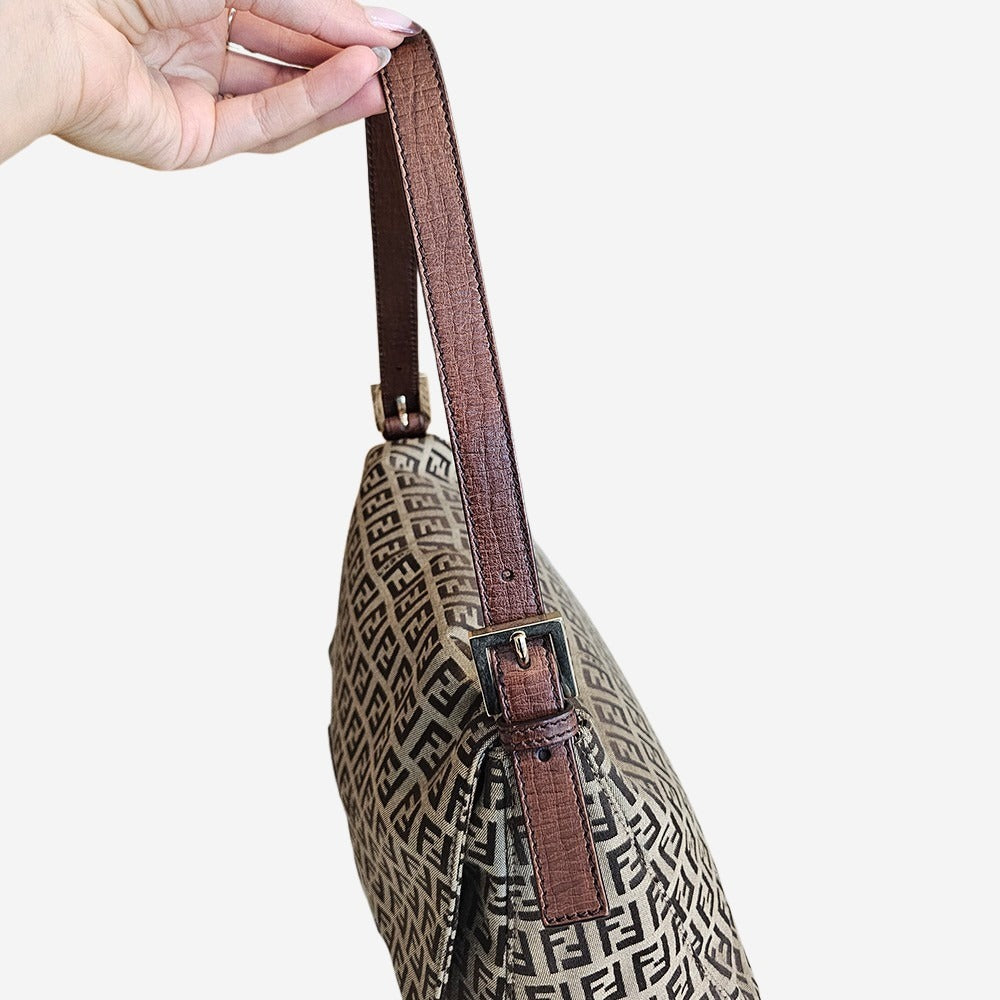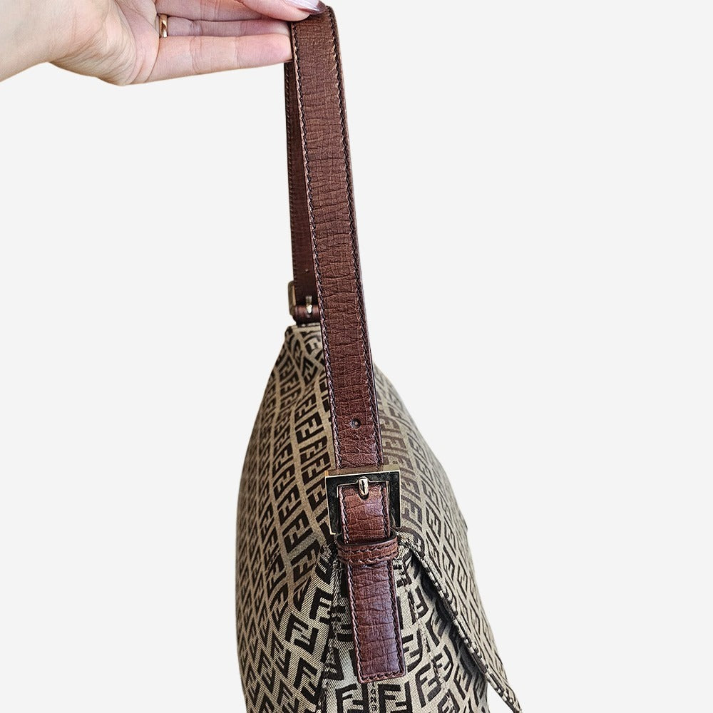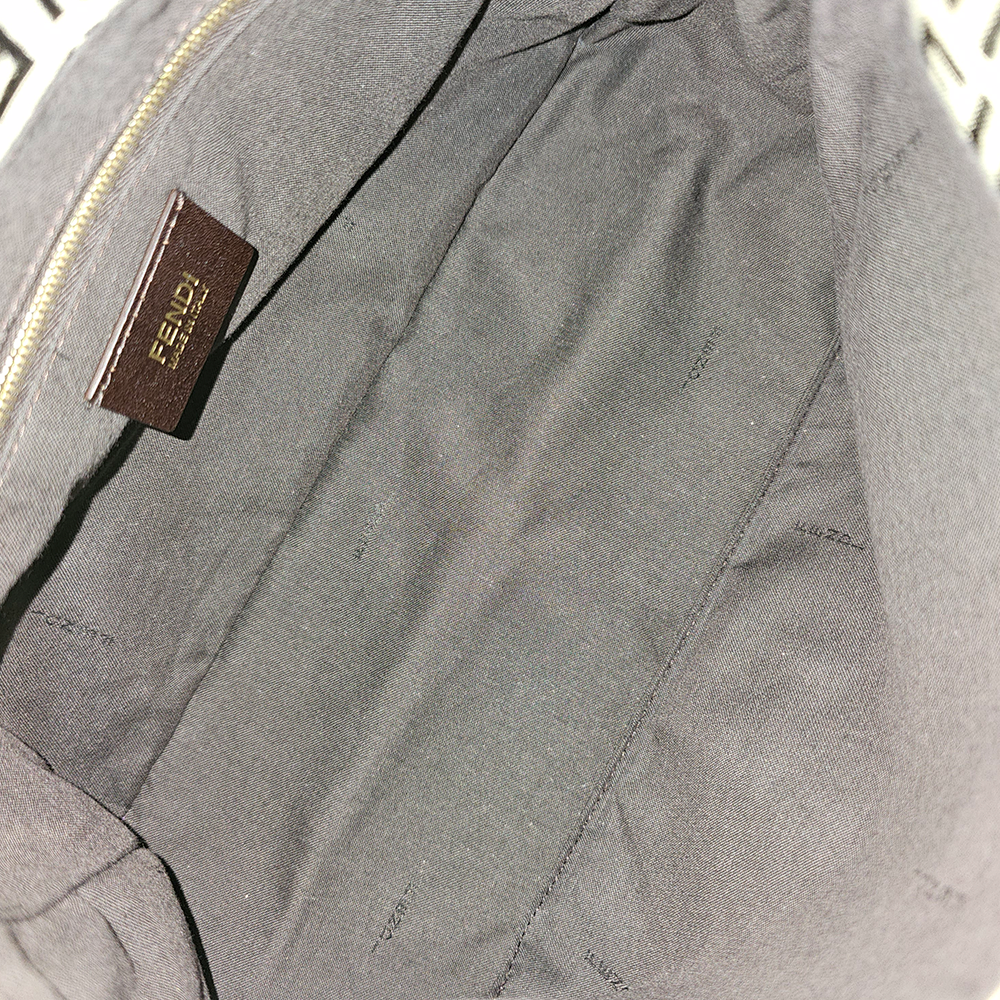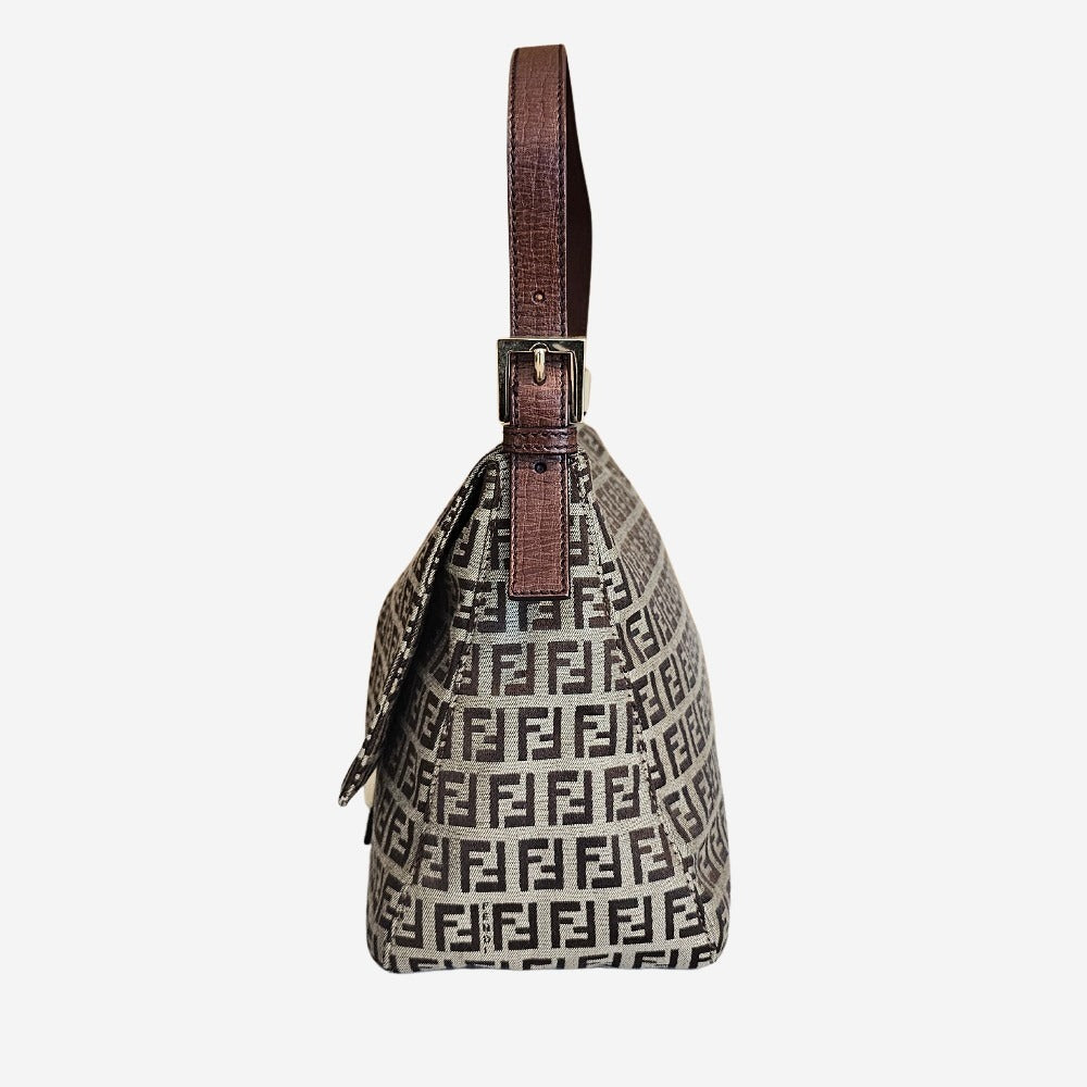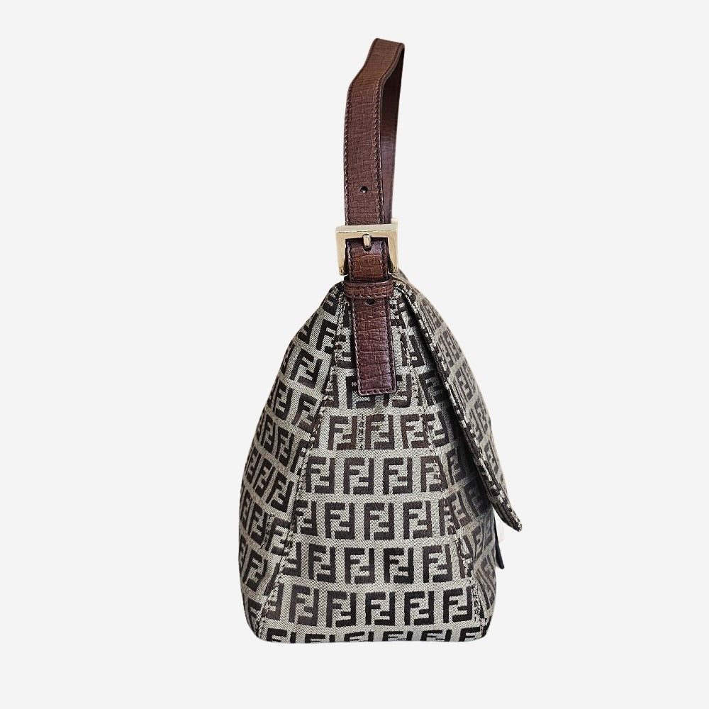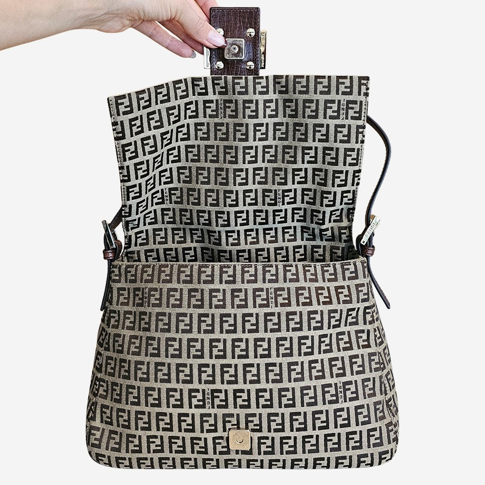 Den ikoniske Baguette fra Sex and the City er tilbage. Fendi’s Baguette var den første ‘IT bag’ tilbage i 90’erne, og som Carrie sagde det: "It's not a bag. It's a Baguette". Fendi Baguette er det ultimative vintage design. Denne Baguette er Mamma udgaven som er nummeret større end den rektangulære almindelige baguette taske. Den er fremstillet i deres populære brune canvas med deres signatur Zucca monogram. Derudover læderrem i brun samt guld hardware. Tasken har 1 hovedrum samt en indvendig lomme som lukkes med lynlås. Tasken rummer pung, telefon, solbriller, nøgler, makeup pung mm. Taskens rem kan justeres og er aftagelig. Der kan derfor tilsættes længere rem hvis tasken evt. skal bruges som crossbody.
